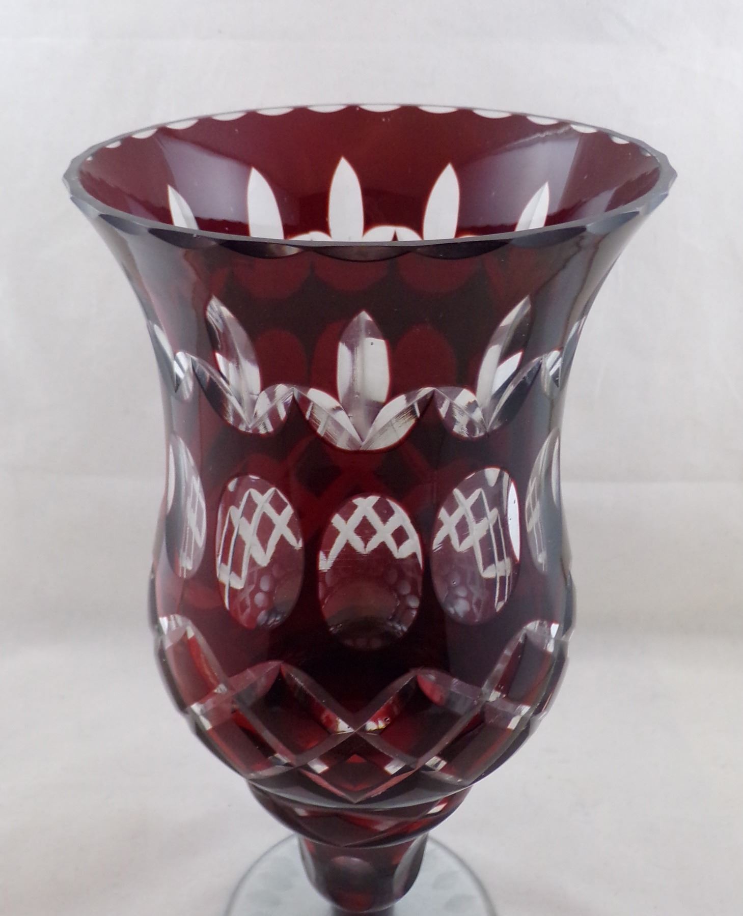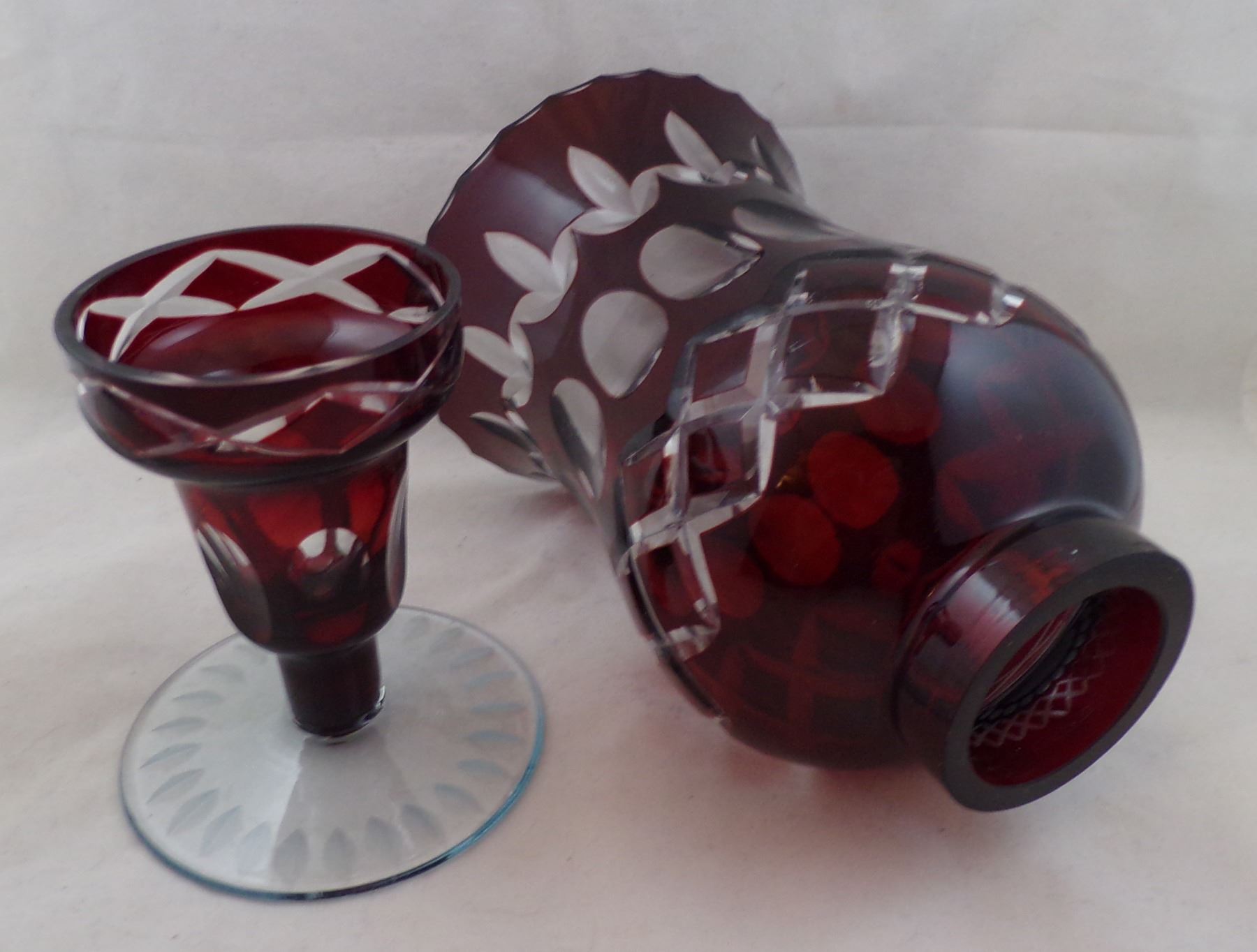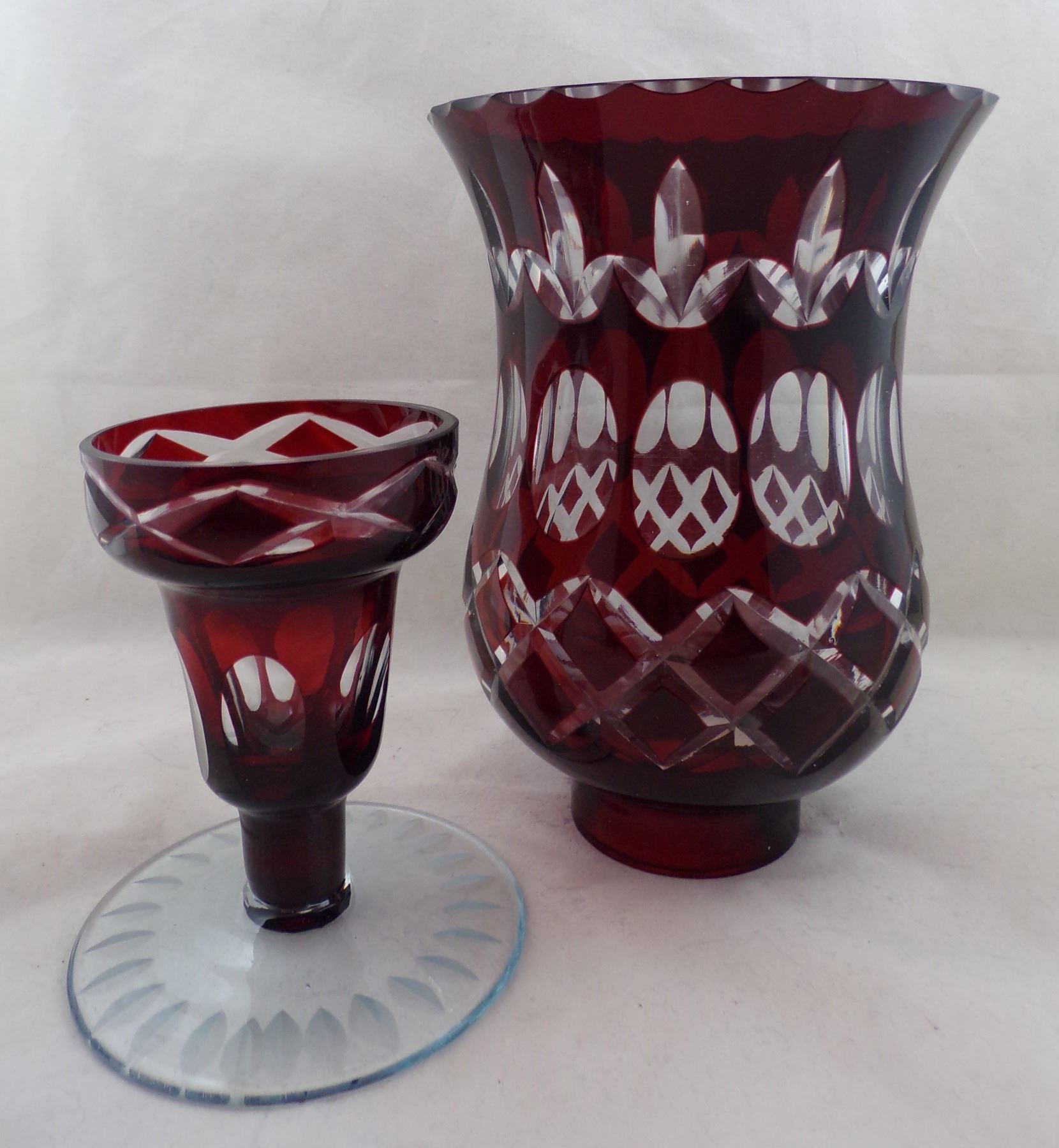 Vintage Bohemian Ruby Cut to Clear Glass Vase or Candleholder, measures 9.75''H x 4.5''D with a base of 3.5''D, two pieces, beautiful glass