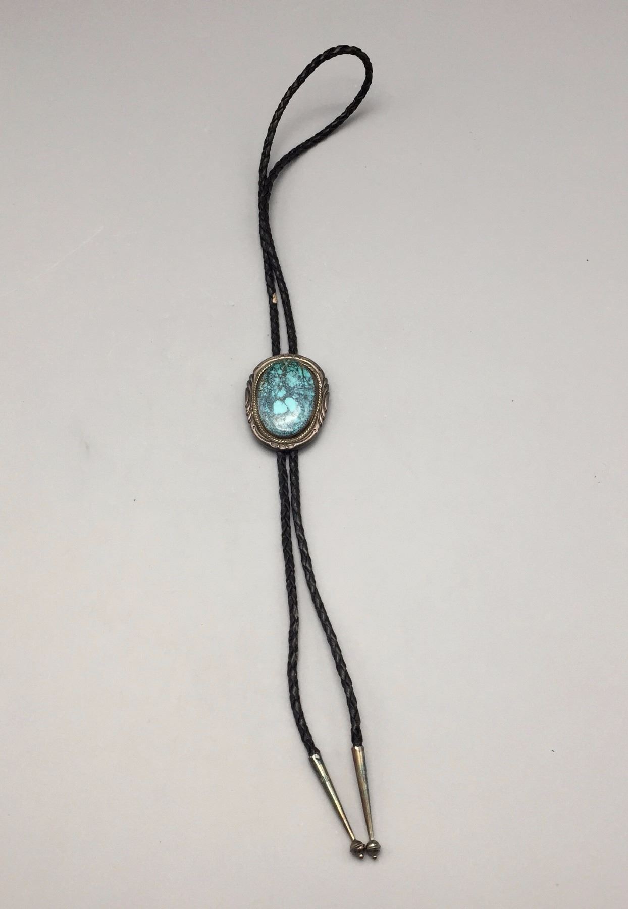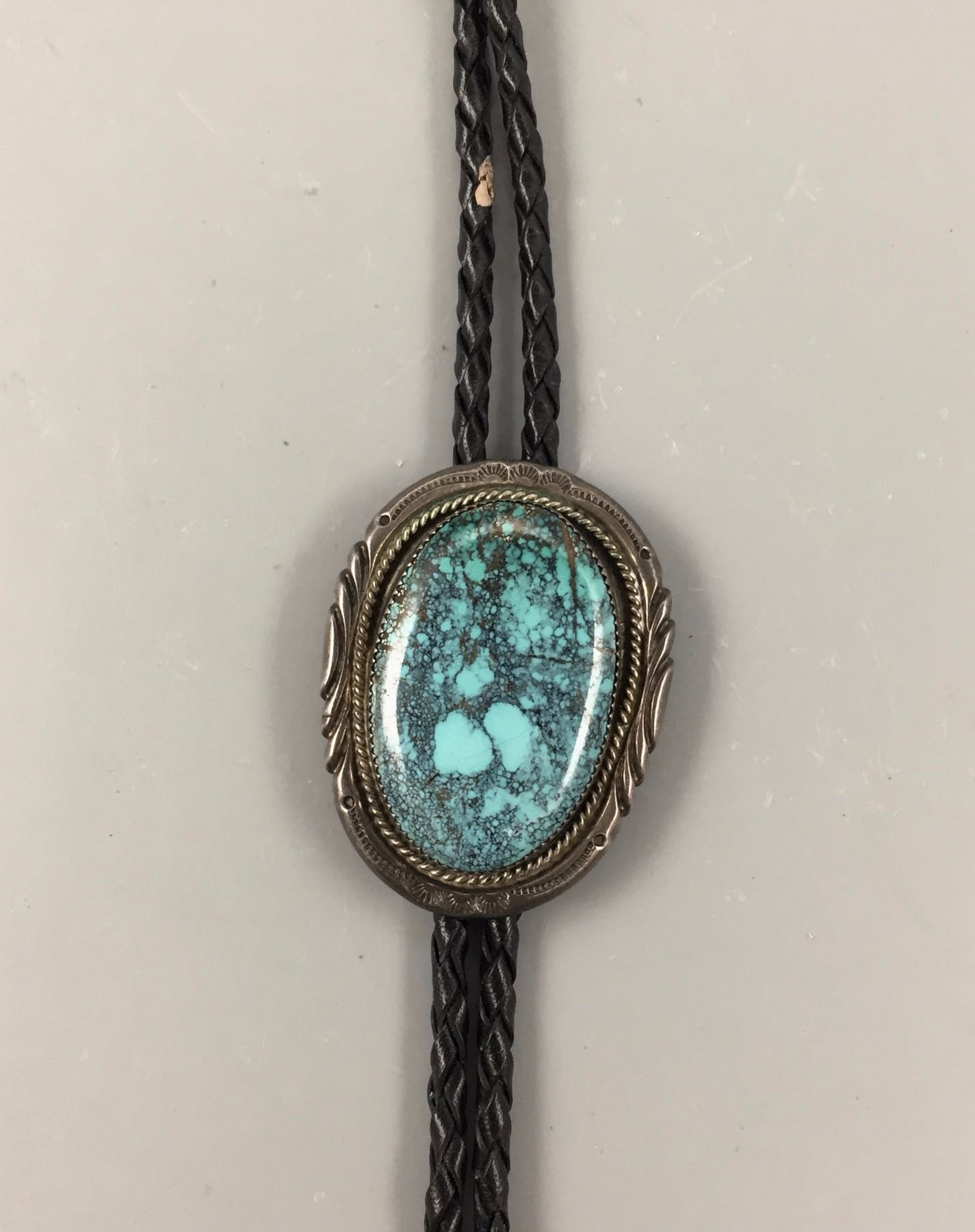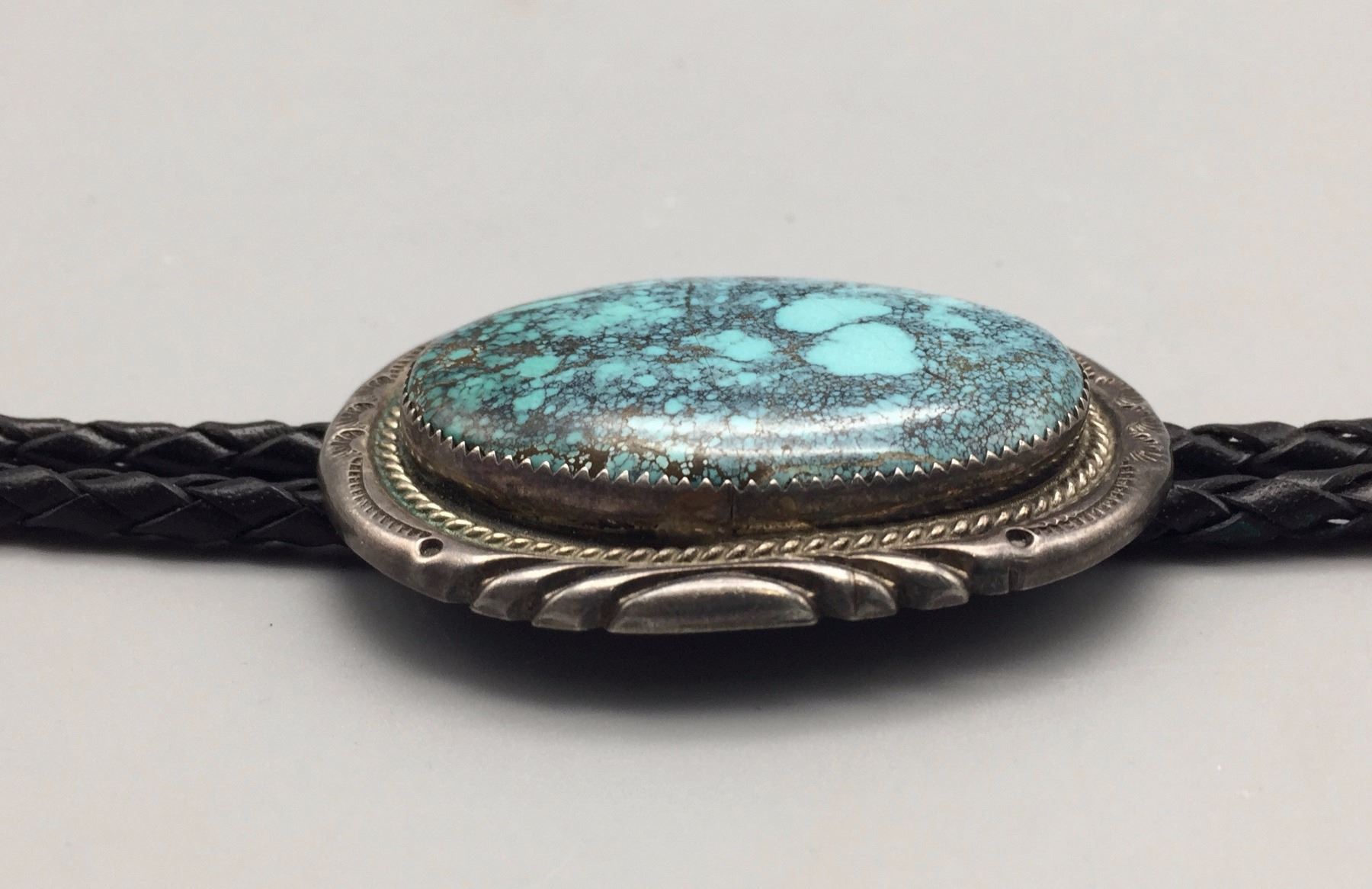 Maker: Unmarked, Navajo in style. Approx. Age: Vintage (Circa 1970s). Size: Slide is 1 3/4” at its widest x 2 1/2” tall on a 32” braided leather cord. Weighs 54.3 g. Additional Info: Vintage Bolo with nice spiderweb turquoise, set in hand-stamped/hand-embellished sterling silver. Tested as sterling silver. Condition: Good for it’s age, normal wear expected. Please look closely at the pictures - they are an important part of our description. Shipping: There will be a $5 handling / packaging fee for shipping this lot. The actual cost of postage will be added on top of that.