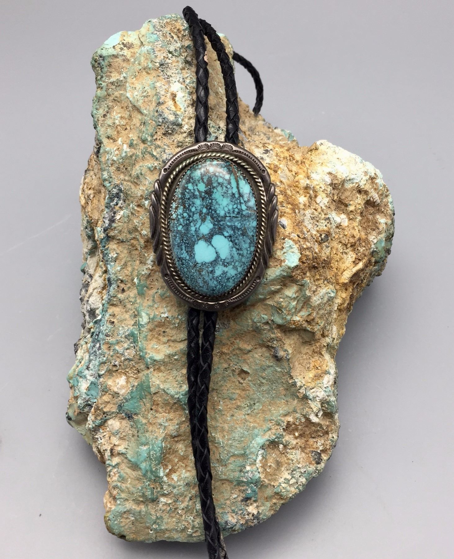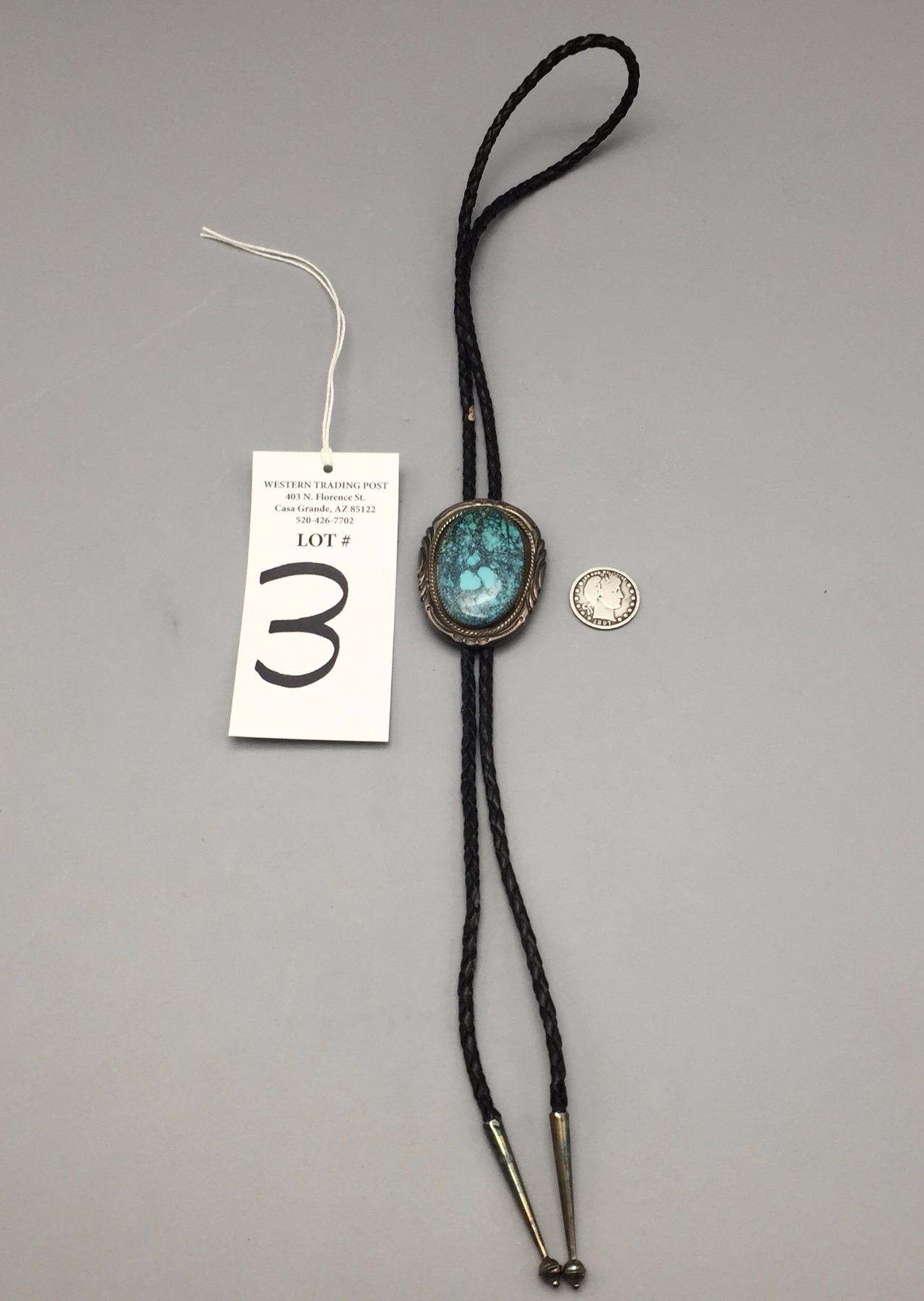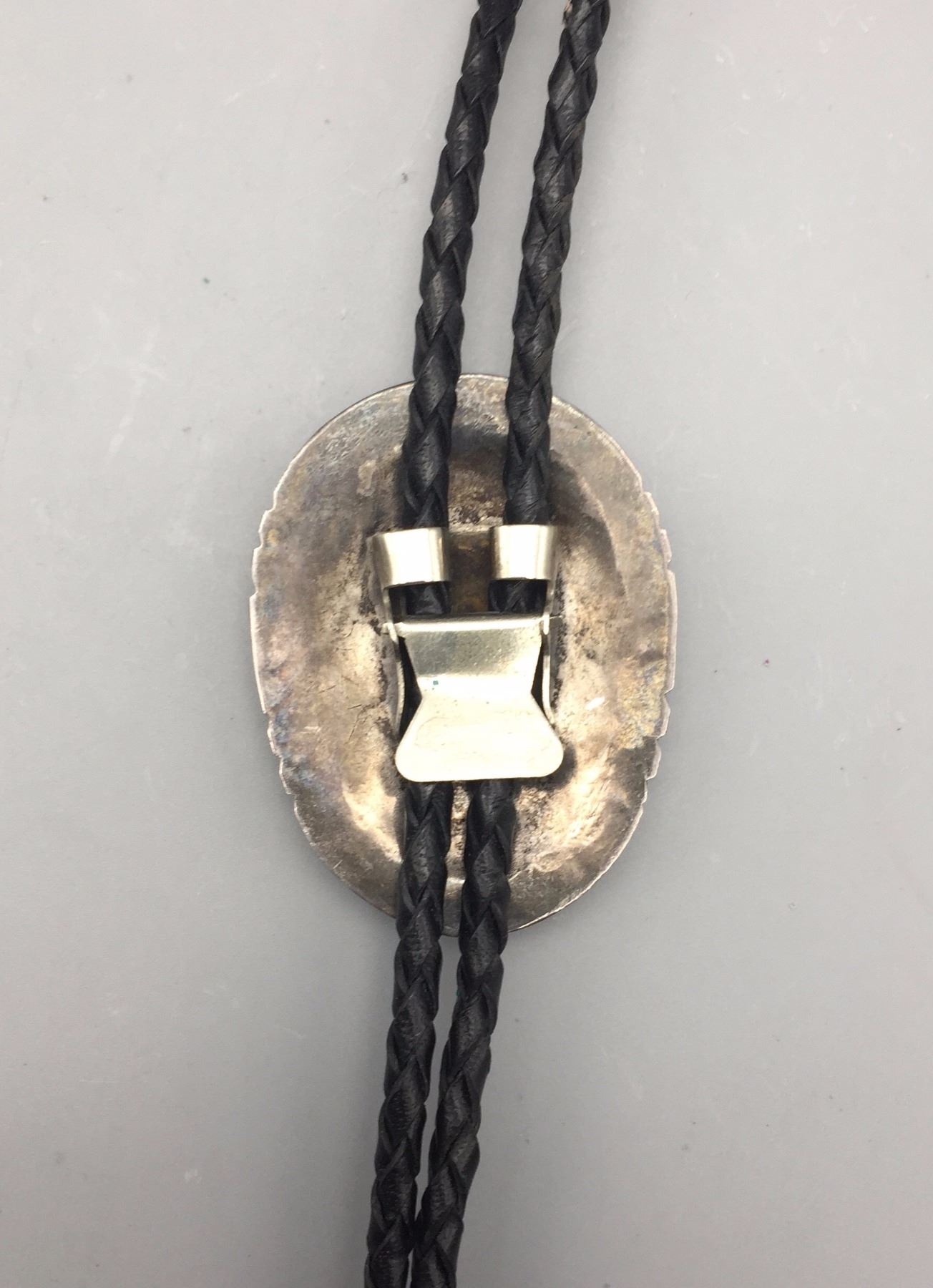Maker: Unmarked, Navajo in style. Approx. Age: Vintage (Circa 1970s). Size: Slide is 1 3/4” at its widest x 2 1/2” tall on a 32” braided leather cord. Weighs 54.3 g. Additional Info: Vintage Bolo with nice spiderweb turquoise, set in hand-stamped/hand-embellished sterling silver. Tested as sterling silver. Condition: Good for it’s age, normal wear expected. Please look closely at the pictures - they are an important part of our description. Shipping: There will be a $5 handling / packaging fee for shipping this lot. The actual cost of postage will be added on top of that.