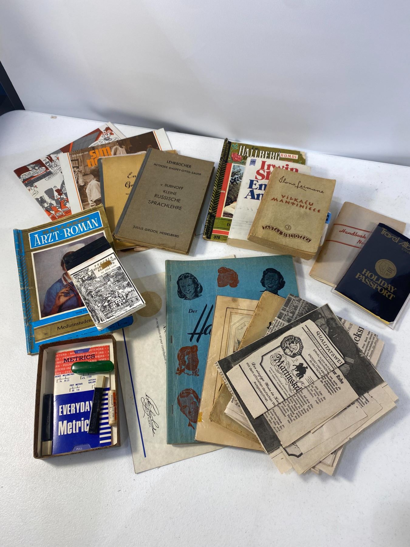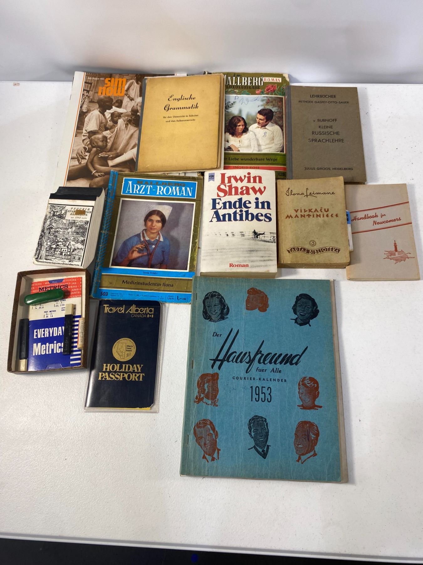 Mixed lot of vintage books including grammar, medical, fiction, language study, and 1953 calendar book. Approx. mid-century. Condition: age wear.