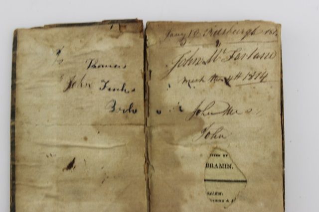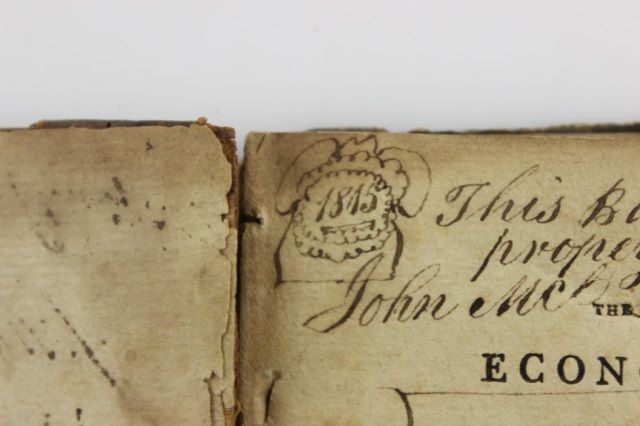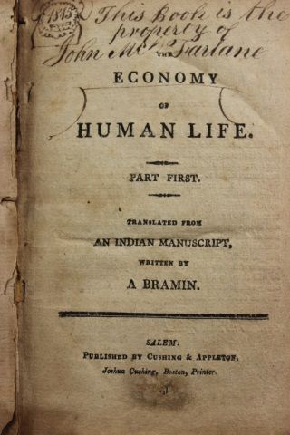 Vintage hardback book dated 1814 titles "The Economy of Human Life" by A. Bramin. Translated from an Indian manuscript, 144 pages. Binding and pages are very worn.