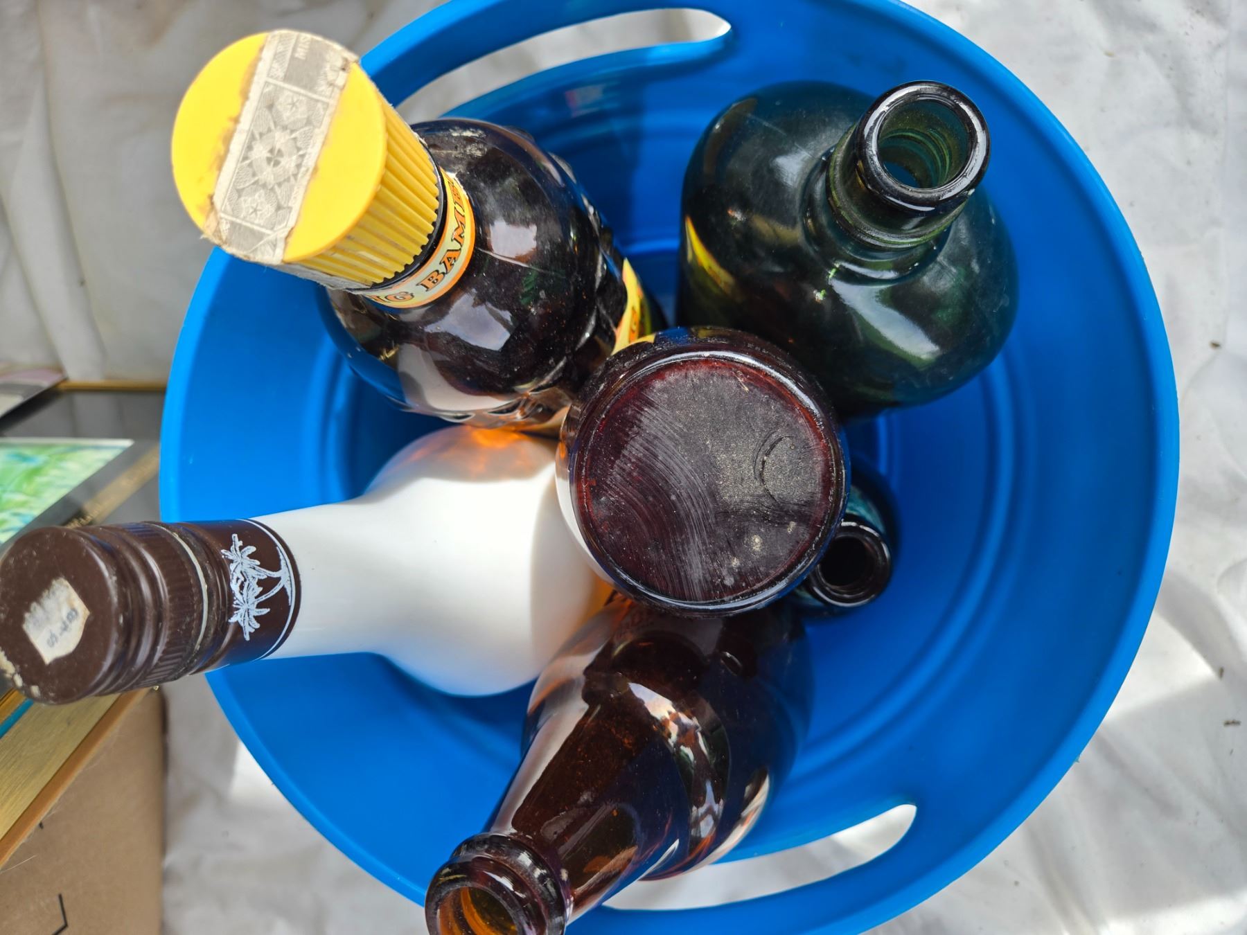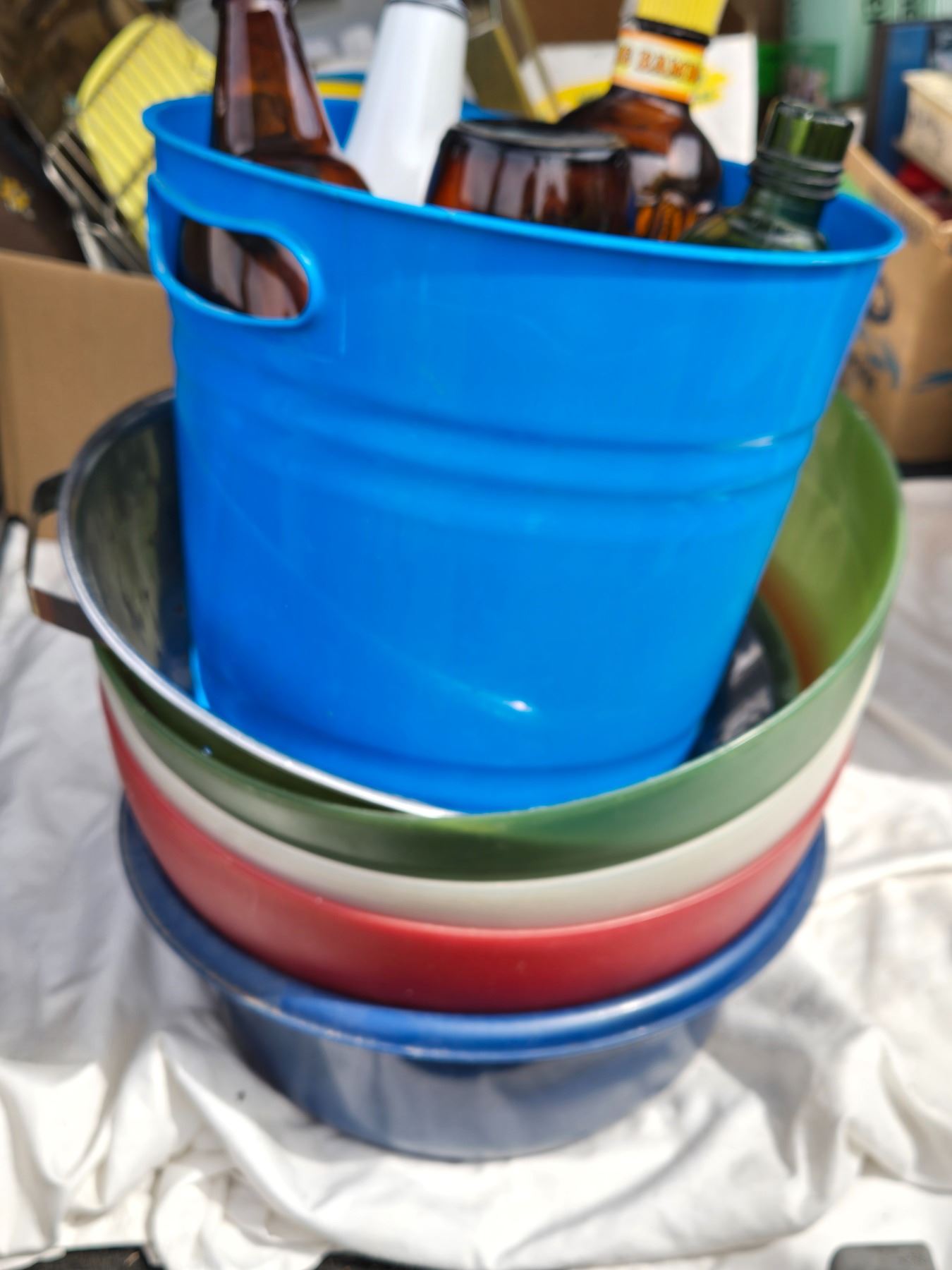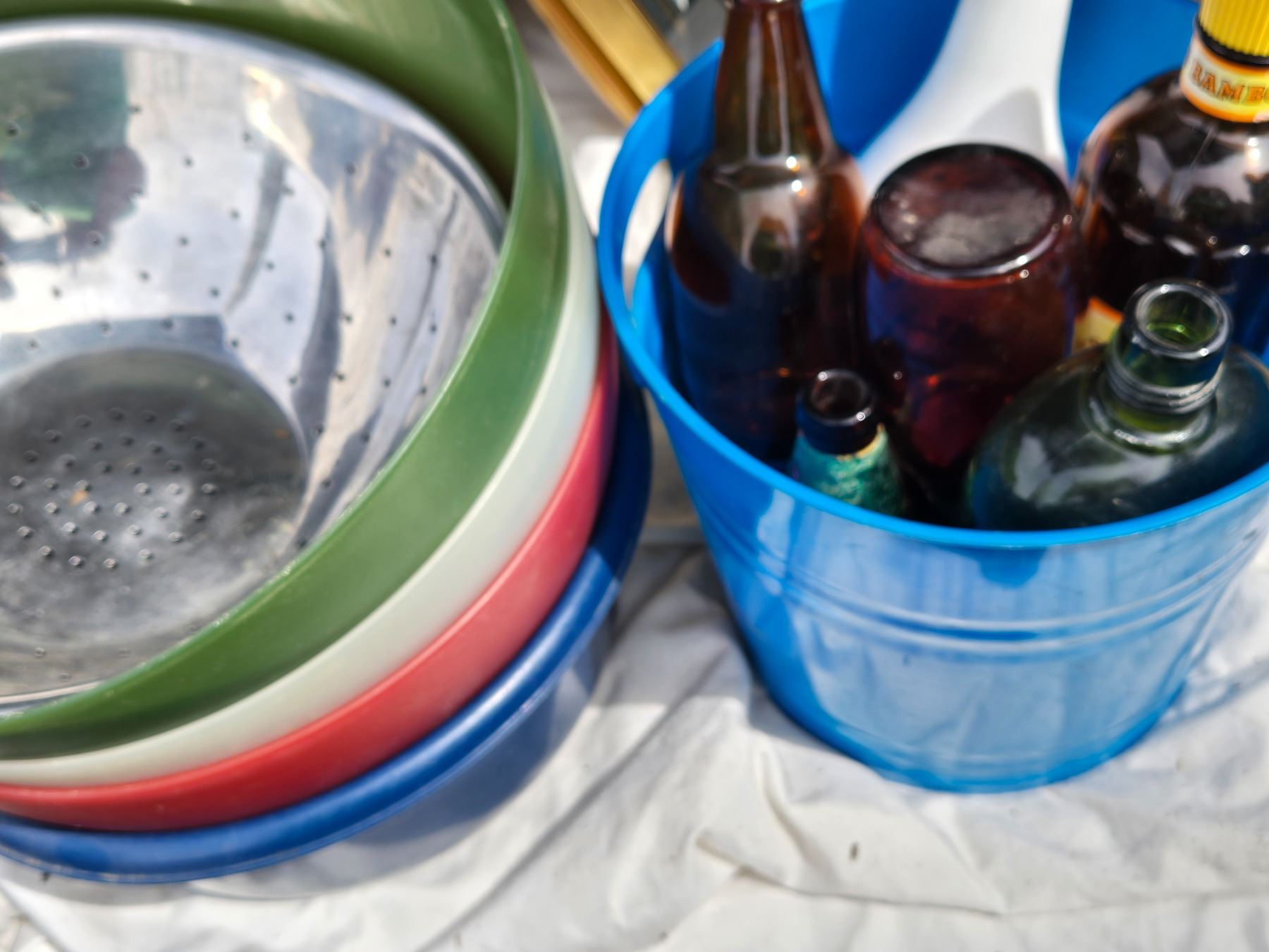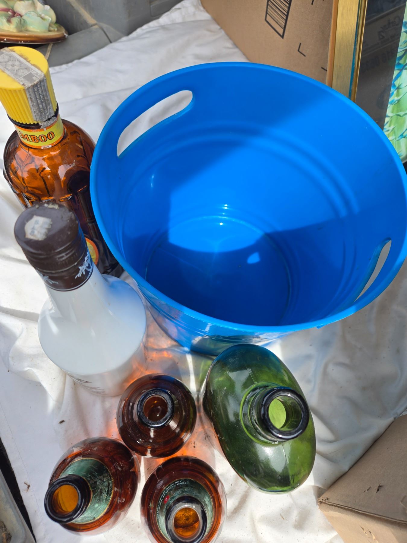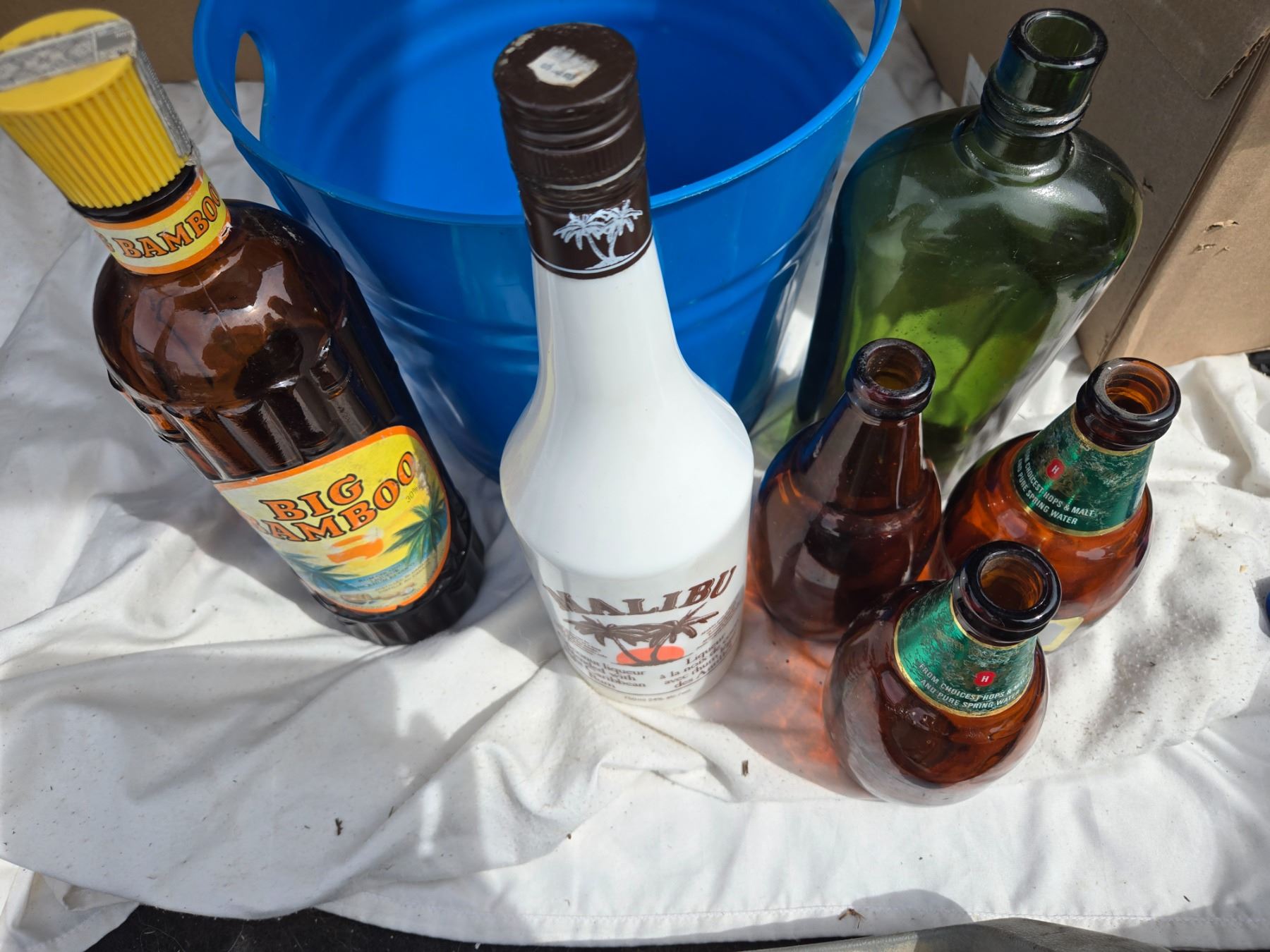Vintage Bowls, Small Garbage Can, Vintage Booze Bottles