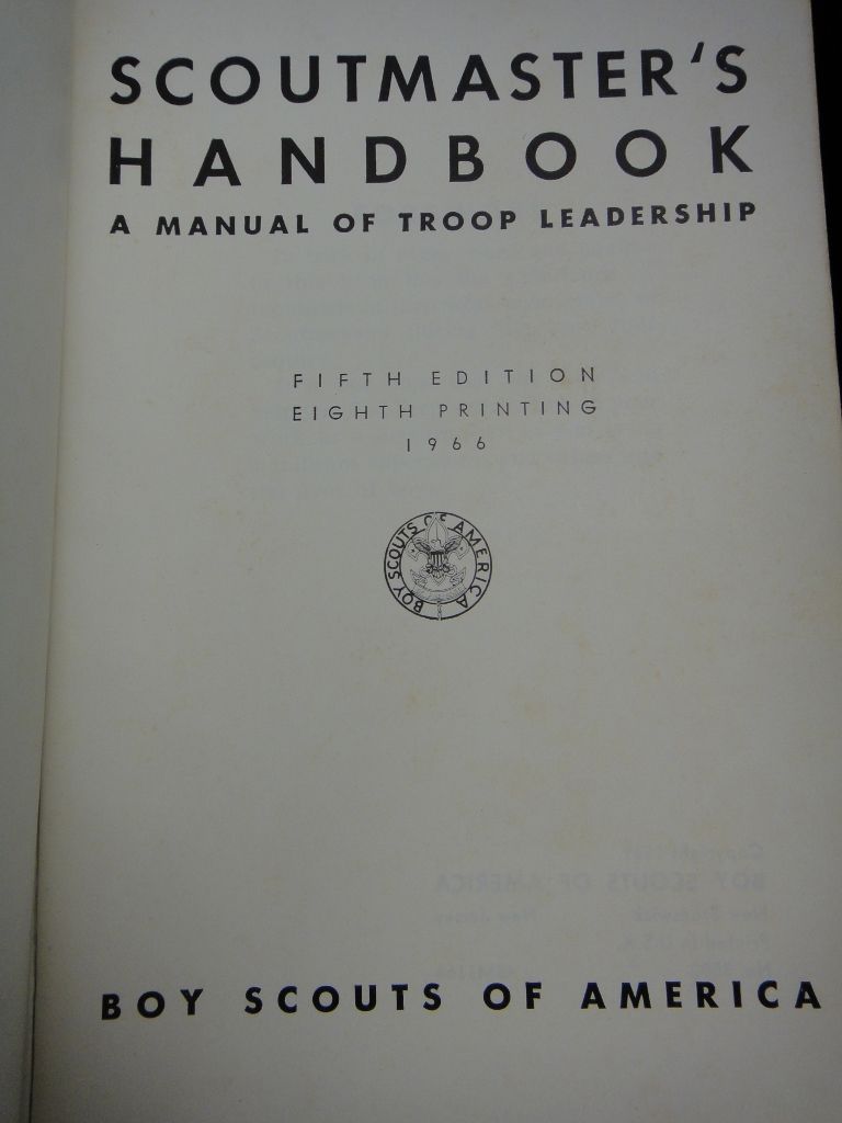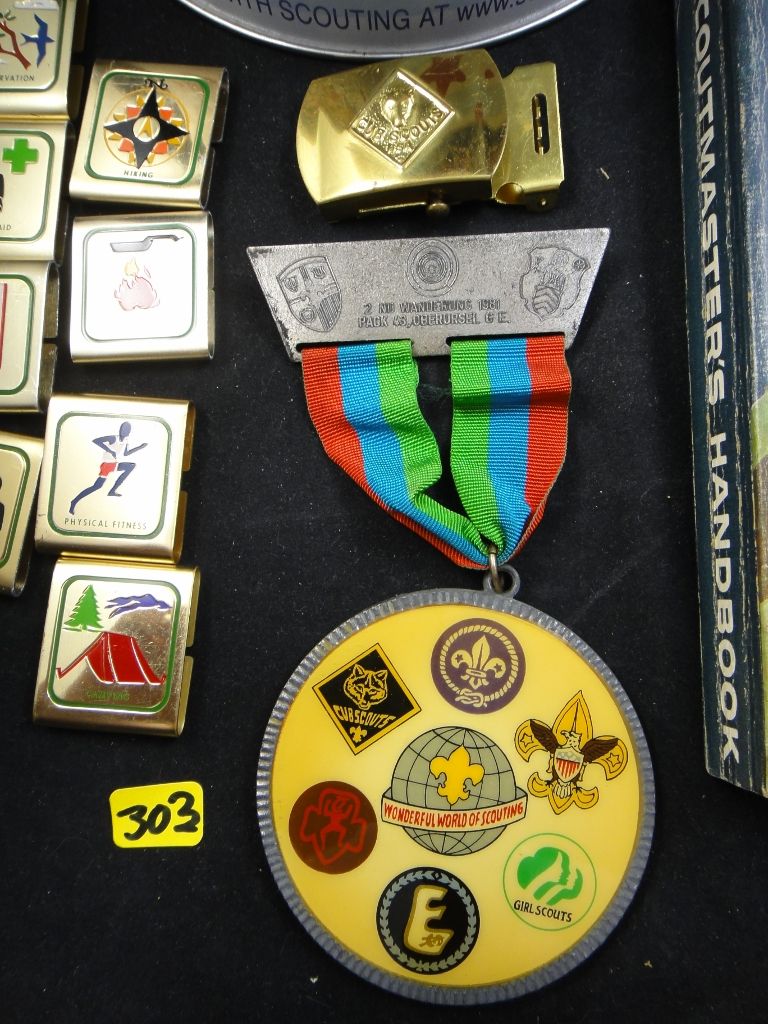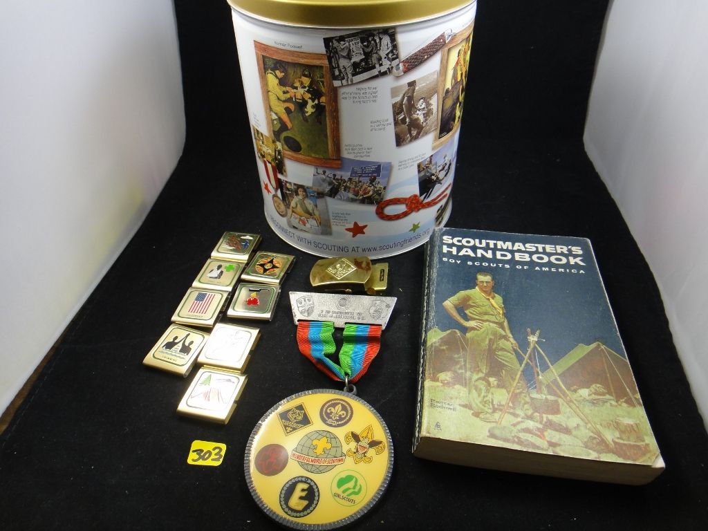 Includes 1960s Scoutmaster's Handbook along with a large medal, buckle, slides and large tin container.