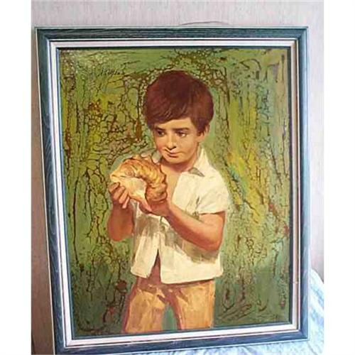 <tr><td>Title:Vintage Boy & Seashell Painting By W.Cottens</td></tr>