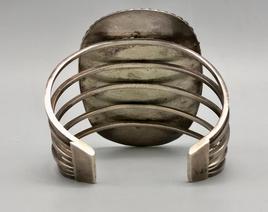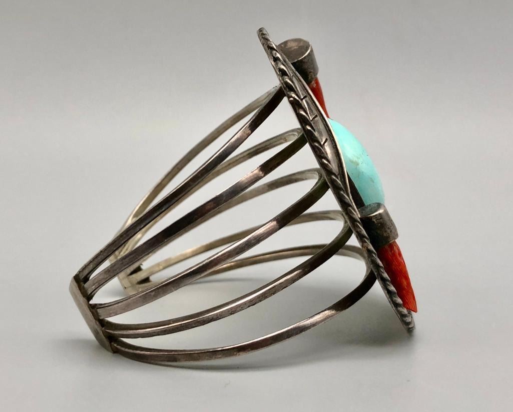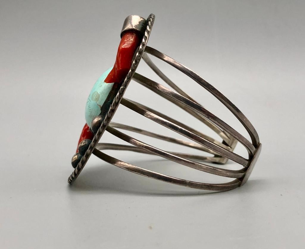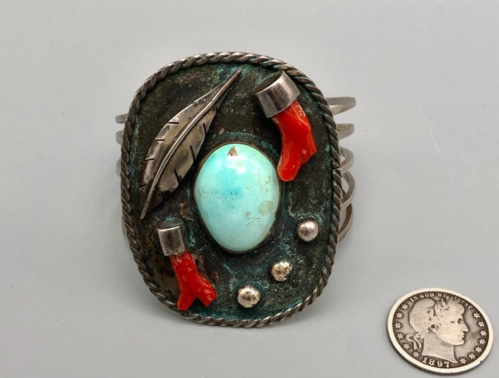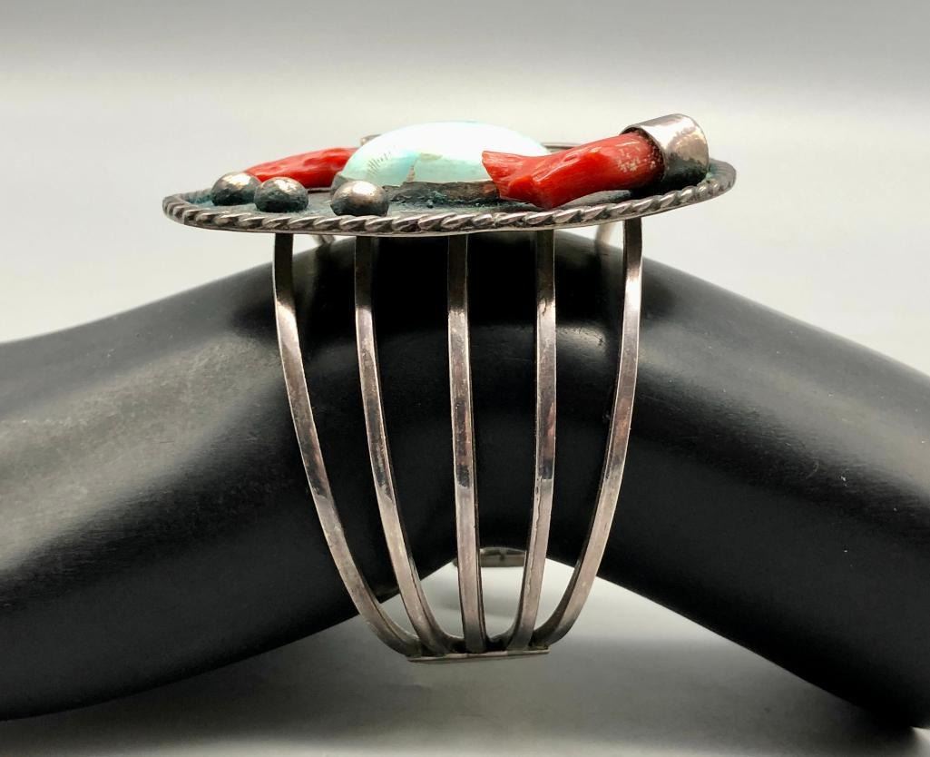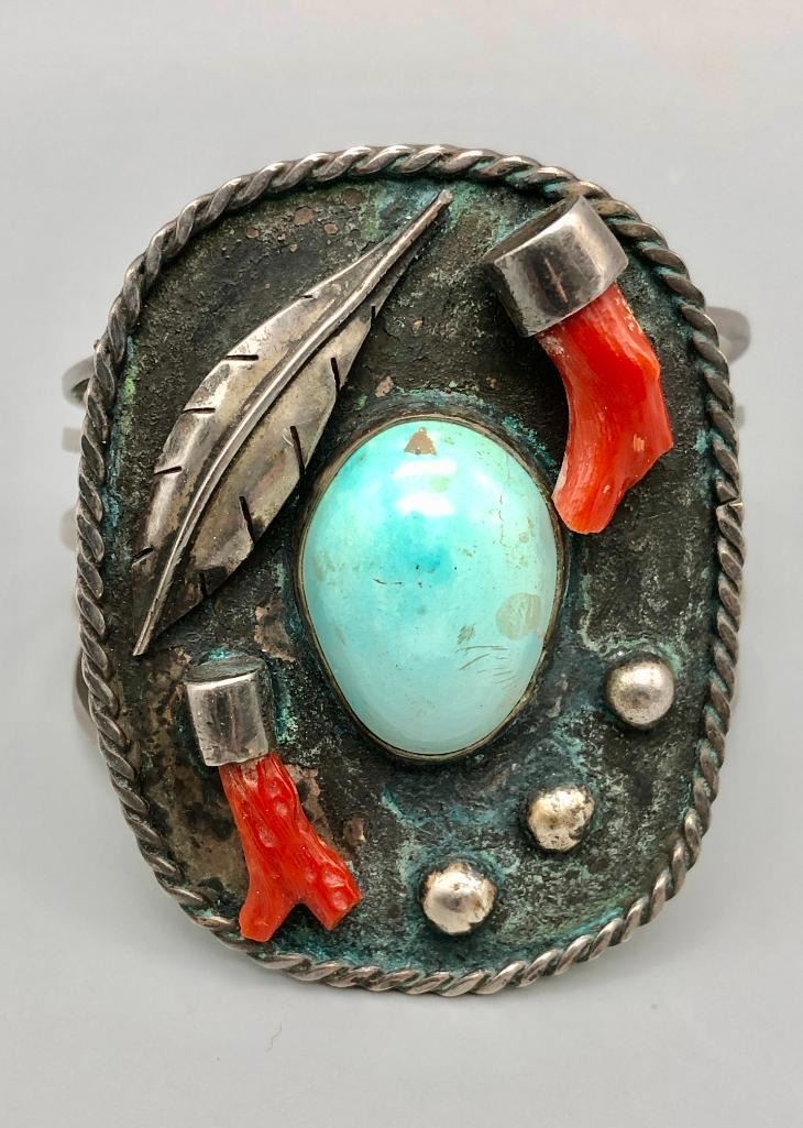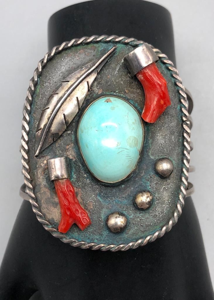 Presented for sale in this lot is a vintage branch coral and turquoise bracelet. This great bracelet is set with a lovely light blue turquoise cabochon and two branch coral pieces. A cool silver plate with leaf applique and silver dots showcase the settings beautifully and are on a five wire terminal. It is sterling silver and will go with most anything. MAKER/ARTIST: Unmarked. APPROX AGE: Circa 1970s. SIZE: Inside circumference measures 5-1/2 inches long. Opening is an additional 1-1/8 inches, fitting a 6-5/8 inch wrist. Width is 2-1/2 inches. Weighs 57 grams. CONDITION: Good for its age, normal wear expected. Please look closely at the pictures as they are an important part of our description and are hereby incorporated into the description, specifically with regards to condition. SHIPPING: There will be a $5 handling / packaging fee for shipping this lot. The actual cost of postage will be added on top of that. BUY IT NOW: If you would like to buy this item now, without waiting for the auction day to bid on it, we do offer this option (which is available up to 48 hours before the actual auction starts). The “Buy it Now†price is the high estimate of this lot (plus applicable fees and the Buyer's premium is discounted to 10% when using the Buy it Now option). If you would like to exercise this option, you must contact us by email (or phone as long as you talk to someone live). Reference this lot number and your intention to "Buy it Now."
