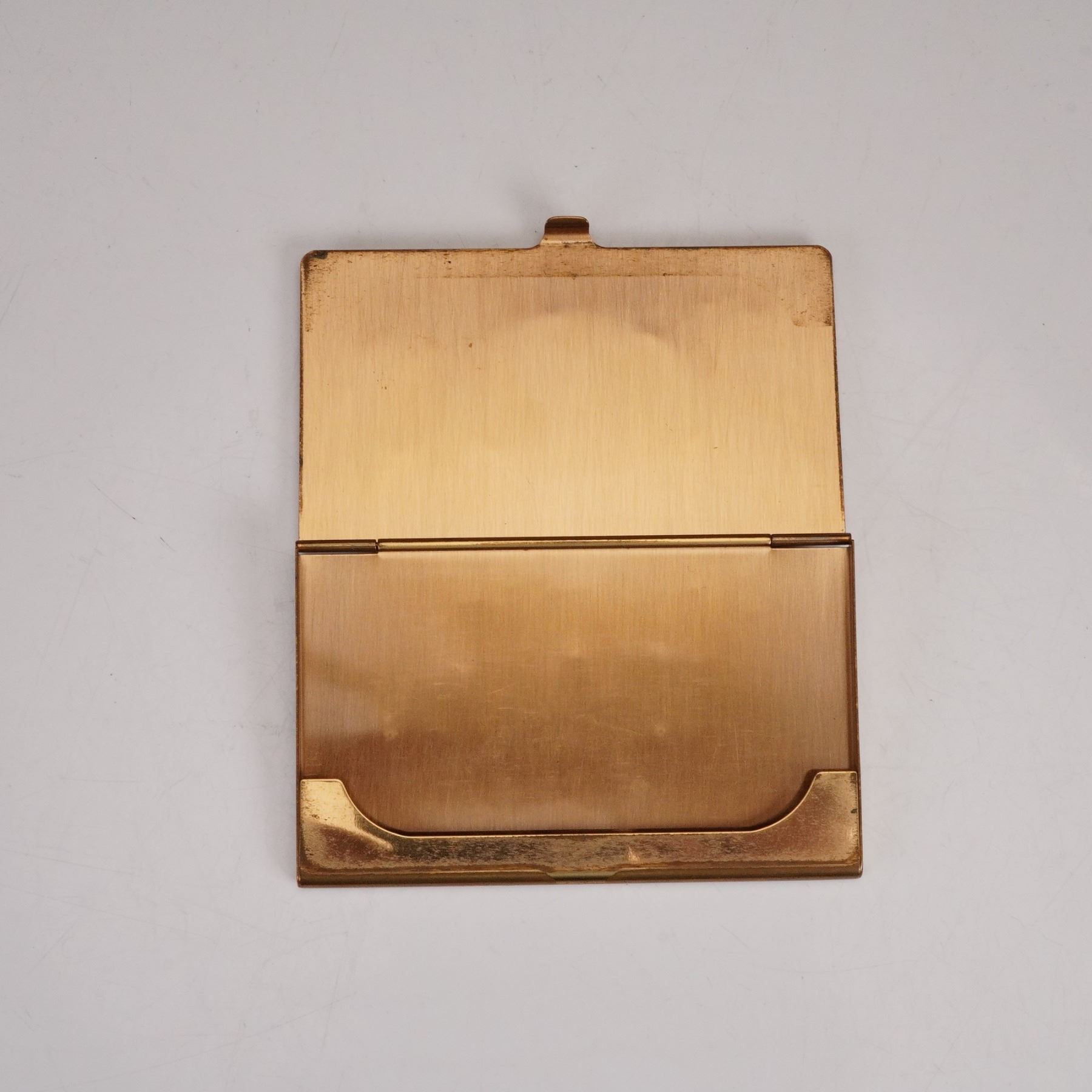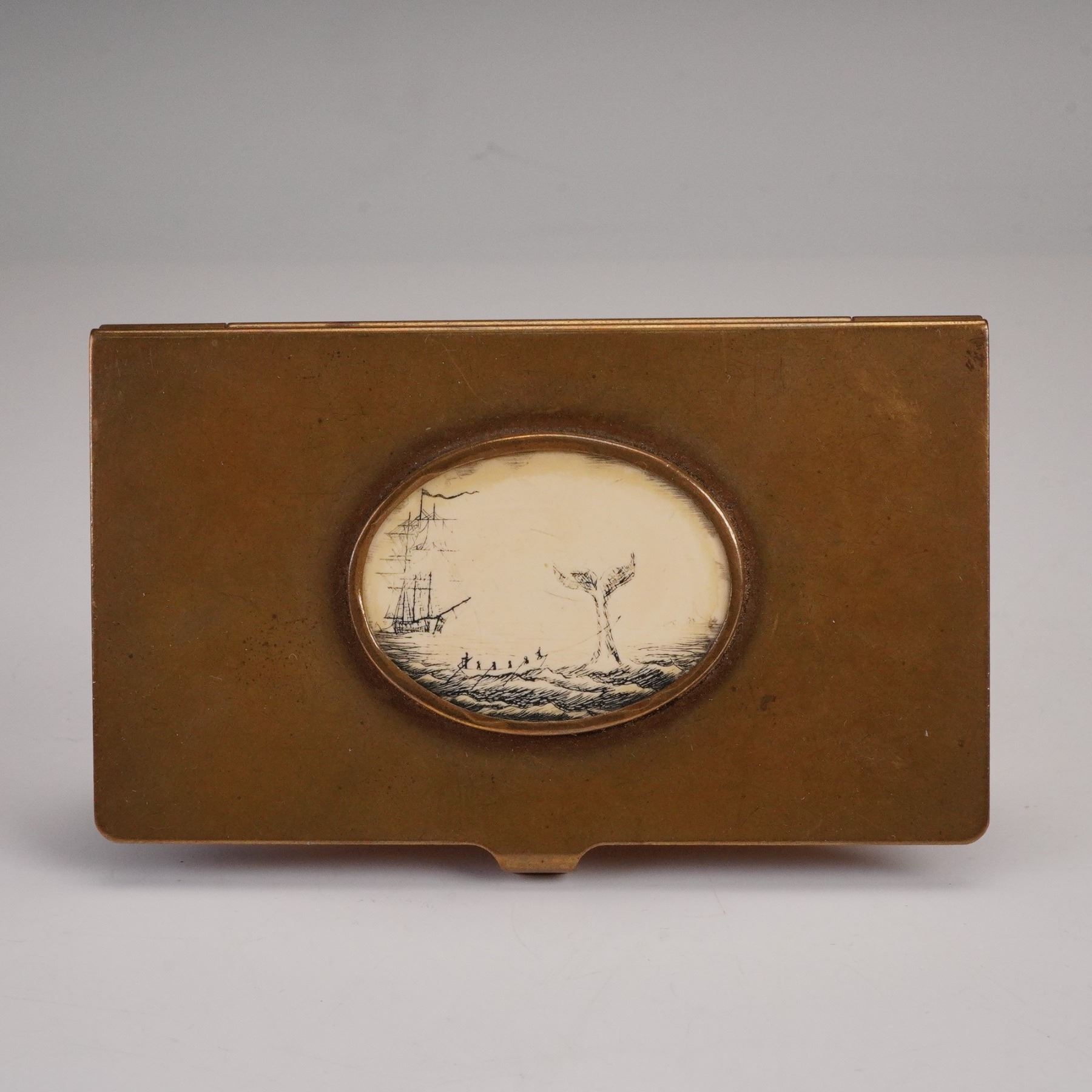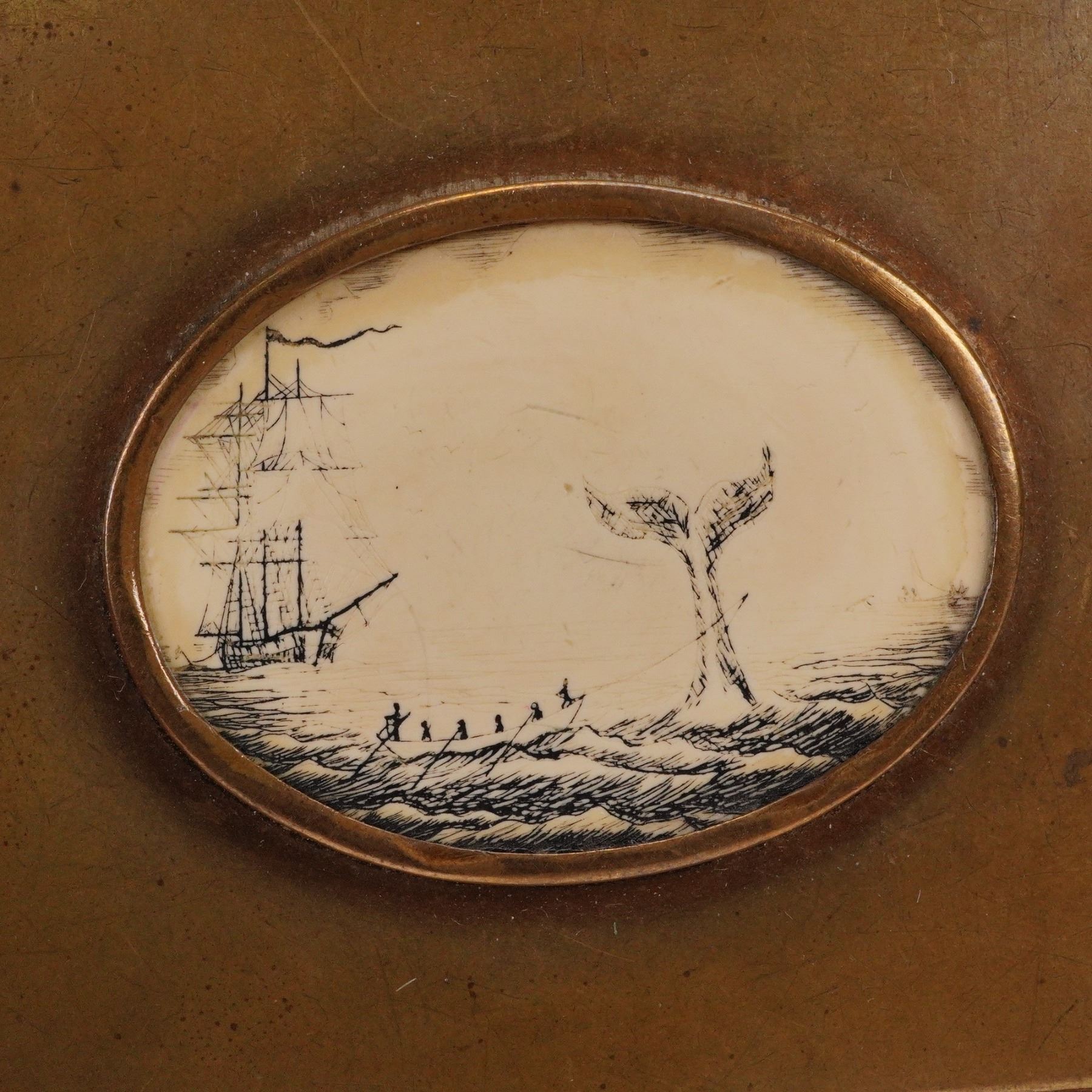 This vintage brass card case features a mounted oval scrimshaw-style plaque depicting a classic maritime whaling scene, with a tall ship, a whaleboat crew, and the flukes of a whale breaching above the waves. The etched detailing is finely rendered, capturing the drama and artistry associated with nautical scrimshaw traditions. The case opens to reveal a compartment for cards, with a brushed brass interior. Exhibiting warm patina and light wear consistent with age, this piece blends utility with maritime heritage, making it both a functional accessory and a collectible for lovers of nautical history.