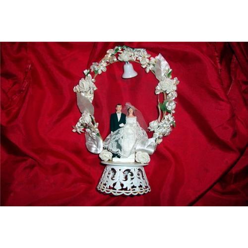 Dated on the bottom, Levin Novelty and Import Co. 1958, also in someones hand writing 1954 L. The cake topper is not plastic, but I think it is celluloid, the bell is bakelite, and the bride and groom are ceramic. The flowers are silk. These older cake toppers have gotten hard to come by, it has been a long time since I had one this old. The piece measures 10 inches tall and 7 inches wide, the bride and groom are 4 inches tall. Thank you for shoppin in the Land of Enchantment!