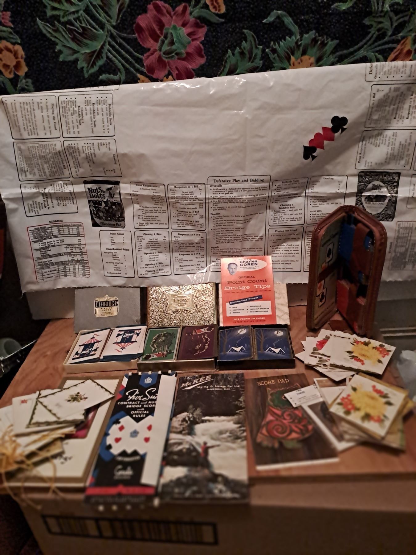 Vintage Bridge items including cards, instructions, tally sheets and more