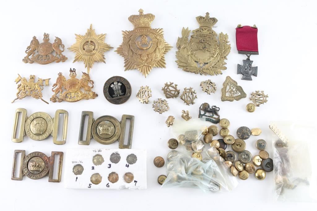 Lot containing a bag of vintage British military button, all maker marked, various regiments, about 60. Lot of 7 helmet Plates/cap badges, a couple of collar devices, and three brass staple belt buckles, Ww1 era "Dieu Et Mon Droit" with lion over crown, one with crown, and one 1800's "Nil. Desperandum" "Victoria". Victoria was a mining town in New South Wales, Australia. This was a Police, or Militia buckle. Also includes a replica Victoria Cross. From the Joe Musso Collection.