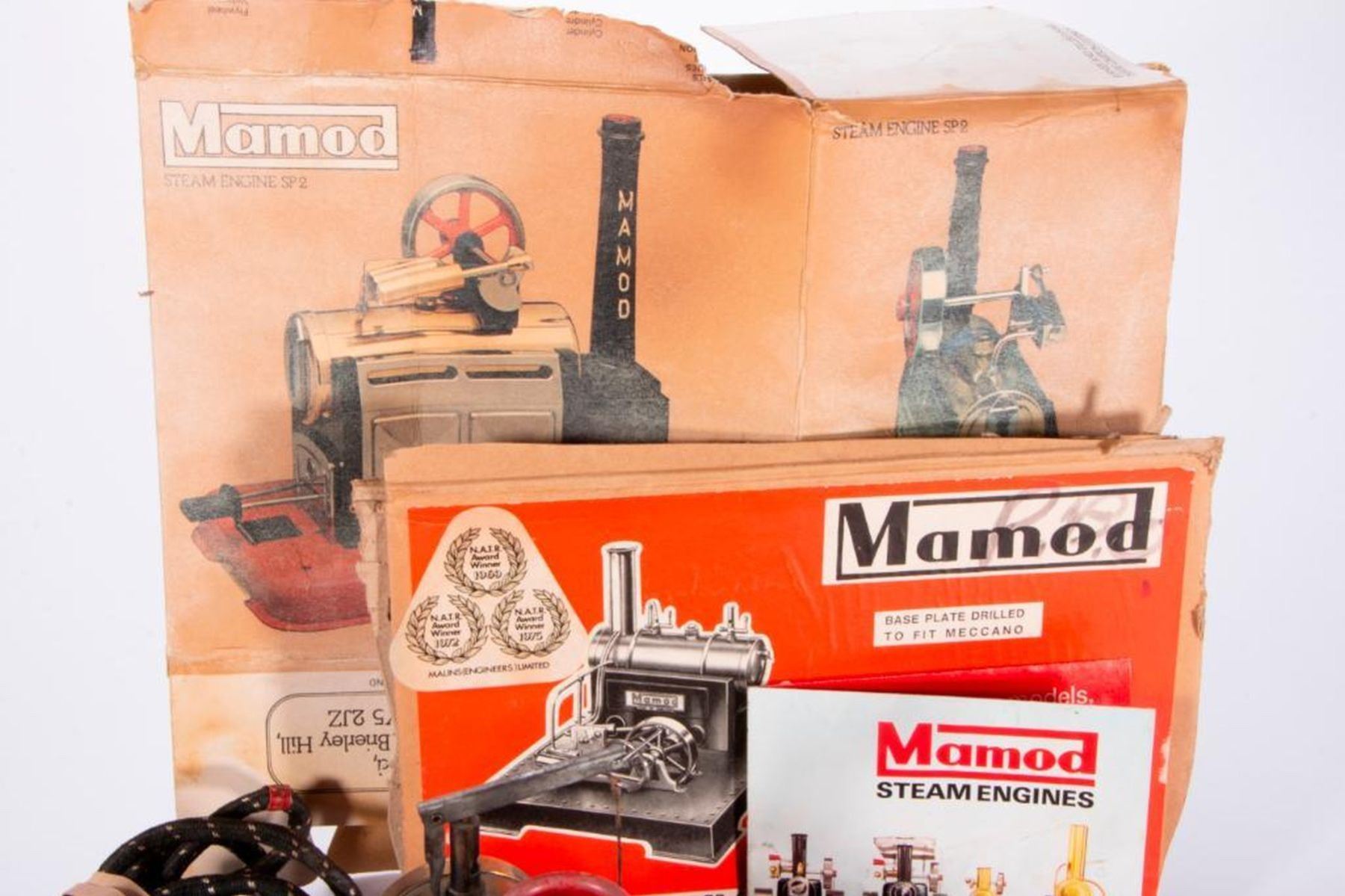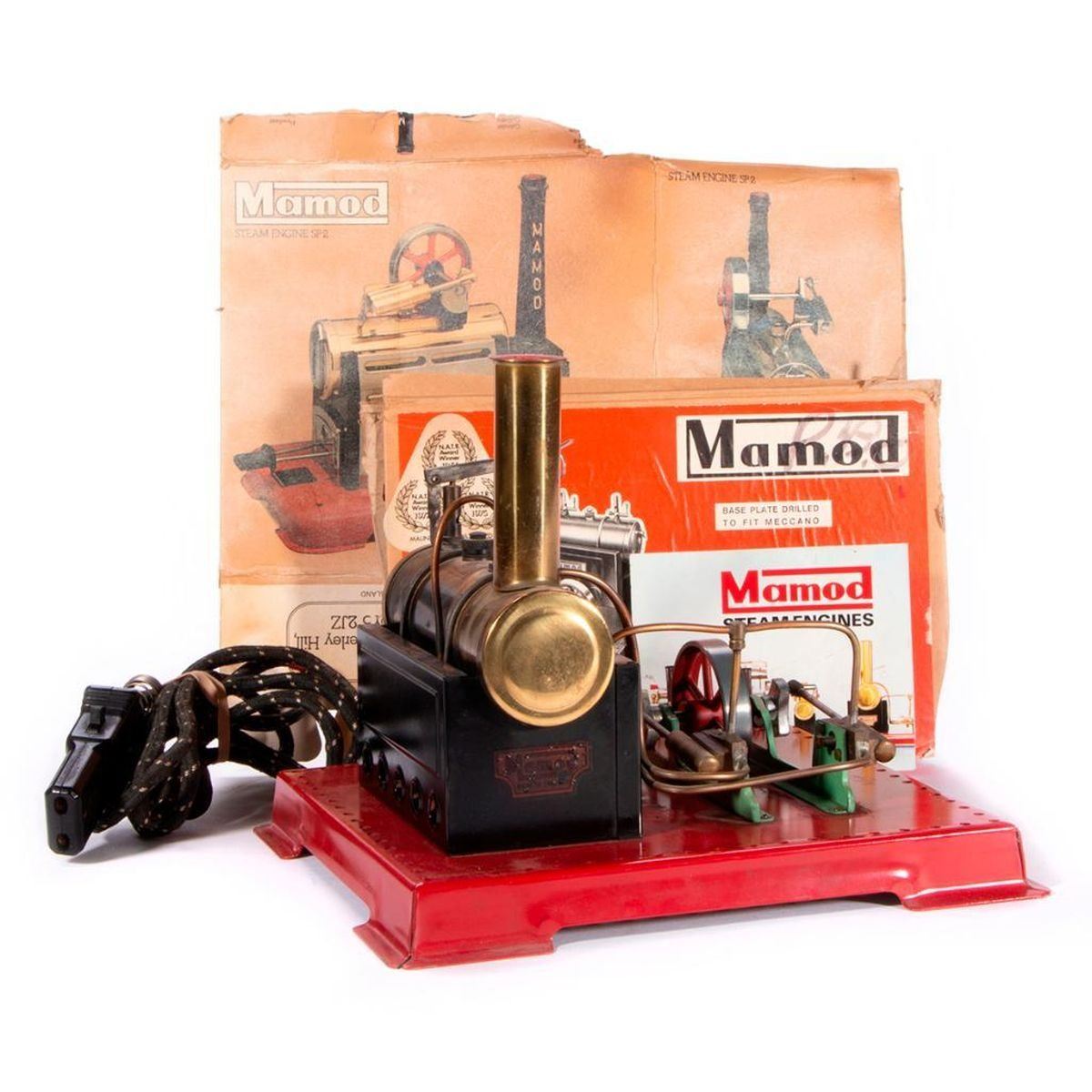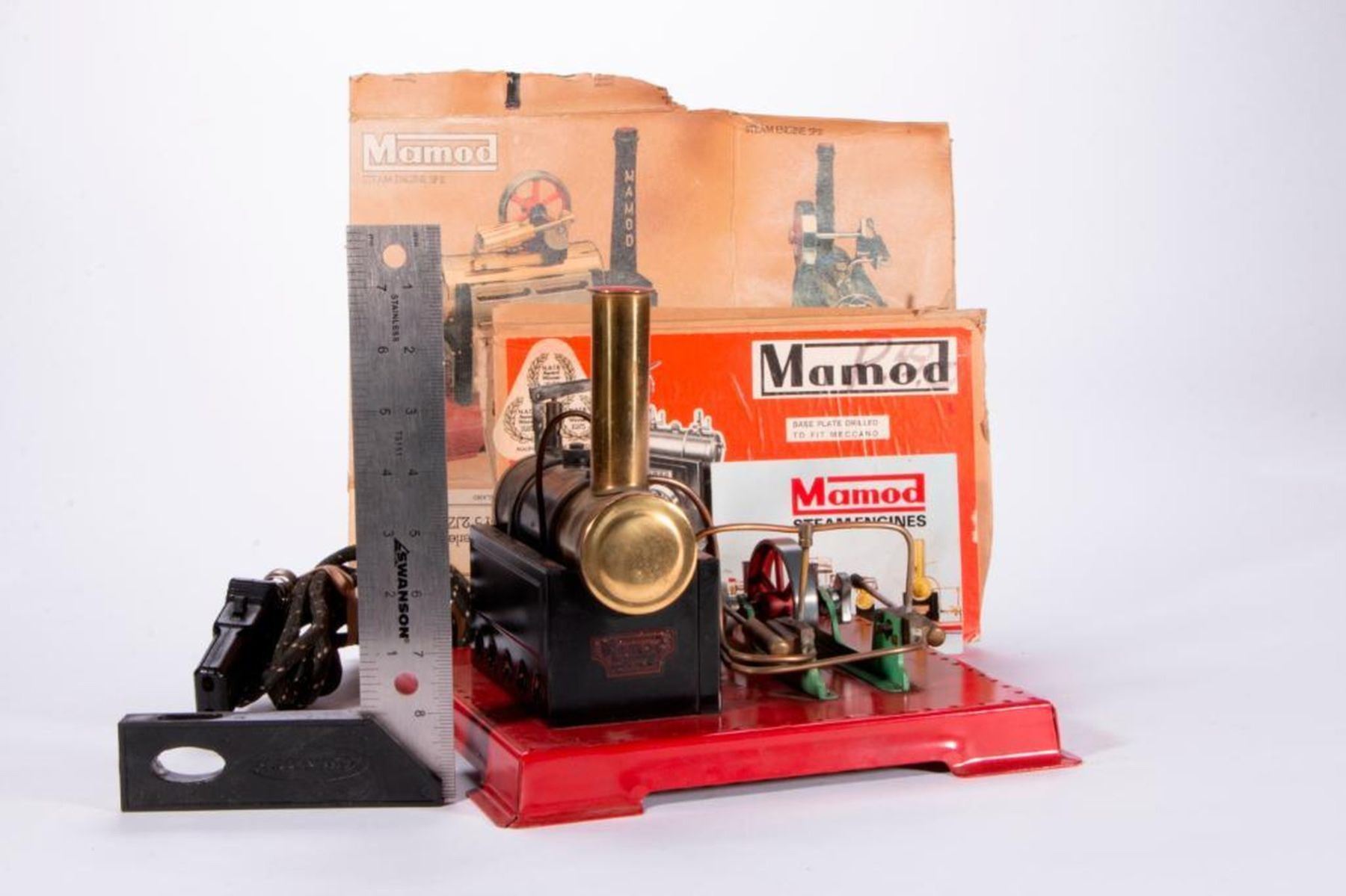 A vintage British Mamod model steam engine. 8 1/2 inches high x 10 1/2 x 9 1/2. Various old Mamod boxes included. As shown. Items are sold as is. Please inquire about condition if not otherwise stated.