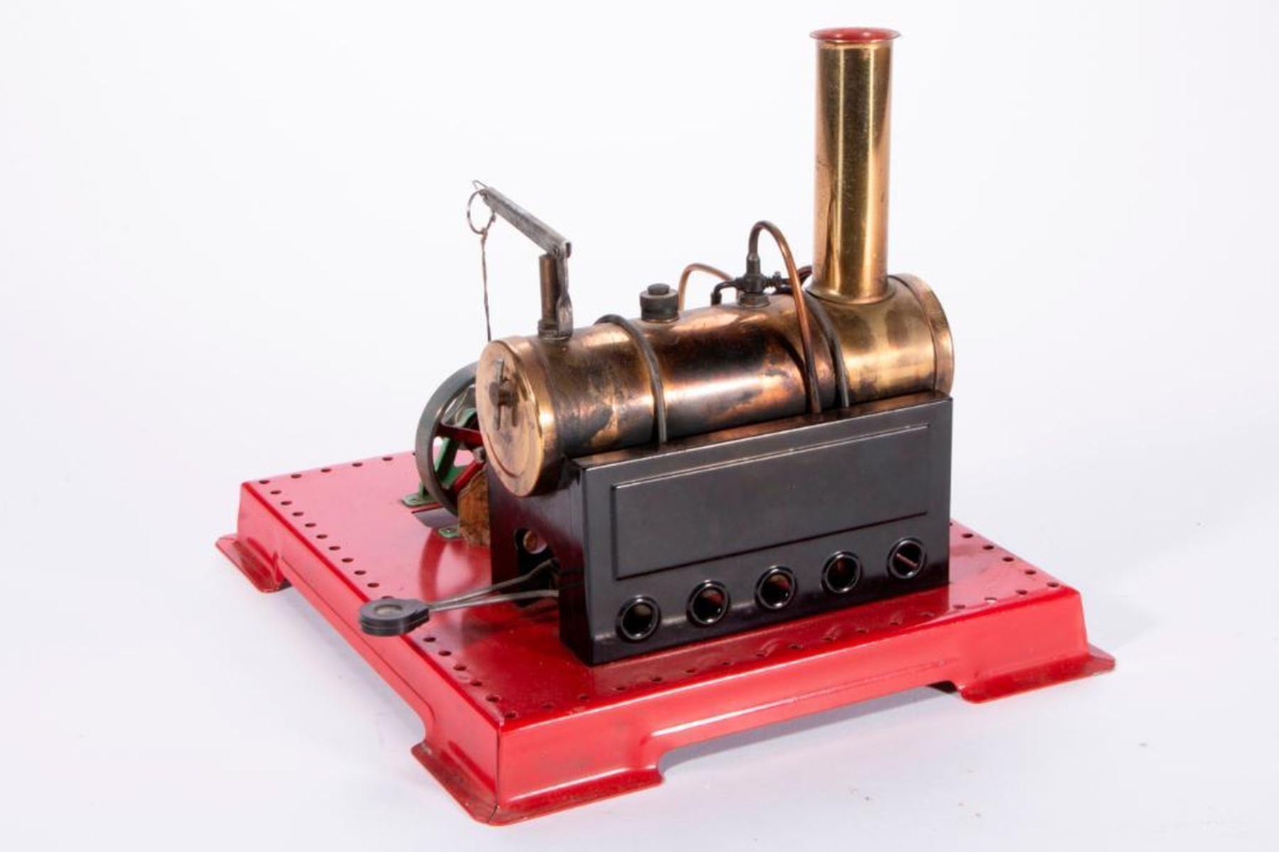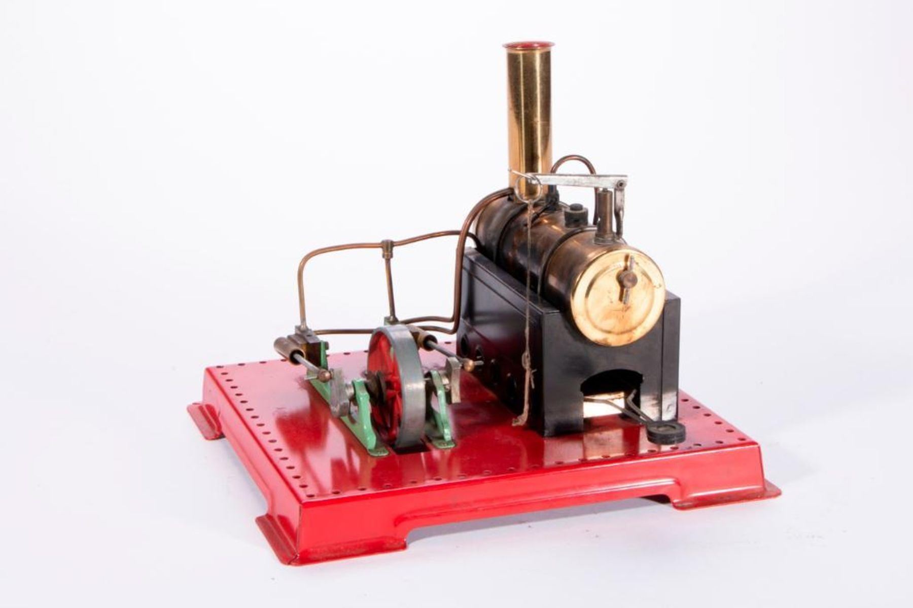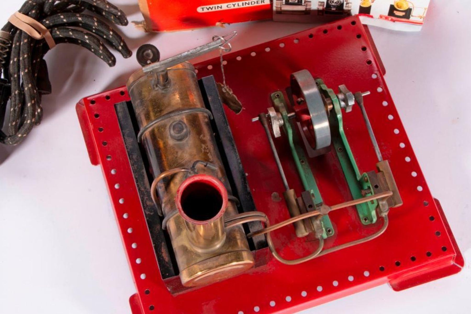 A vintage British Mamod model steam engine. 8 1/2 inches high x 10 1/2 x 9 1/2. Various old Mamod boxes included. As shown. Items are sold as is. Please inquire about condition if not otherwise stated.
