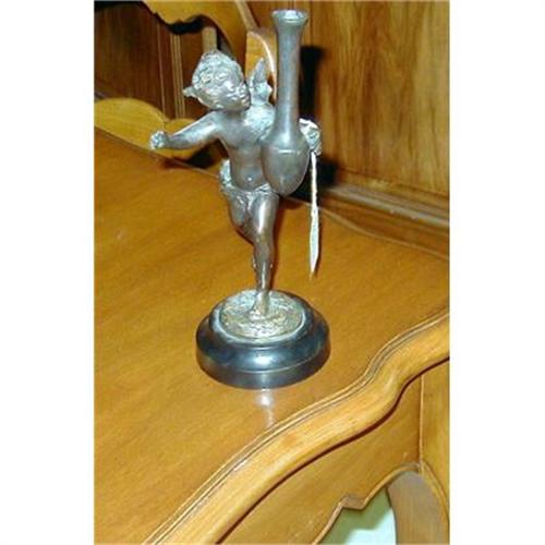 Lovely bronze angel carrying a long vase with felt on botton. It is darker patina than shown in the picture. Vase has rough edge on rim and there are some marks and scratches whiich do not detract from its beauty. Buyer pays shipping and handling costs.