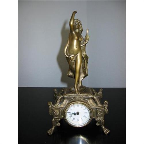 Please view all the images.The detail is very nice. The clock is eauropean and is in working condition. It winds and looks old. the lady on the top is detailed and looks like one hand is up and the other is holding something. Nice addition for the clock collectors. However, it is so decorative that it can be placed on a mantel or a pedestal as art and sculpture. It has number in the back "p181" where the winding is located. The Clock/sculpture is 10 inches long and fairly heavy.
