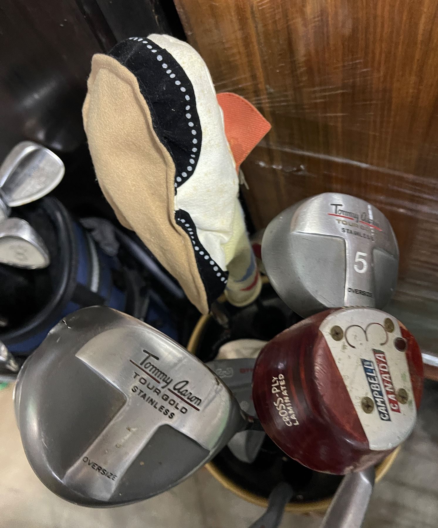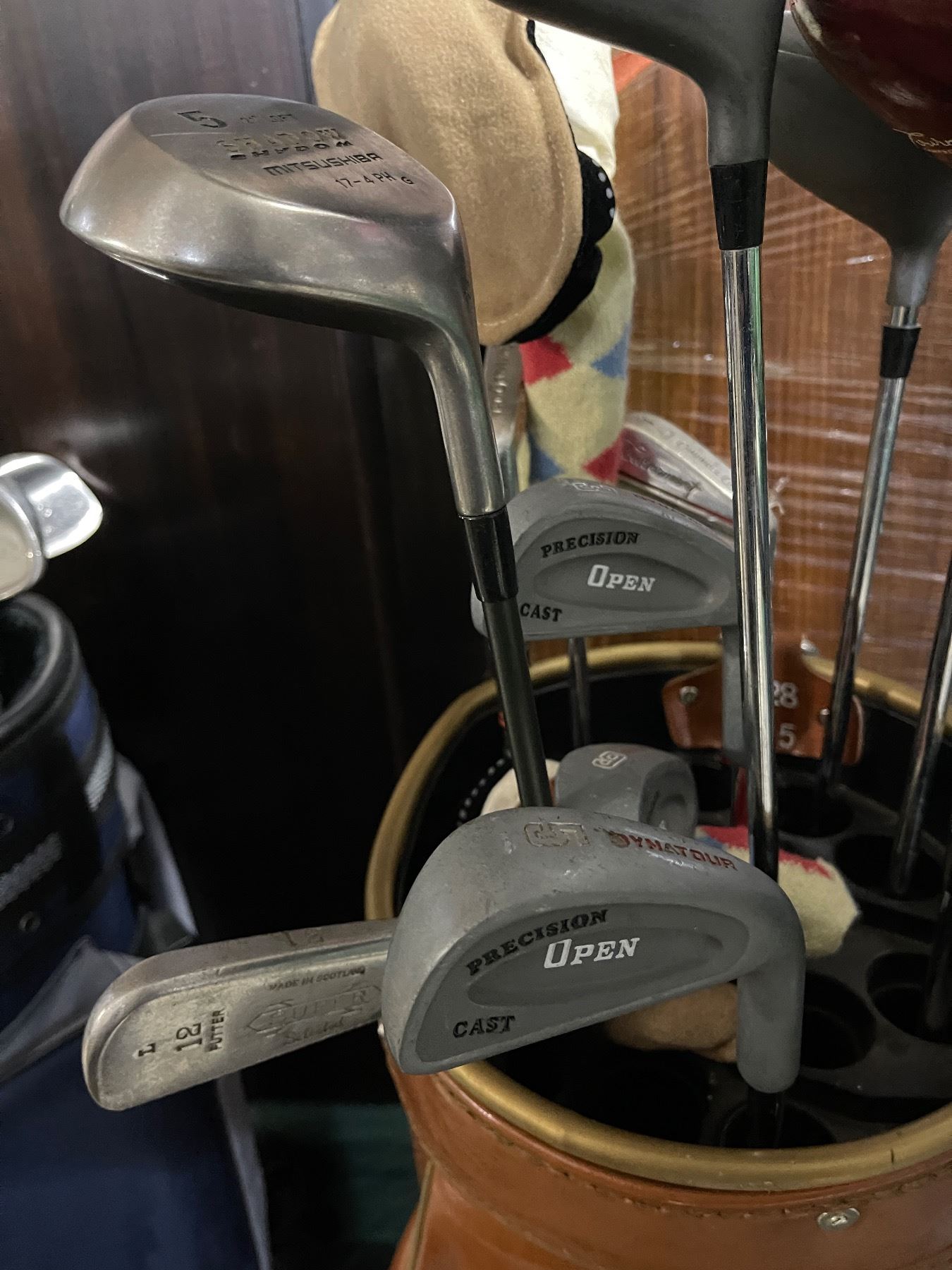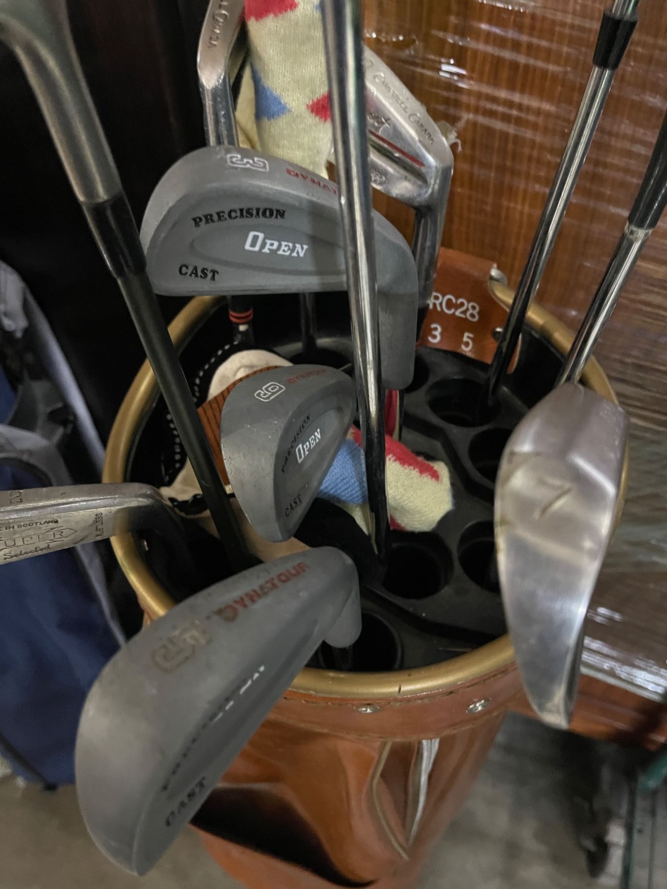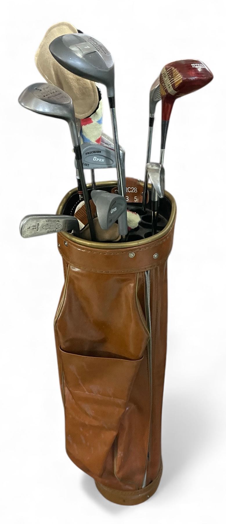 Vintage Brown Leather Golf Bag with Assorted Clubs