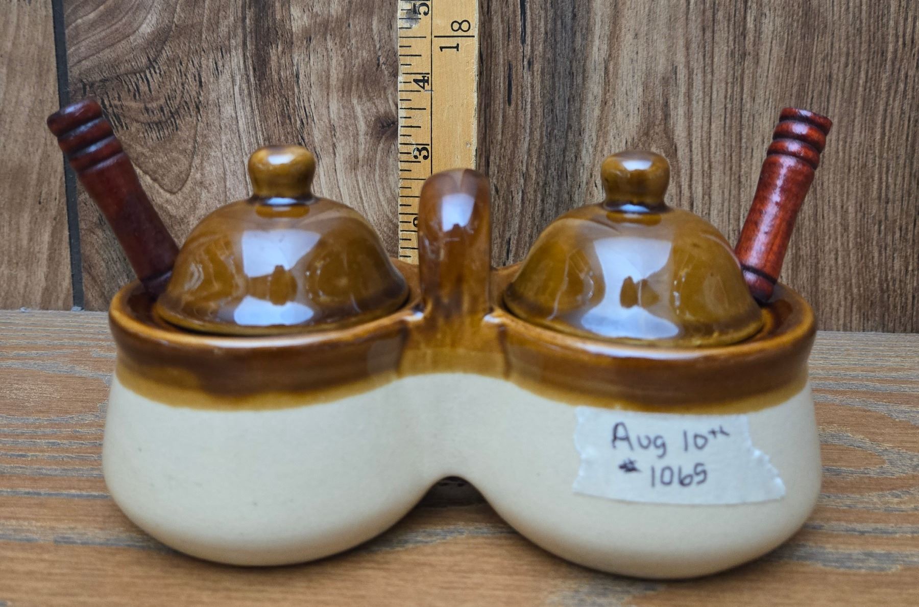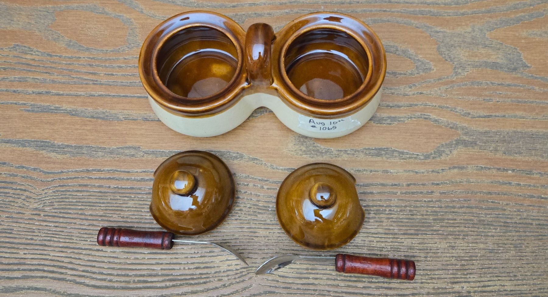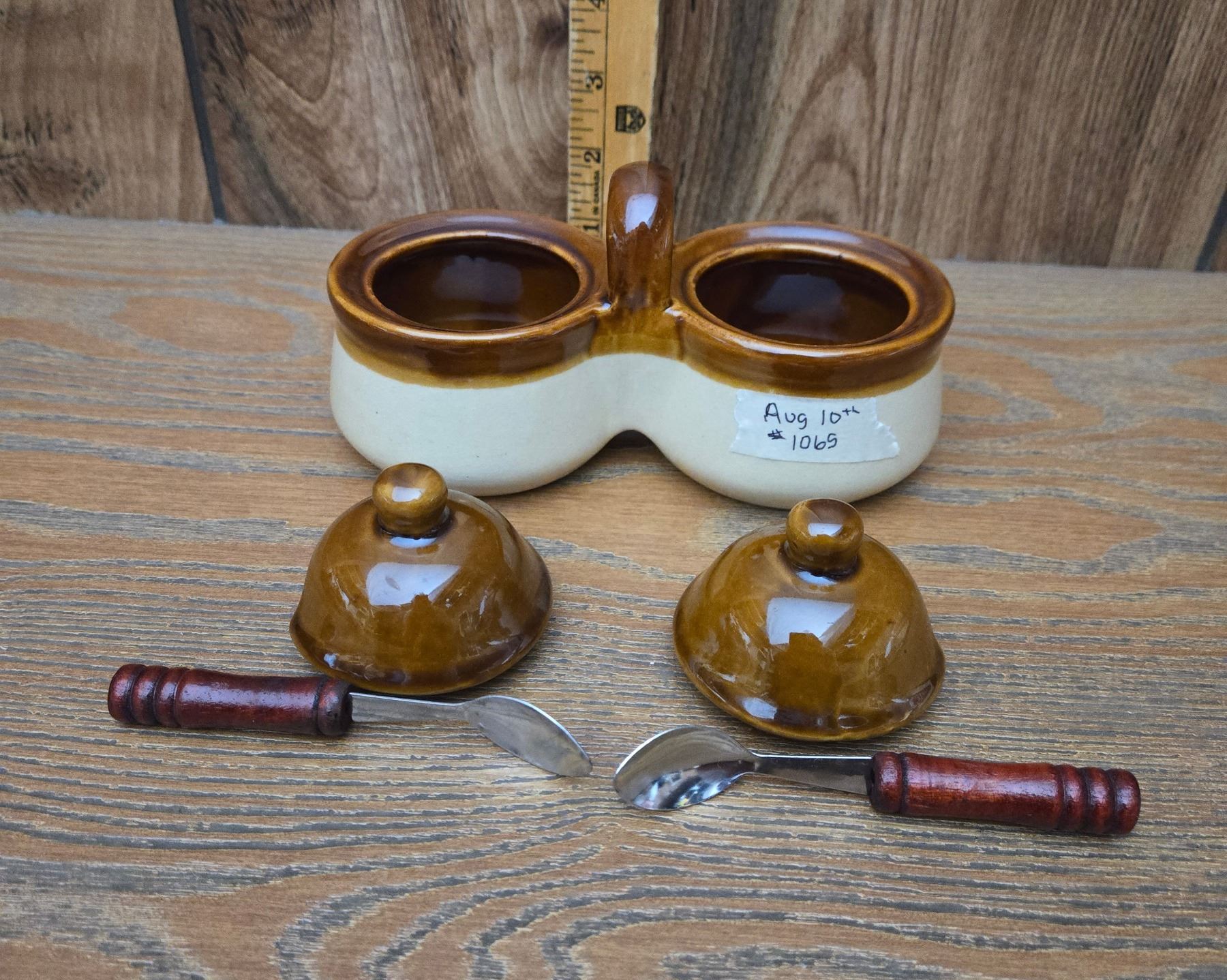 Vintage Brown and Tan Stoneware Double Condiment Server with Spoons