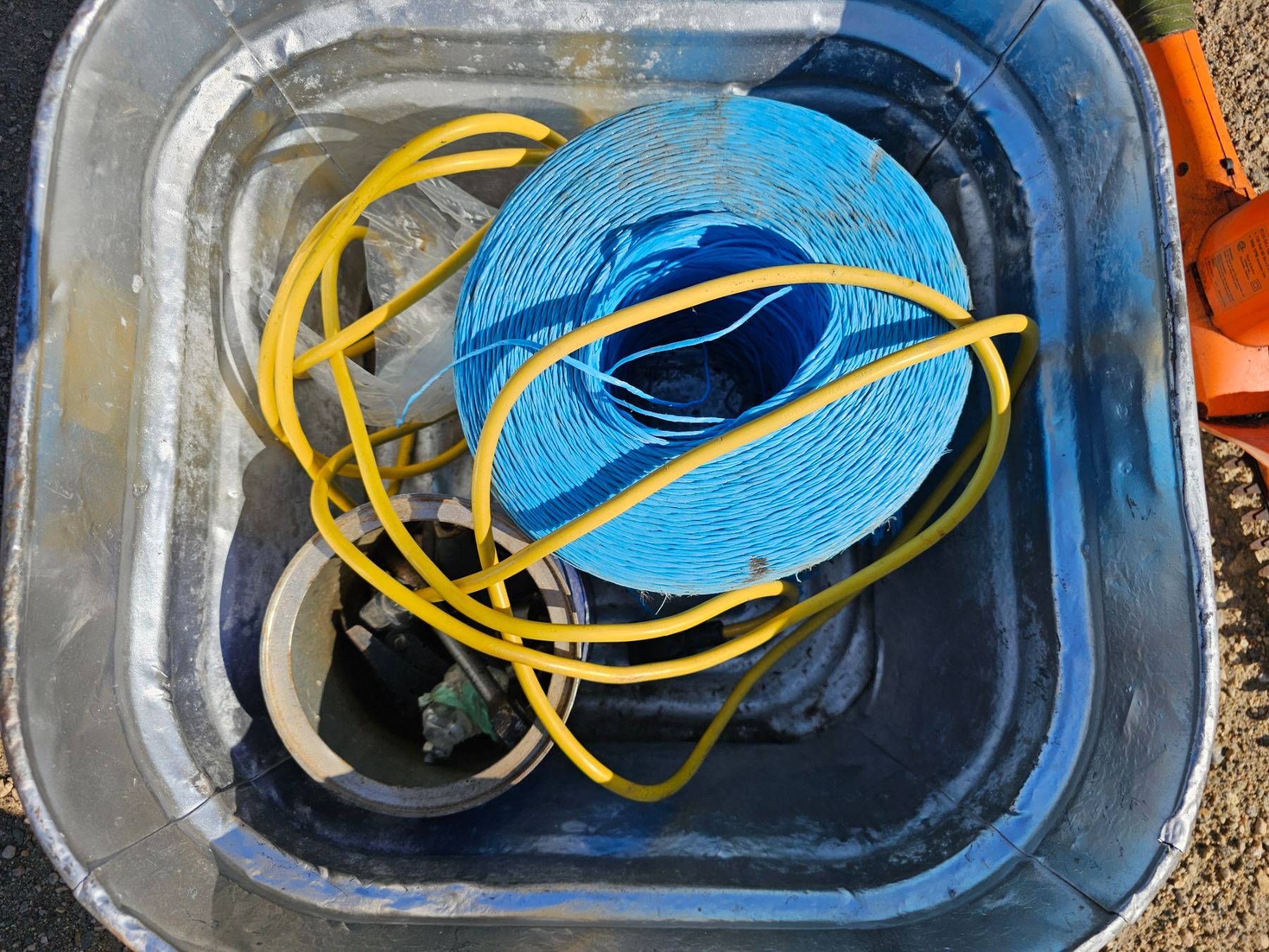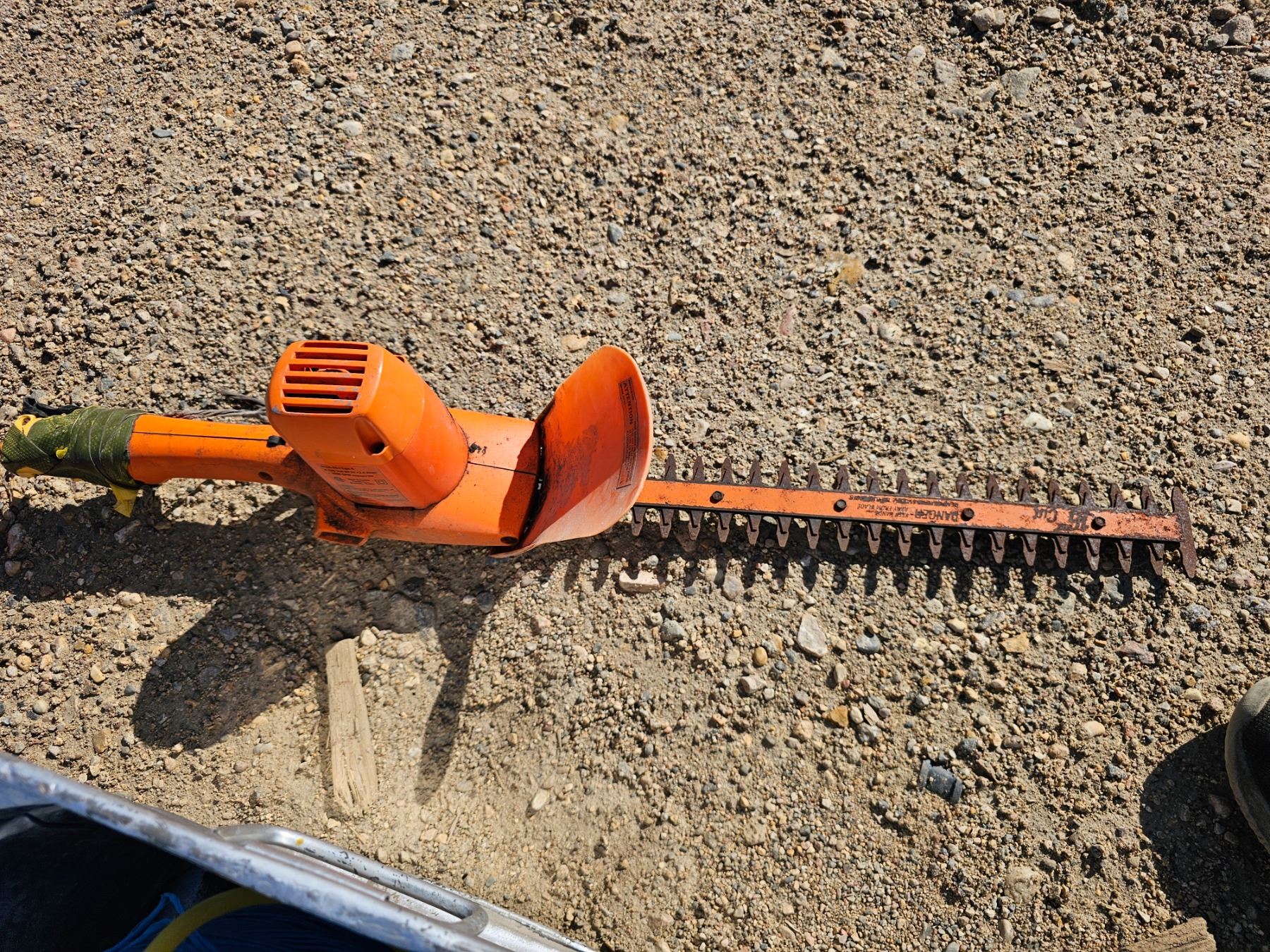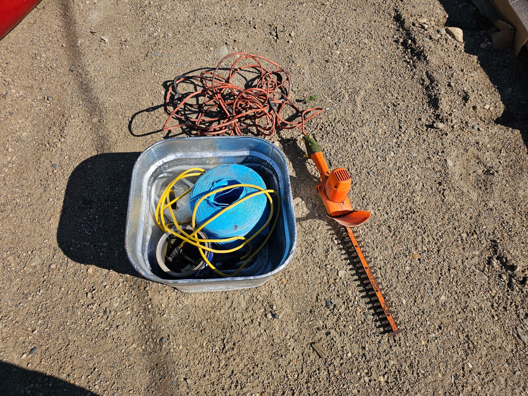Vintage Bucket/16" Hedge Trimmer (Untested)/Extension Cords/Tools/Roll of Twine