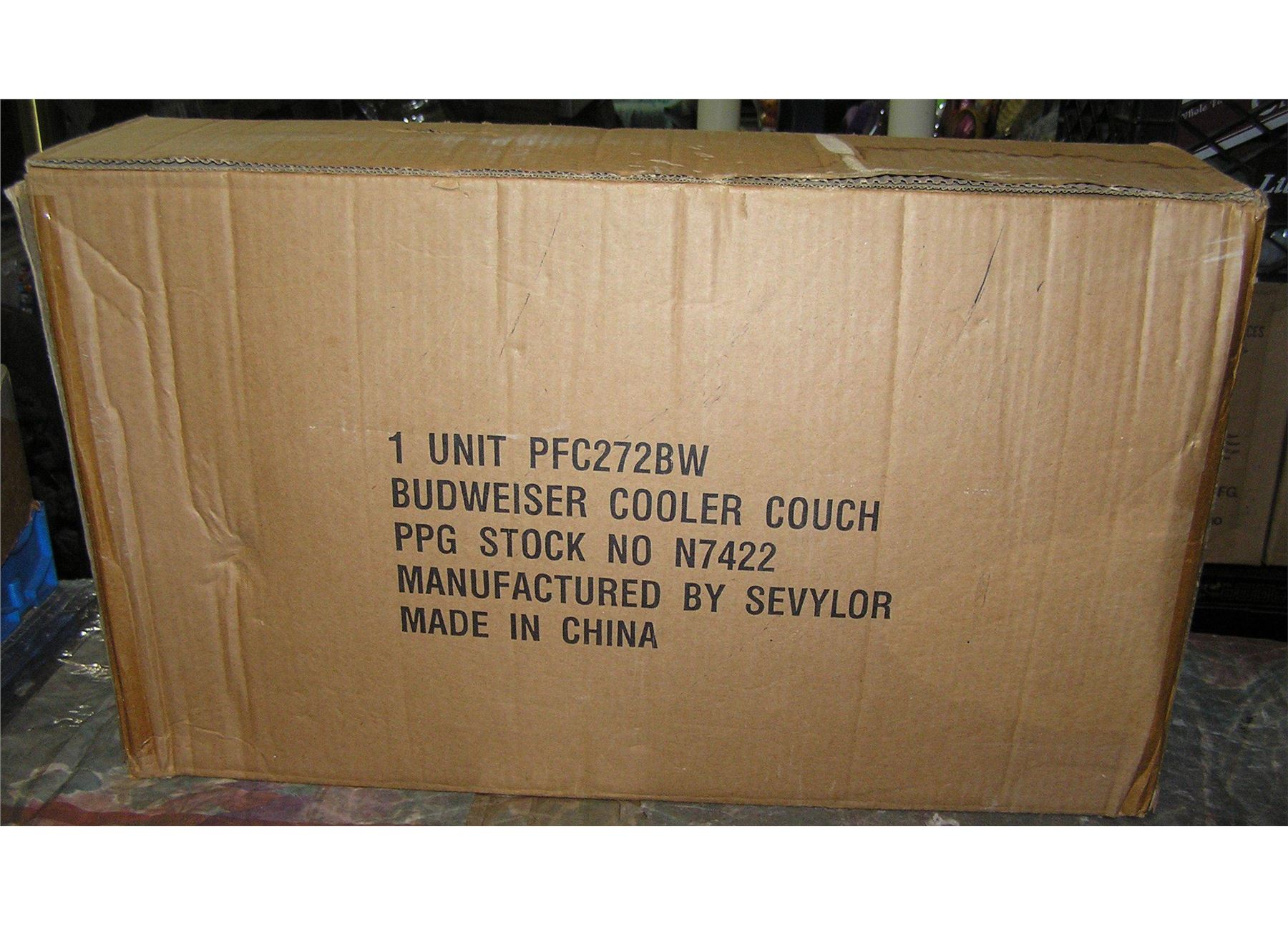 Vintage Budweiser cooler couch inflates to a full size couch with 2 recepticles for 2 coolers with a cup holder in each arm brand new in the box never opened est. value $175.00-$200.00