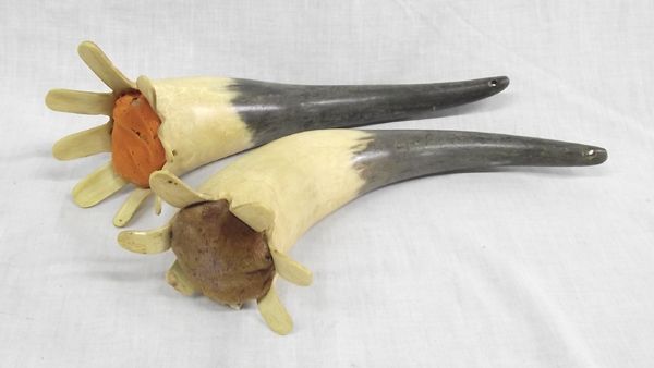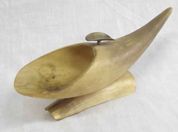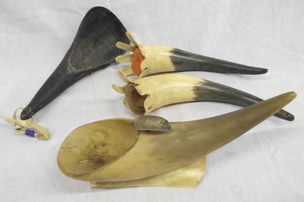 Vintage Buffalo and Cow Horn Collectibles, largest measures 11'' x 3'', 1 scoop, 1 ashtray, 2 flared ended horns