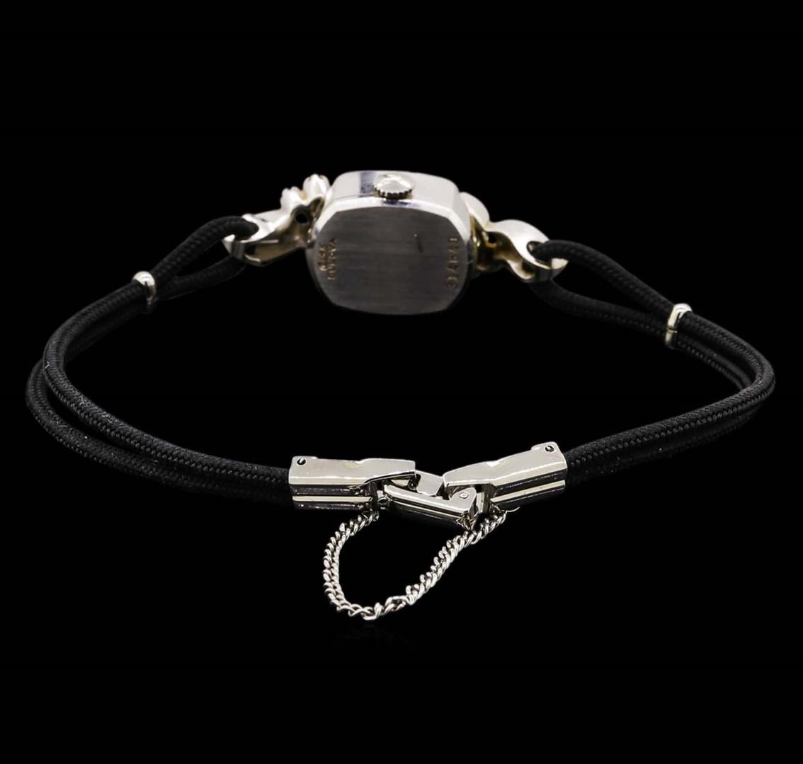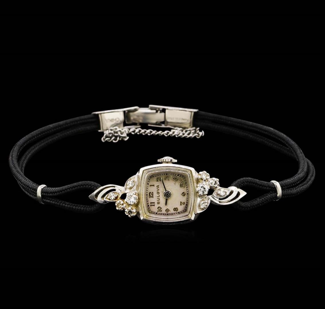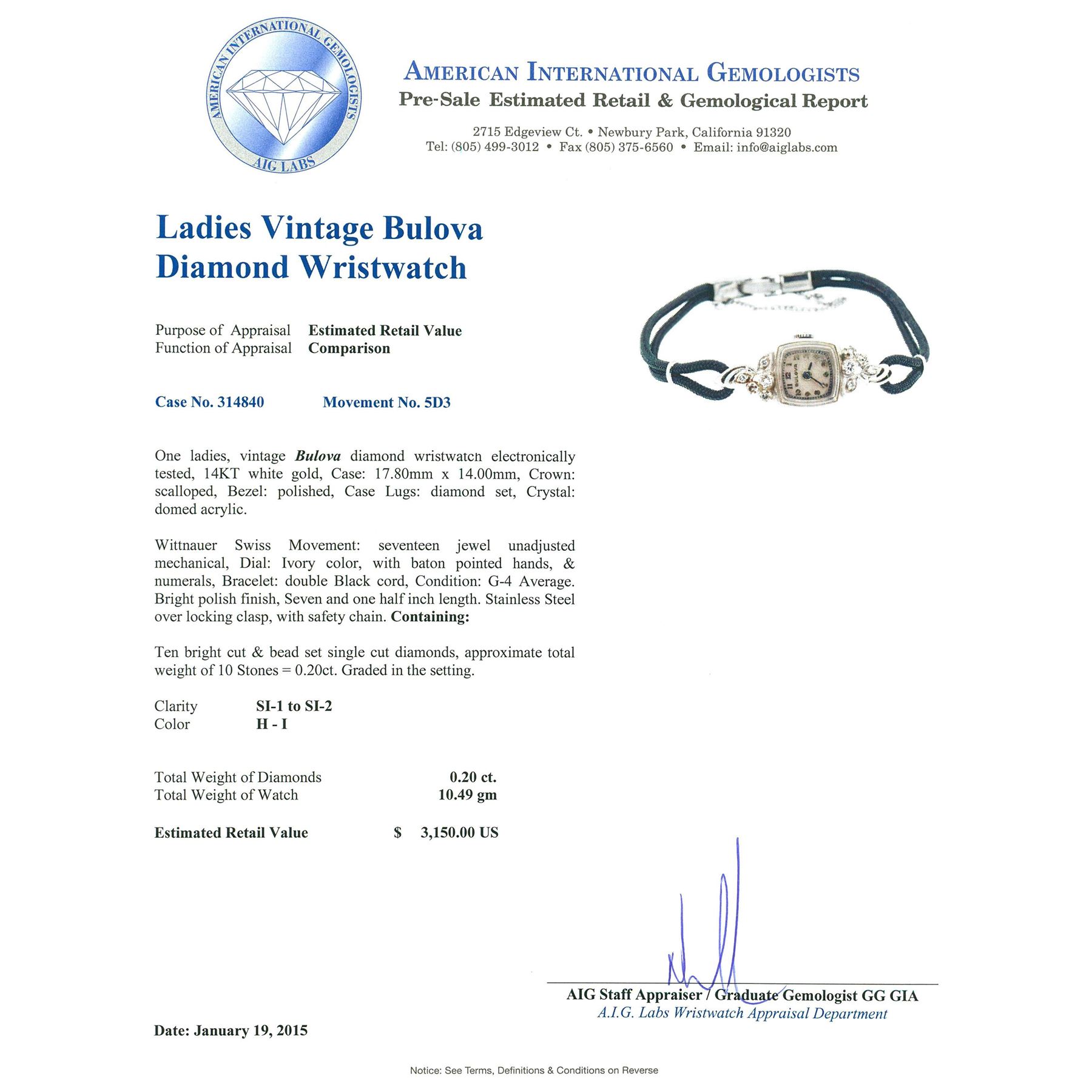 One ladies, vintage Bulova diamond wristwatch electronically tested, 14KT white gold, Case: 17.80mm x 14.00mm, Crown: scalloped, Bezel: polished, Case Lugs: diamond set, Crystal: domed acrylic. Wittnauer Swiss Movement: seventeen jewel unadjusted mechanical, Dial: Ivory color, with baton pointed hands, & numerals, Bracelet: double Black cord, Condition: G-4 Average. Bright polish finish, Seven and one half inch length. Stainless Steel over locking clasp, with safety chain. Containing: Ten bright cut & bead set single cut diamonds, approximate. Total Weight of 10 Stones = 0.20ct. Graded in the setting. Clarity: SI-1 to SI-2. Color: H - I. Total Weight of Diamonds 0.20ct. Total Weight of Watch 10.49 grams. AIG Appraised at $3,150.00.