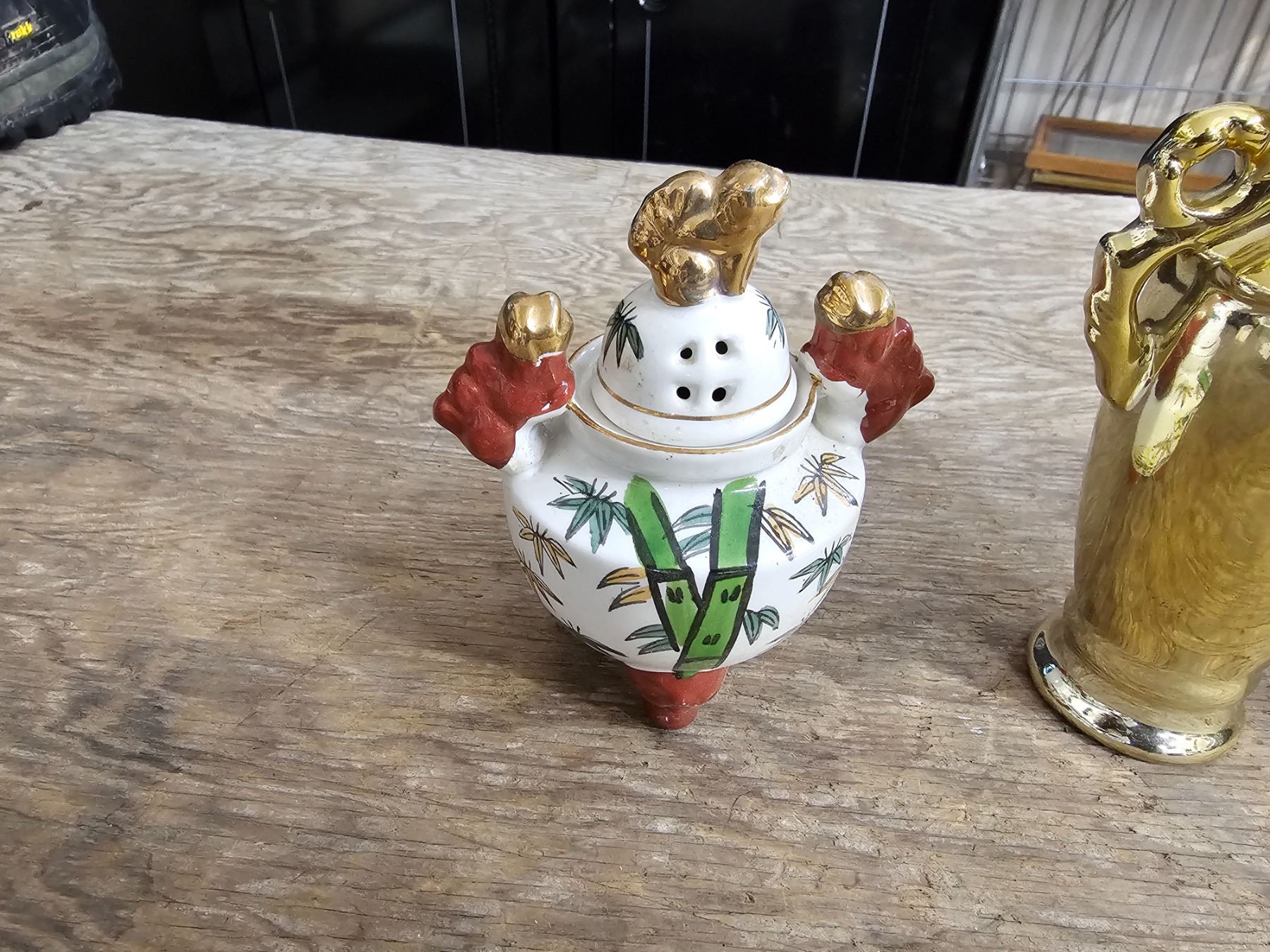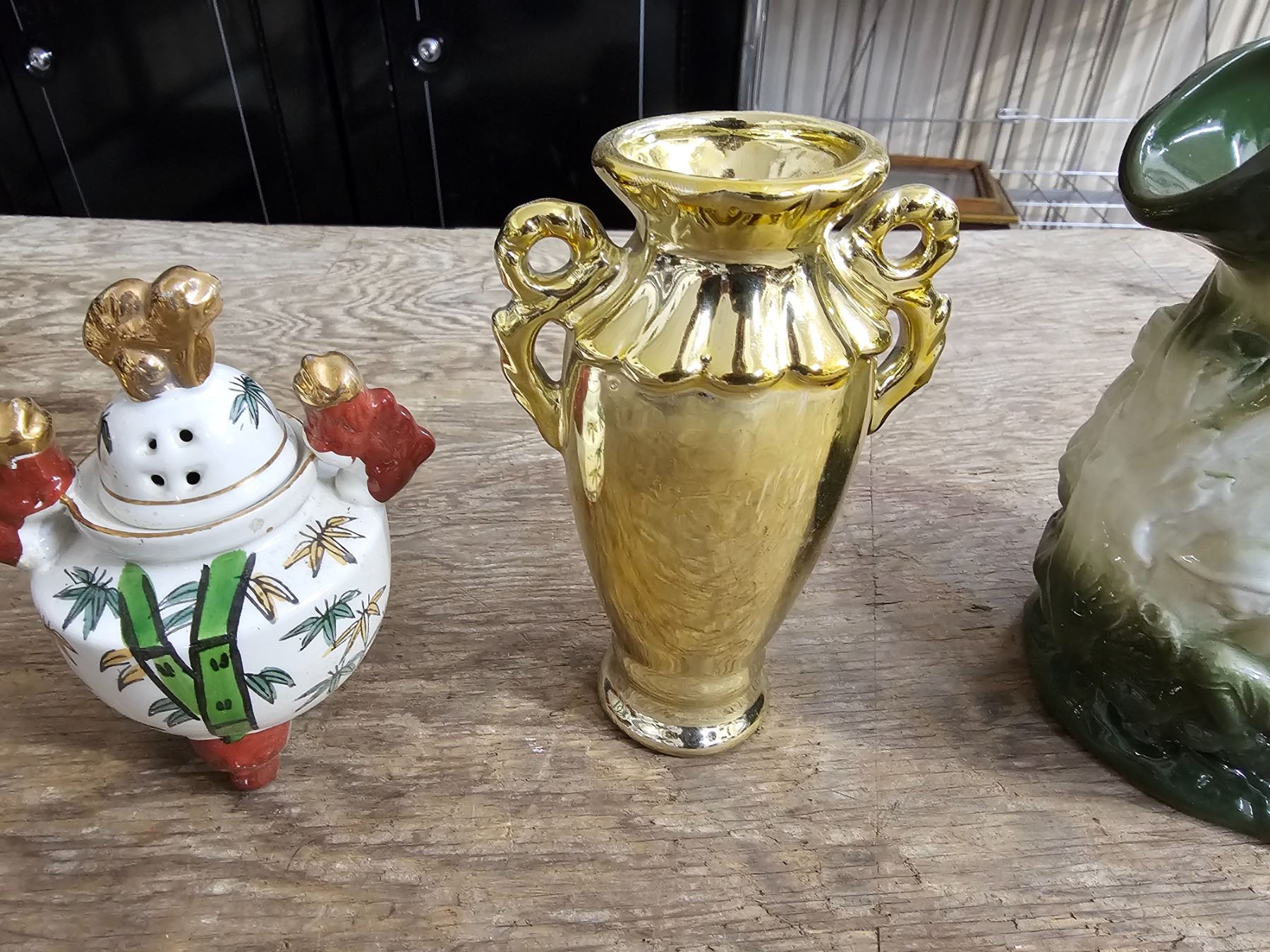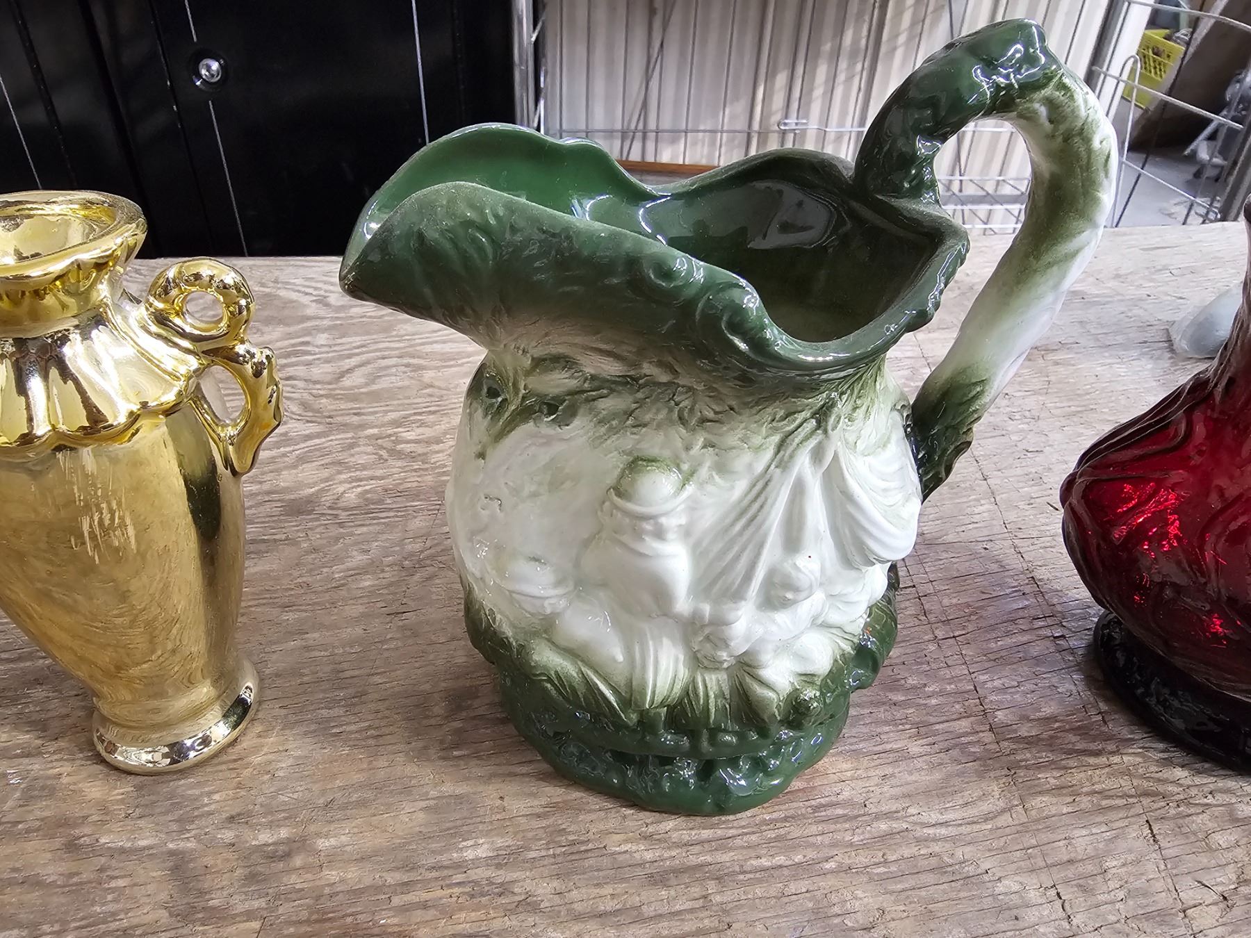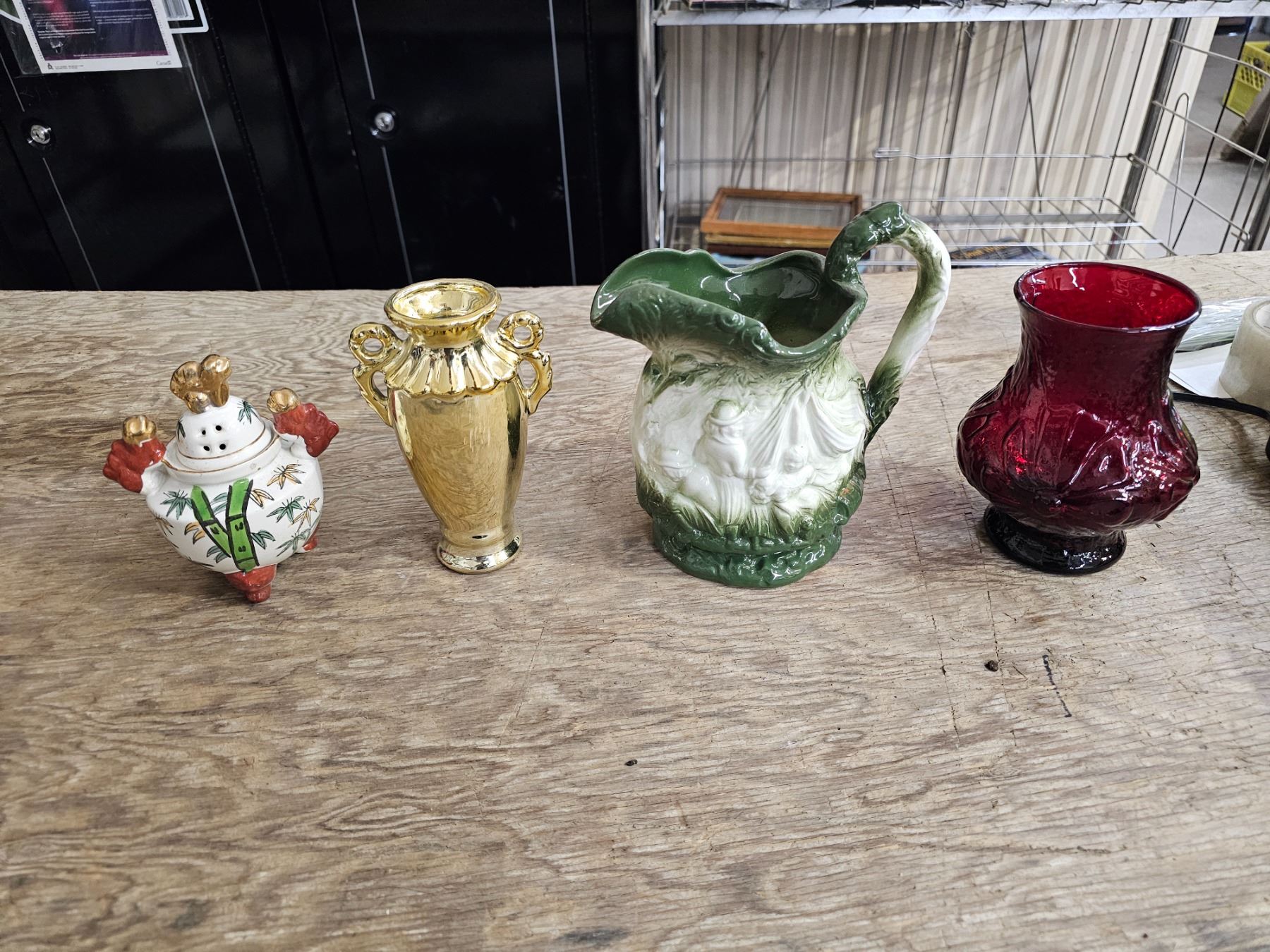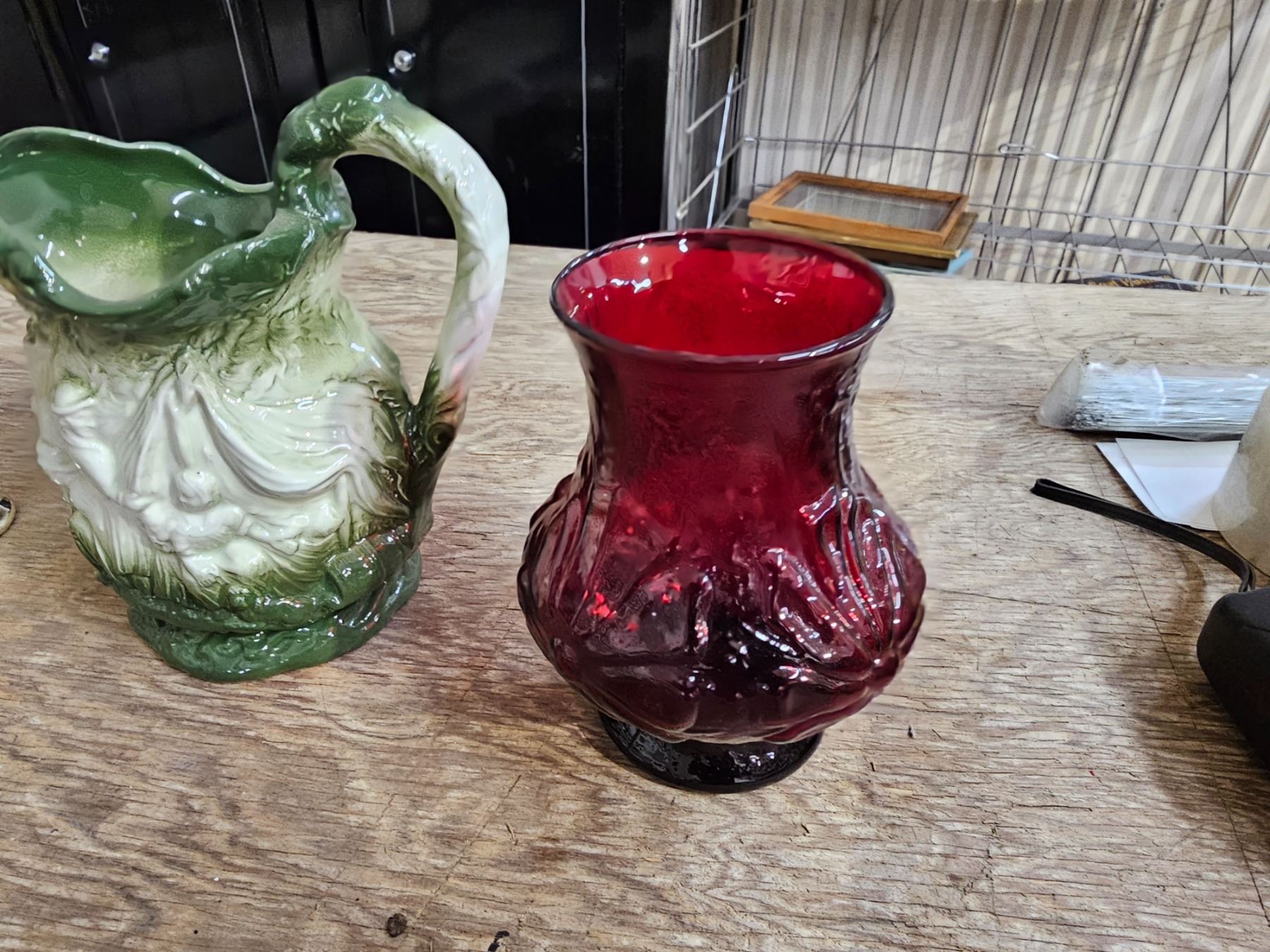 Vintage Burleighg Ironstone Pitcher/Anchor Hocking Ruby Red Vase/Asian Fu Dog Urn Incense Burner