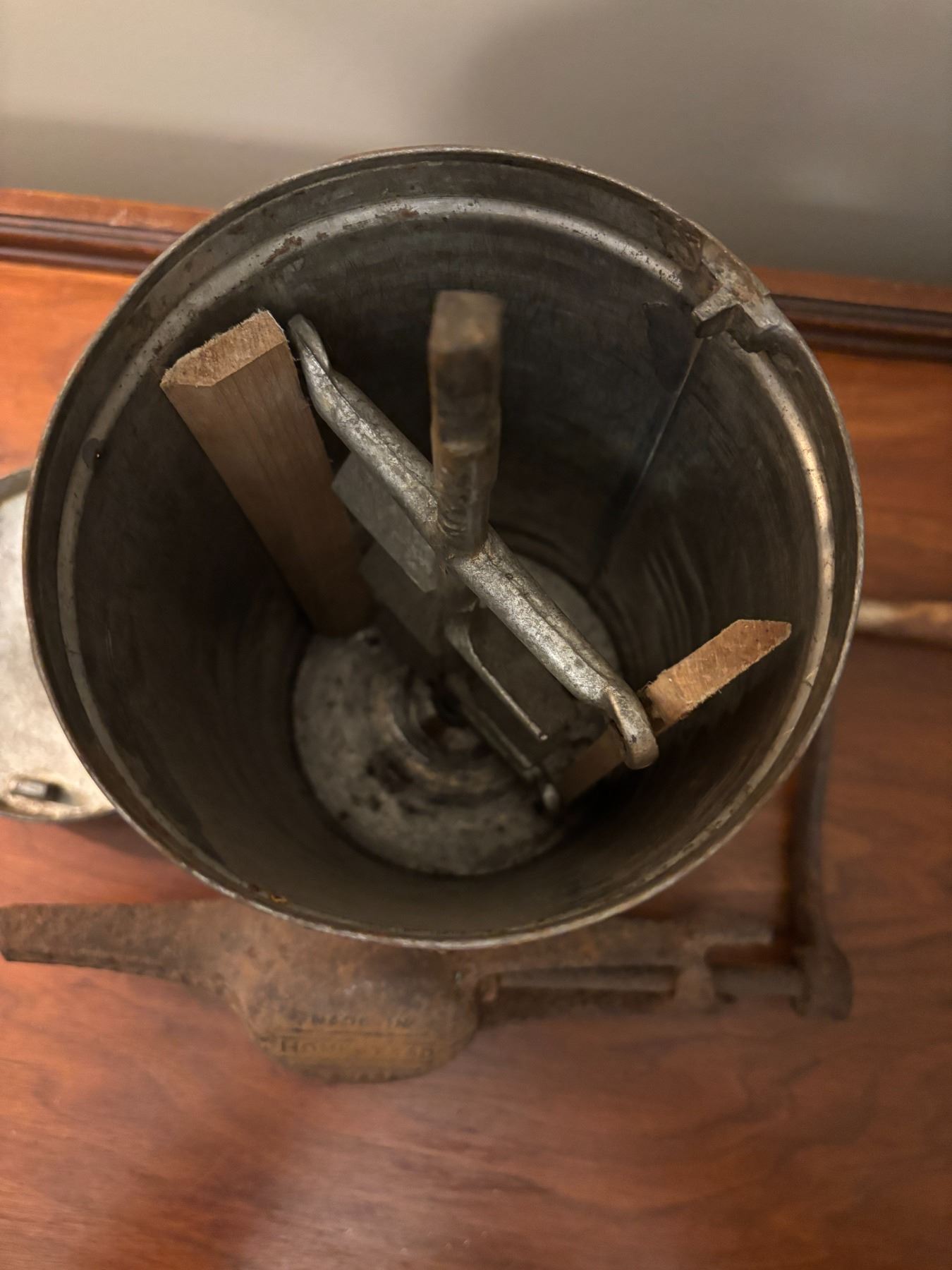 Made in Canada; outside is rusty/inside is not. 12” high x 5” wide