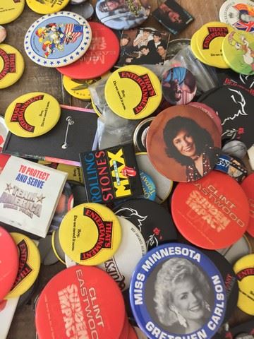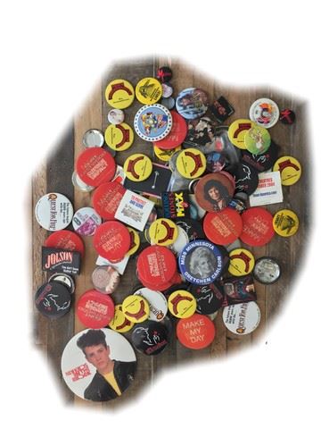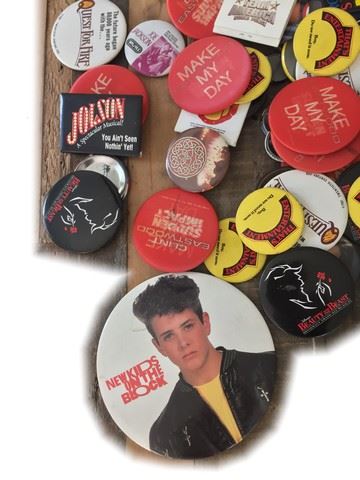 Collection of ~50 buttons from various movies, shoes, bands, cartoons,and famous movie quotes. Buttons include "New Kids On The Block", "Rolling Stones, "That's Entertainment", "Make My Day", "Watership Down, "Quest For Fire", "2010 The Year We Make Contact", and many more.