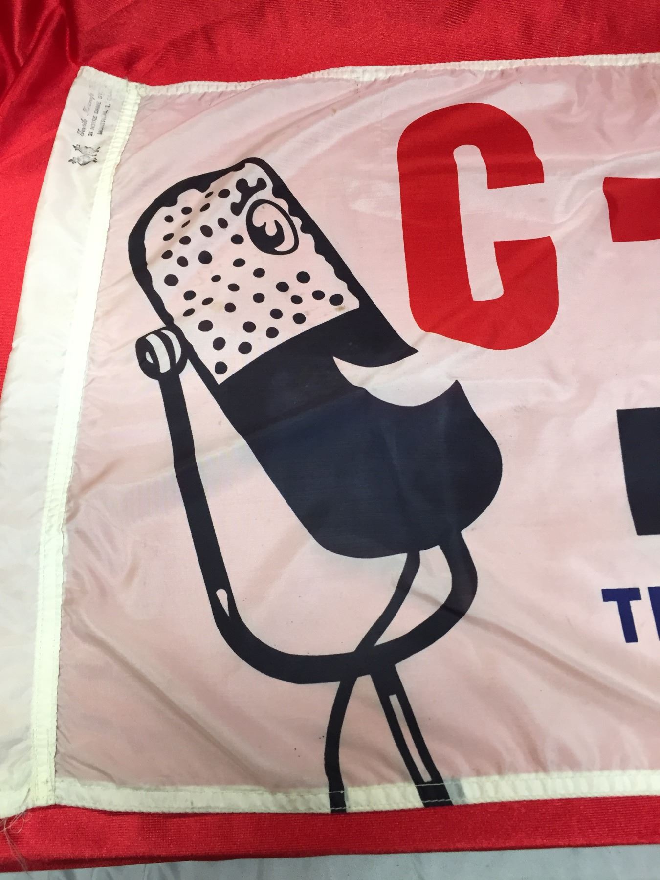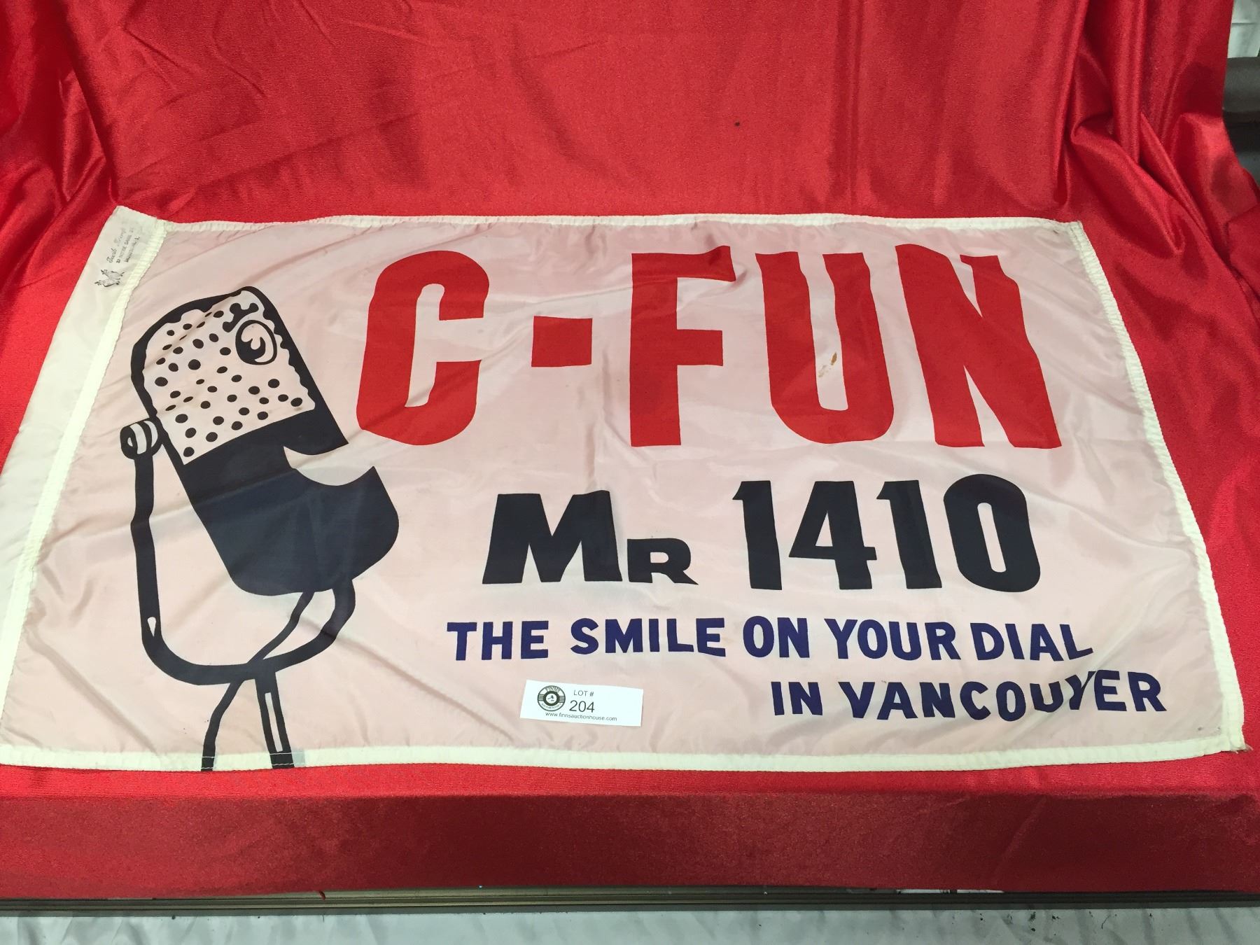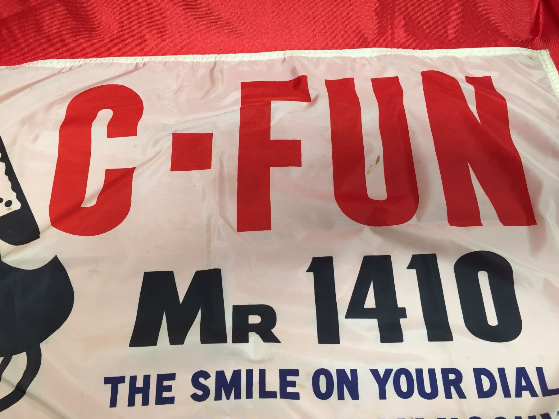 Vintage C-Fun. "Mr 1410 The Smile on Your Dial in Vancouver" Flag. 1970's Flag is 33" L x 19" H. A Nice Piece of Vancouver Radio History