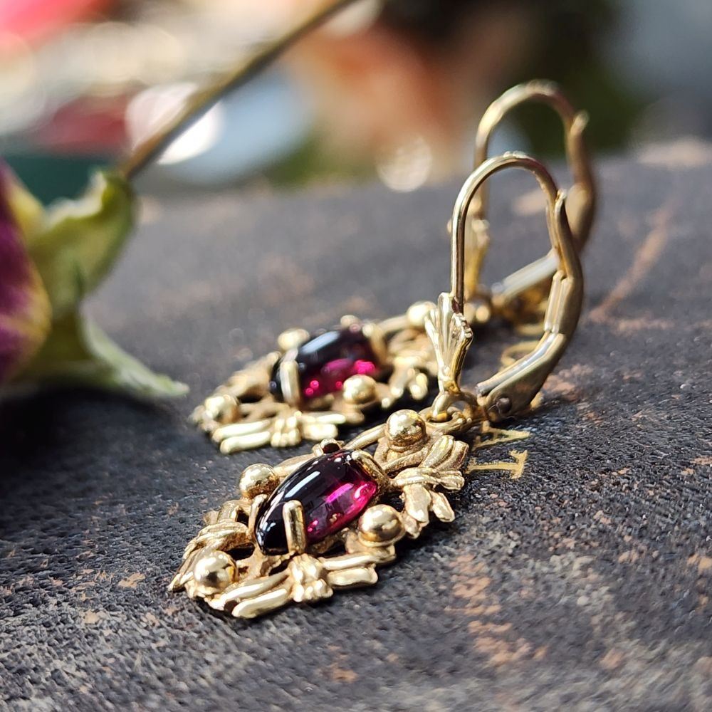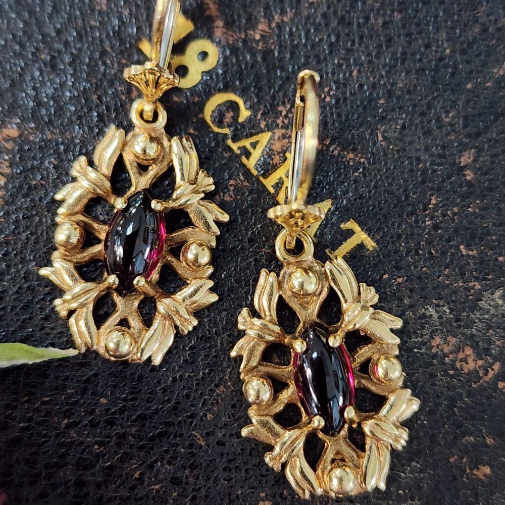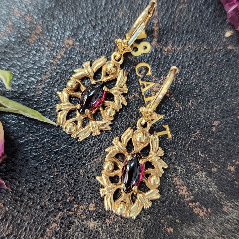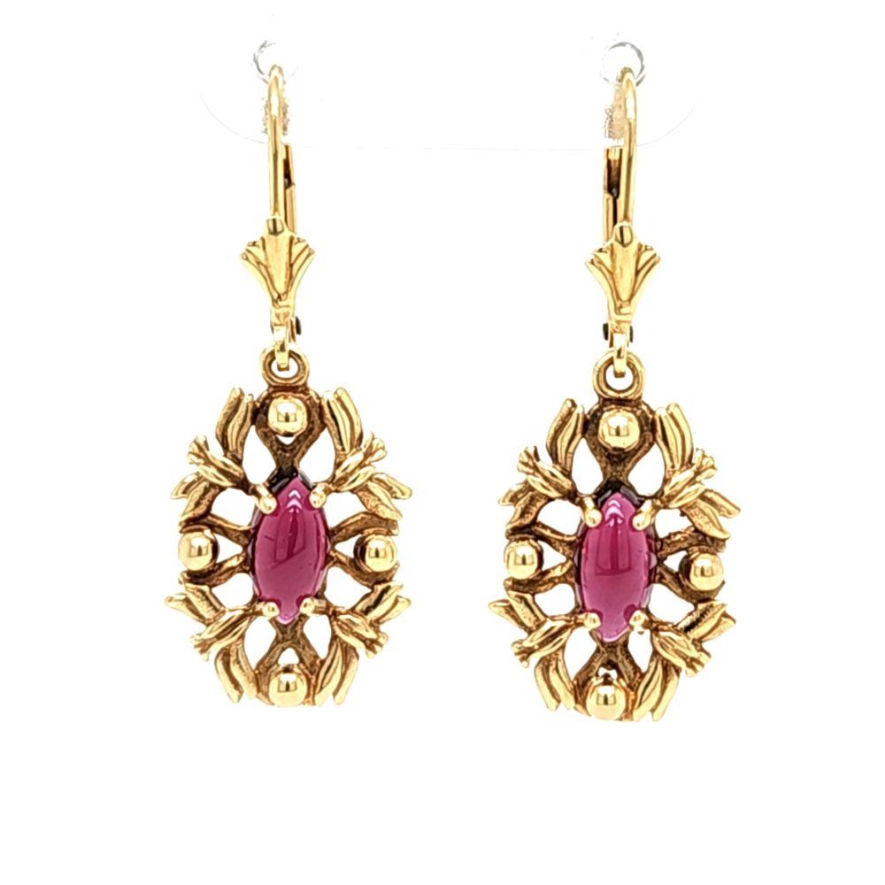 Genuine Garnet Earrings.& nbsp; This is a pair of signed CARLA 14 karat yellow gold earrings featuring marquise-shaped cabochon rhodolite garnets that measure approximately 8 mm x 4.5 mm and are prong-set in floral and bead frames.& nbsp; The earrings measure approximately 1.5& quot; long and 1/2& quot; wide. The quality is that of the vintage items we seldom see in new manufactured jewelry, as the frame is strong, not flimsy.& nbsp; The earrings attach to the lobe with lever backs that are stamped 14K and CARLA.& nbsp; This is a preowned, estate item in excellent condition.