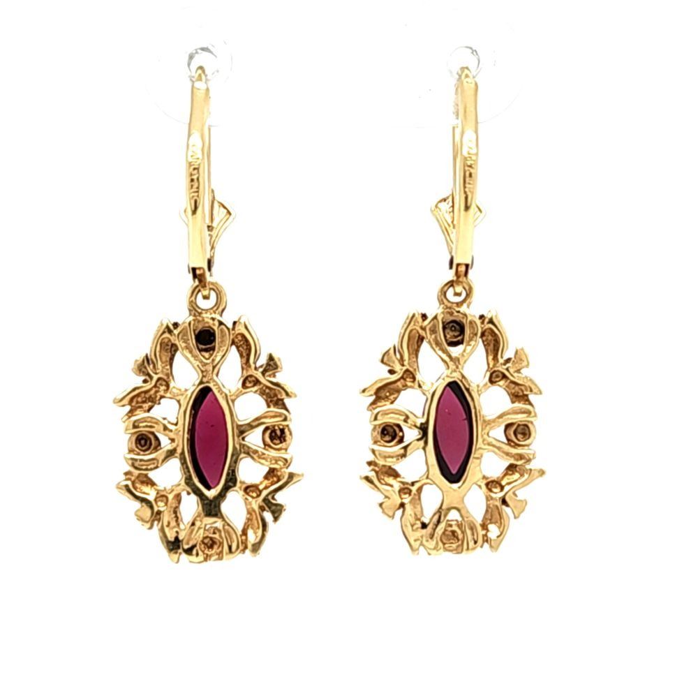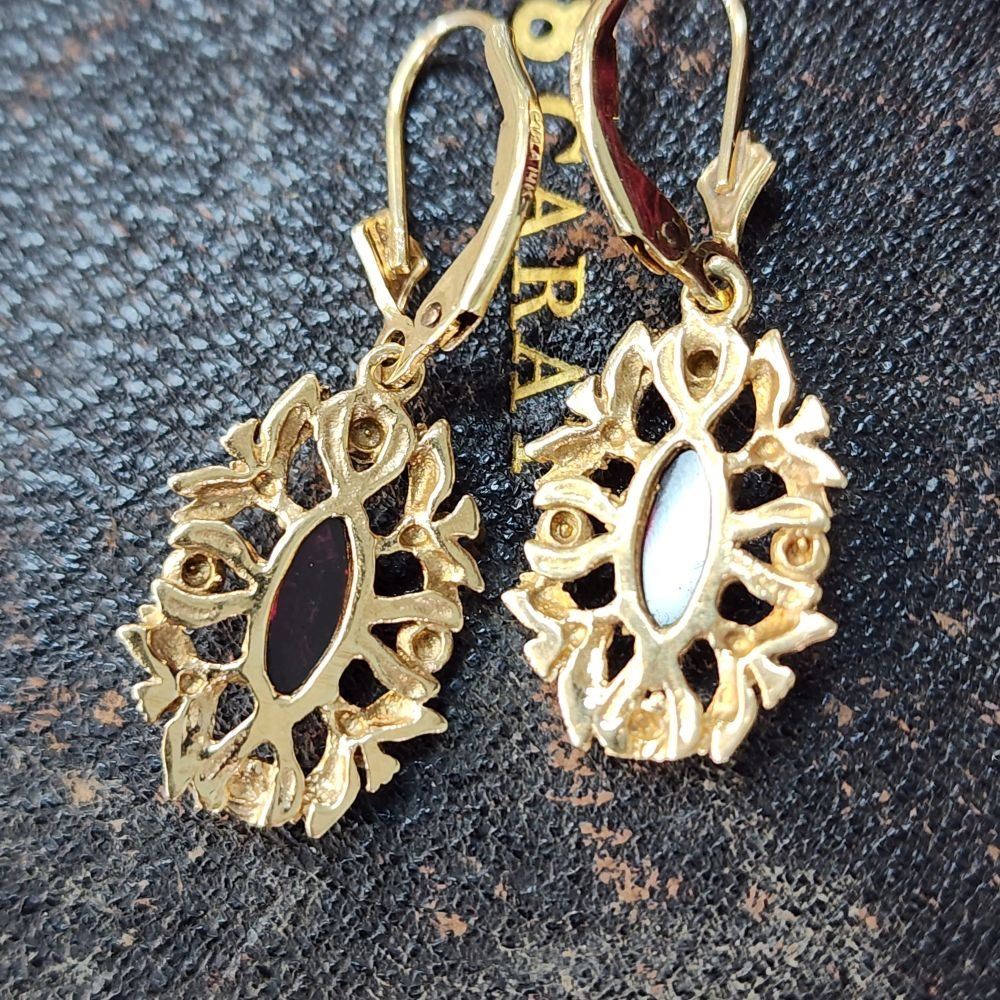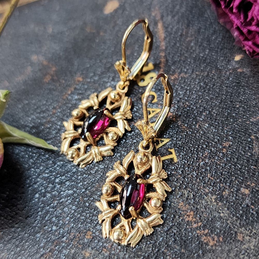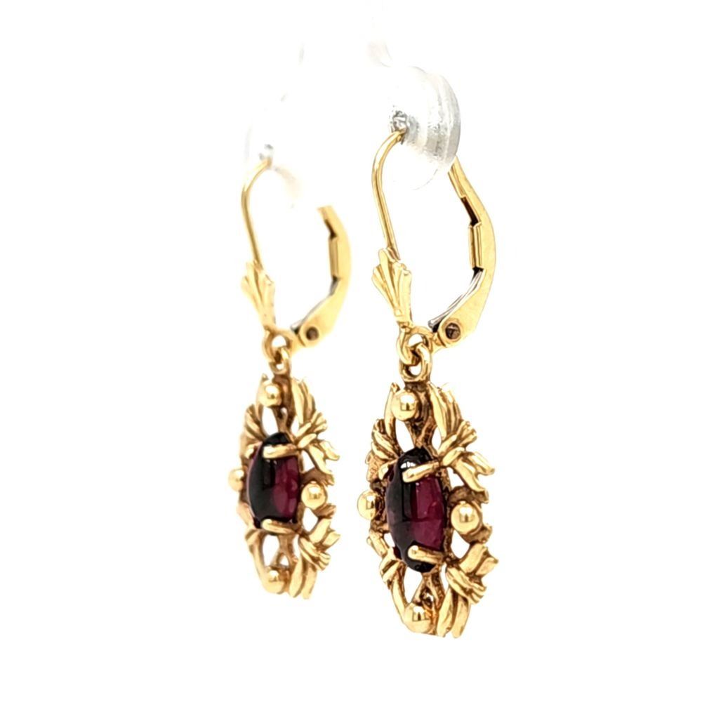 Genuine Garnet Earrings.& nbsp; This is a pair of signed CARLA 14 karat yellow gold earrings featuring marquise-shaped cabochon rhodolite garnets that measure approximately 8 mm x 4.5 mm and are prong-set in floral and bead frames.& nbsp; The earrings measure approximately 1.5& quot; long and 1/2& quot; wide. The quality is that of the vintage items we seldom see in new manufactured jewelry, as the frame is strong, not flimsy.& nbsp; The earrings attach to the lobe with lever backs that are stamped 14K and CARLA.& nbsp; This is a preowned, estate item in excellent condition.