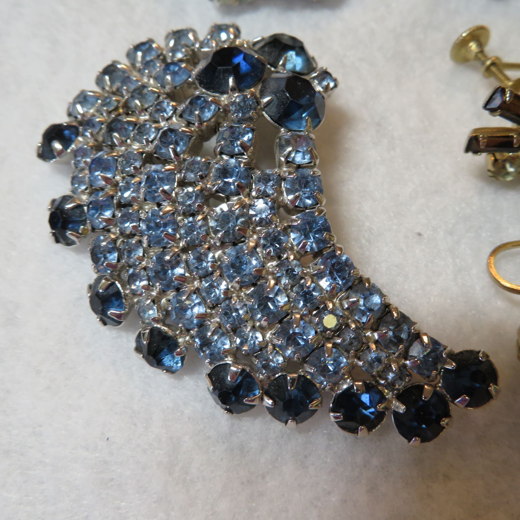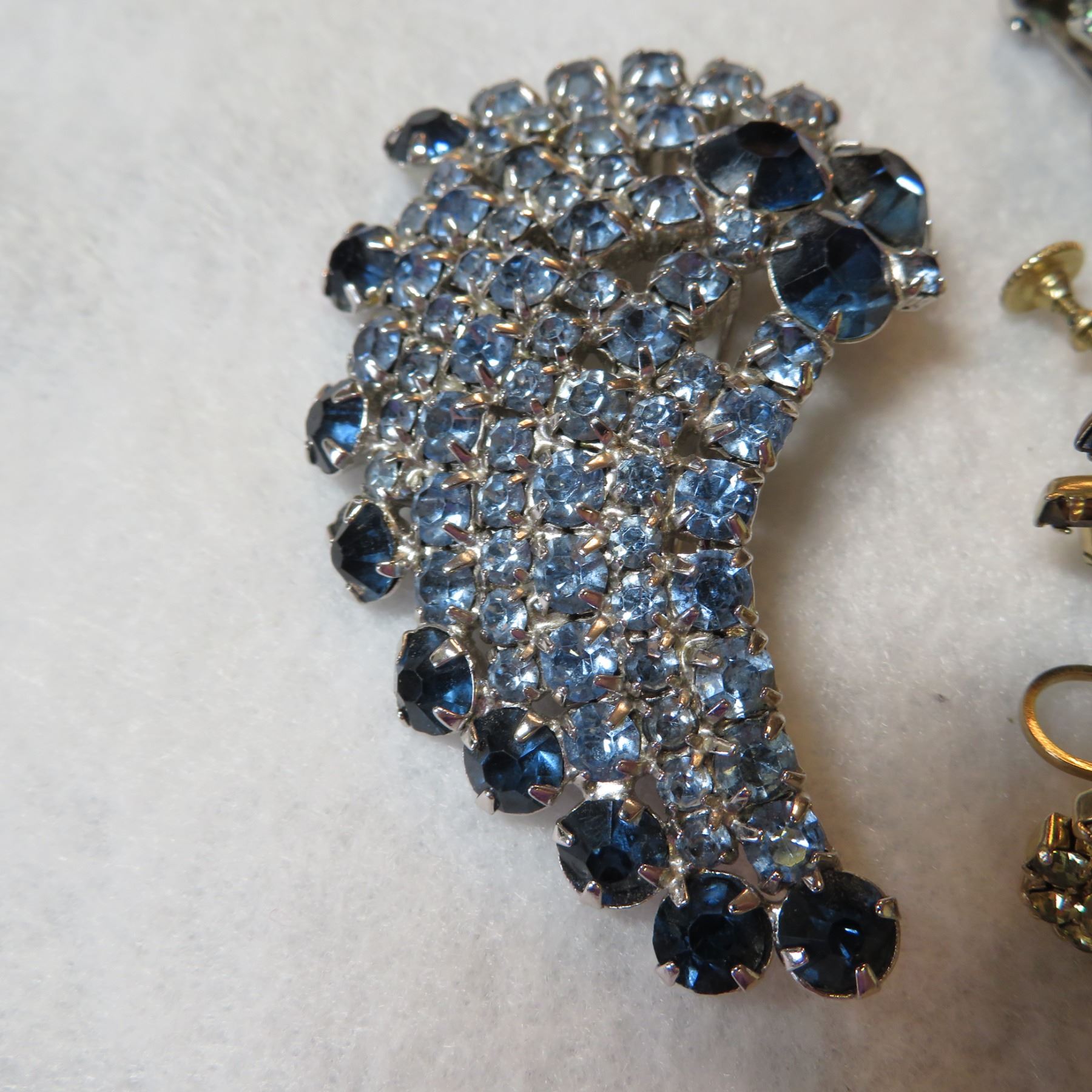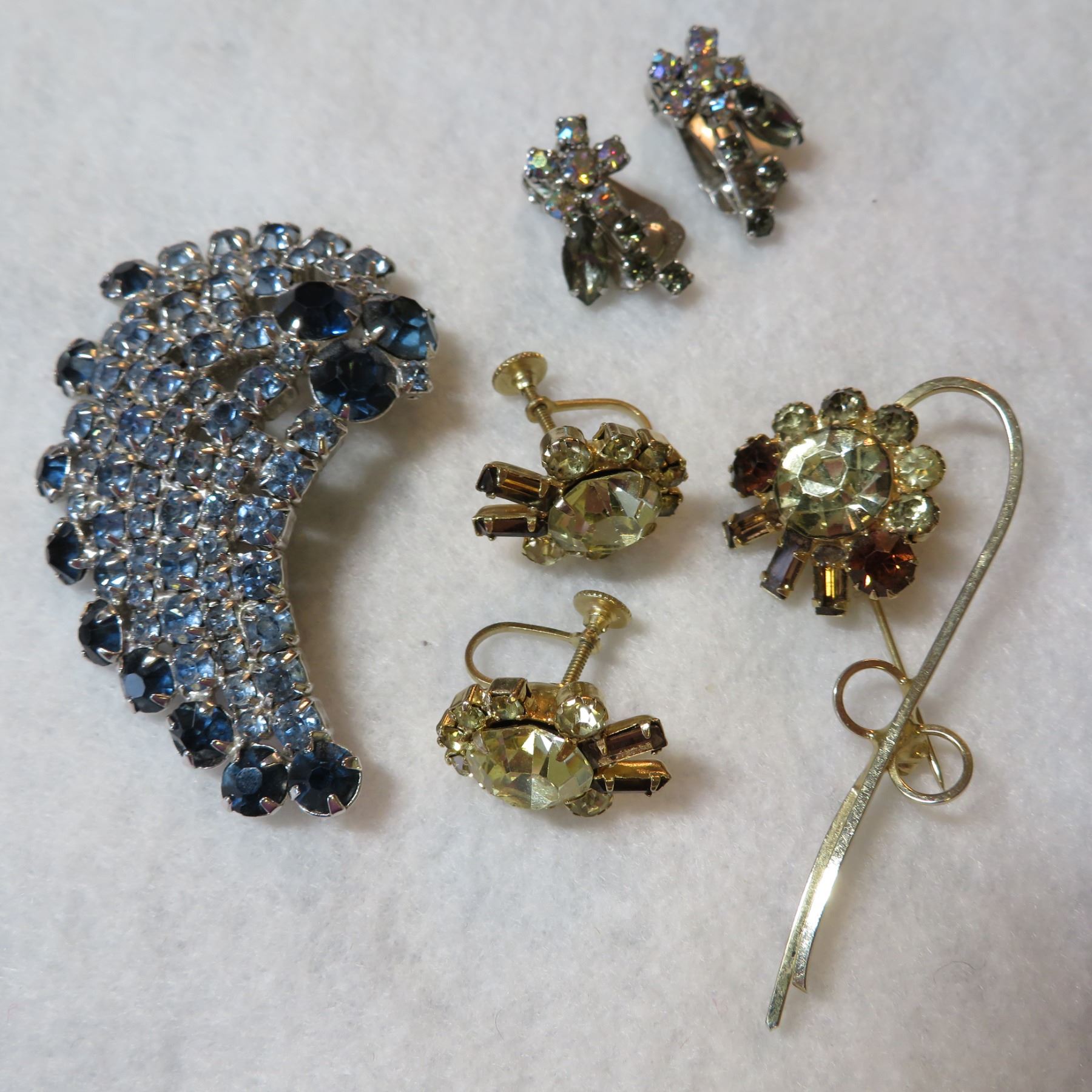 Vintage CONTINENTAL Jewellery lot. Stunning two tone blue brooch, two tone clear/black clip on earrings and matching Flower brooch and clip on earrings with yellow/amber colored stones