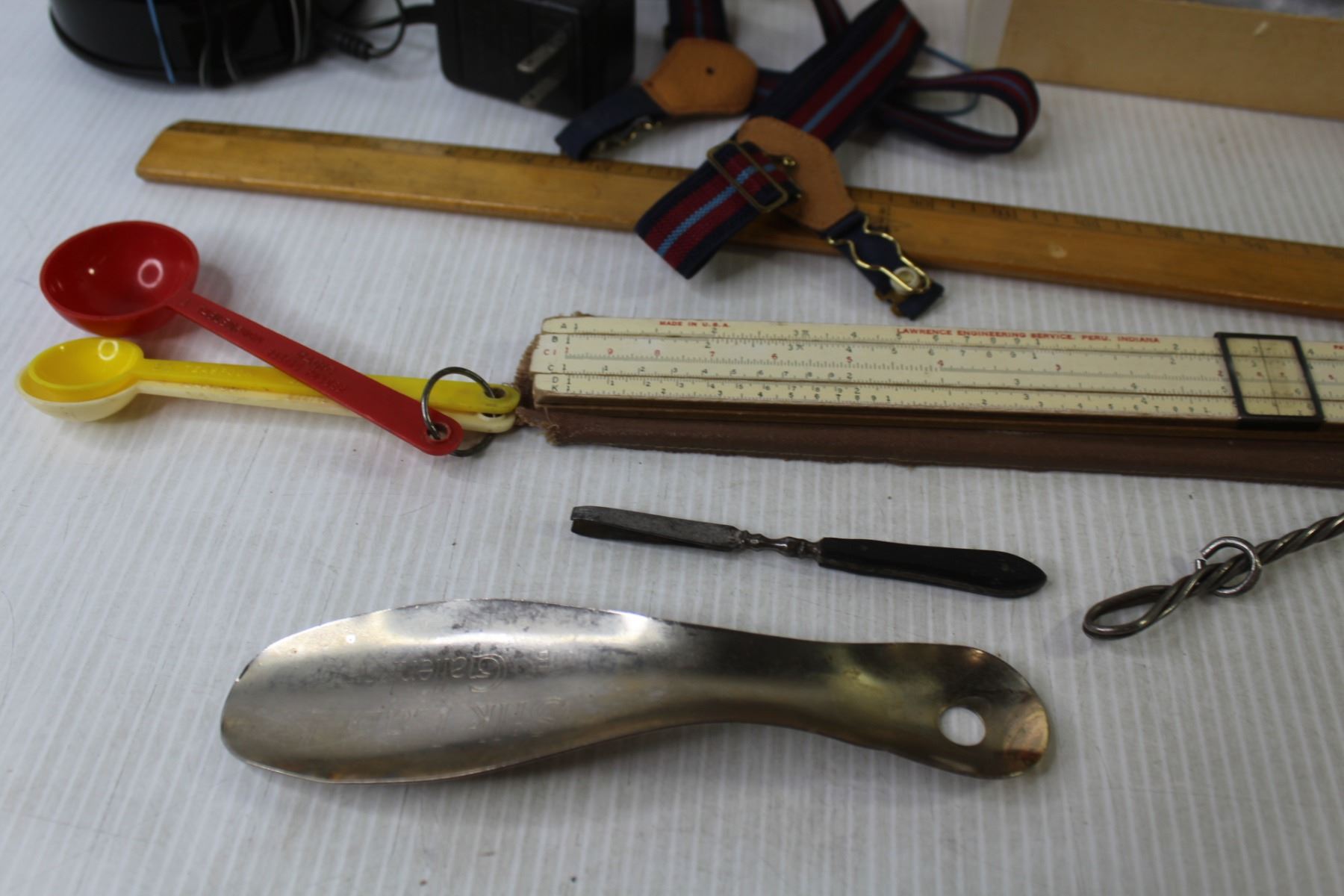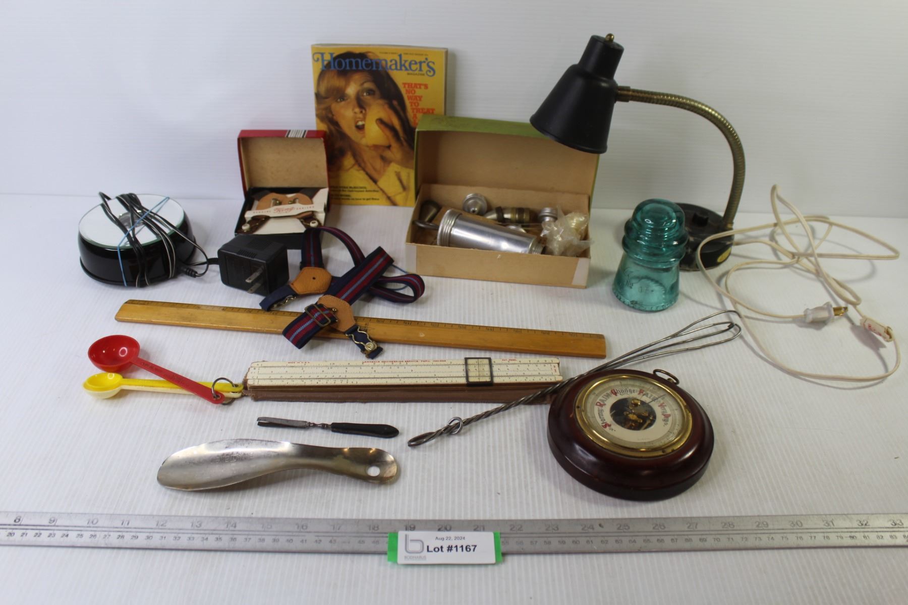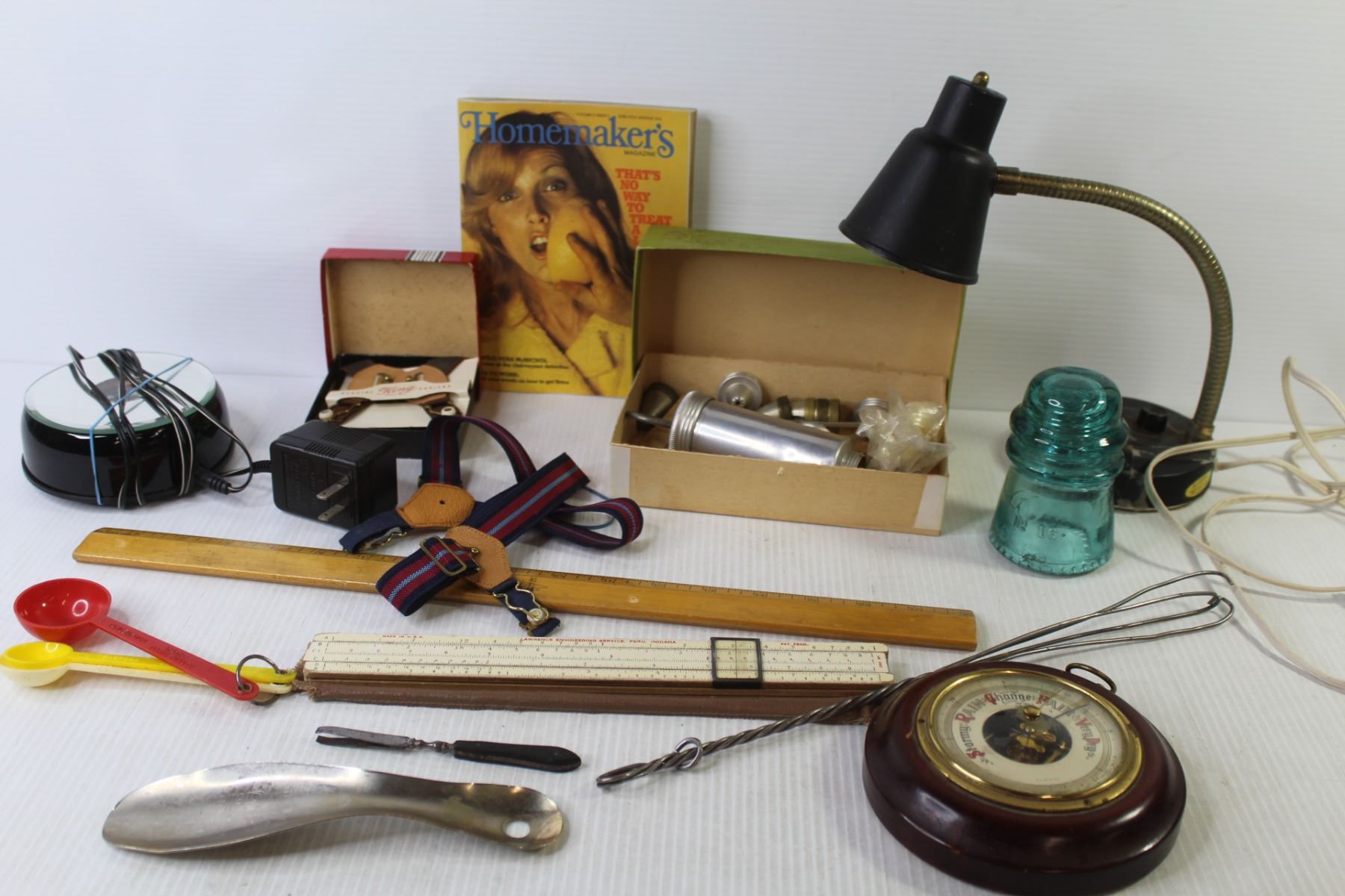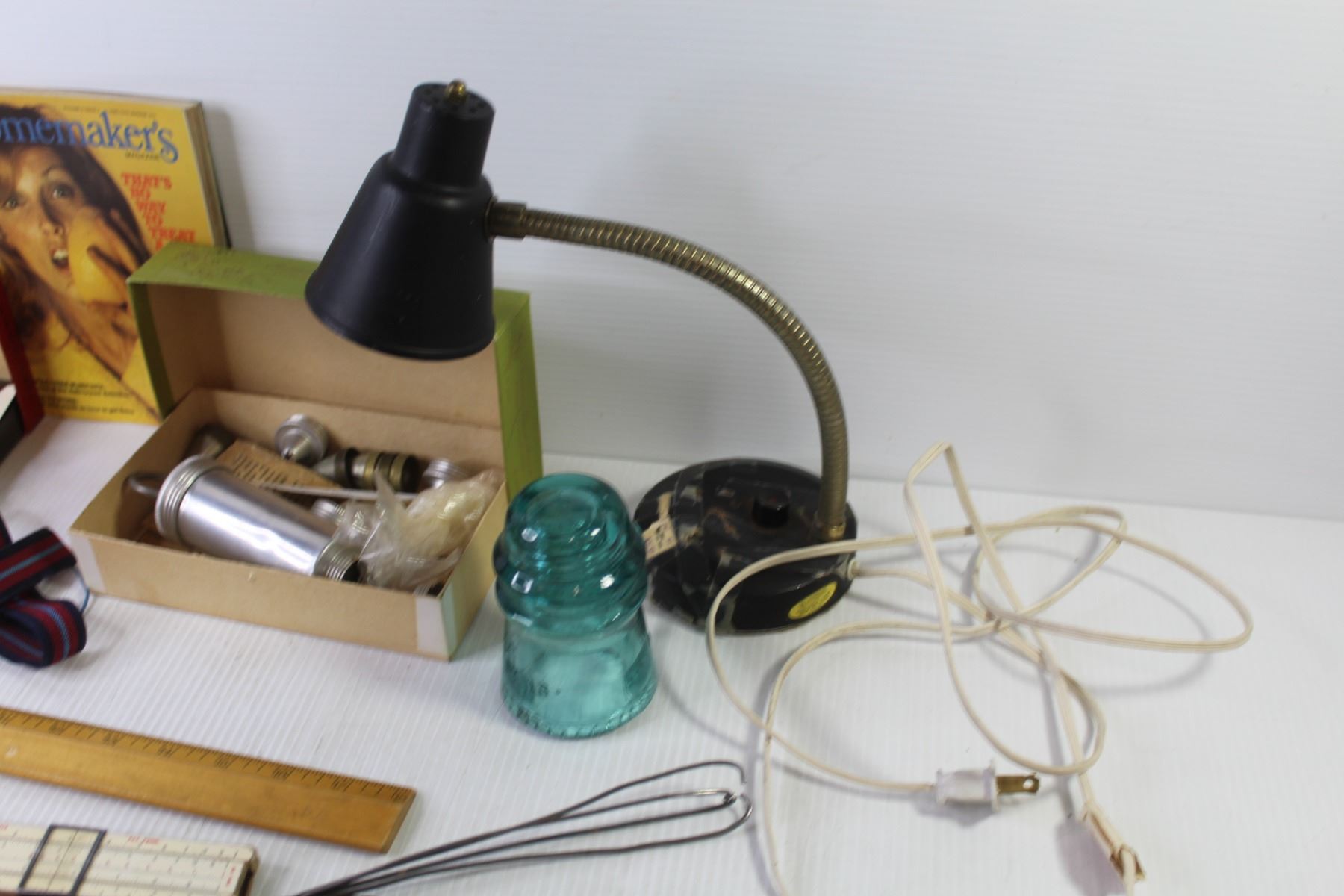 Vintage Cake Decorator - Glass Insulator - Rulers - Desk Lamp - Garters - Led Light - Vintage Tweezers - Misc. Items