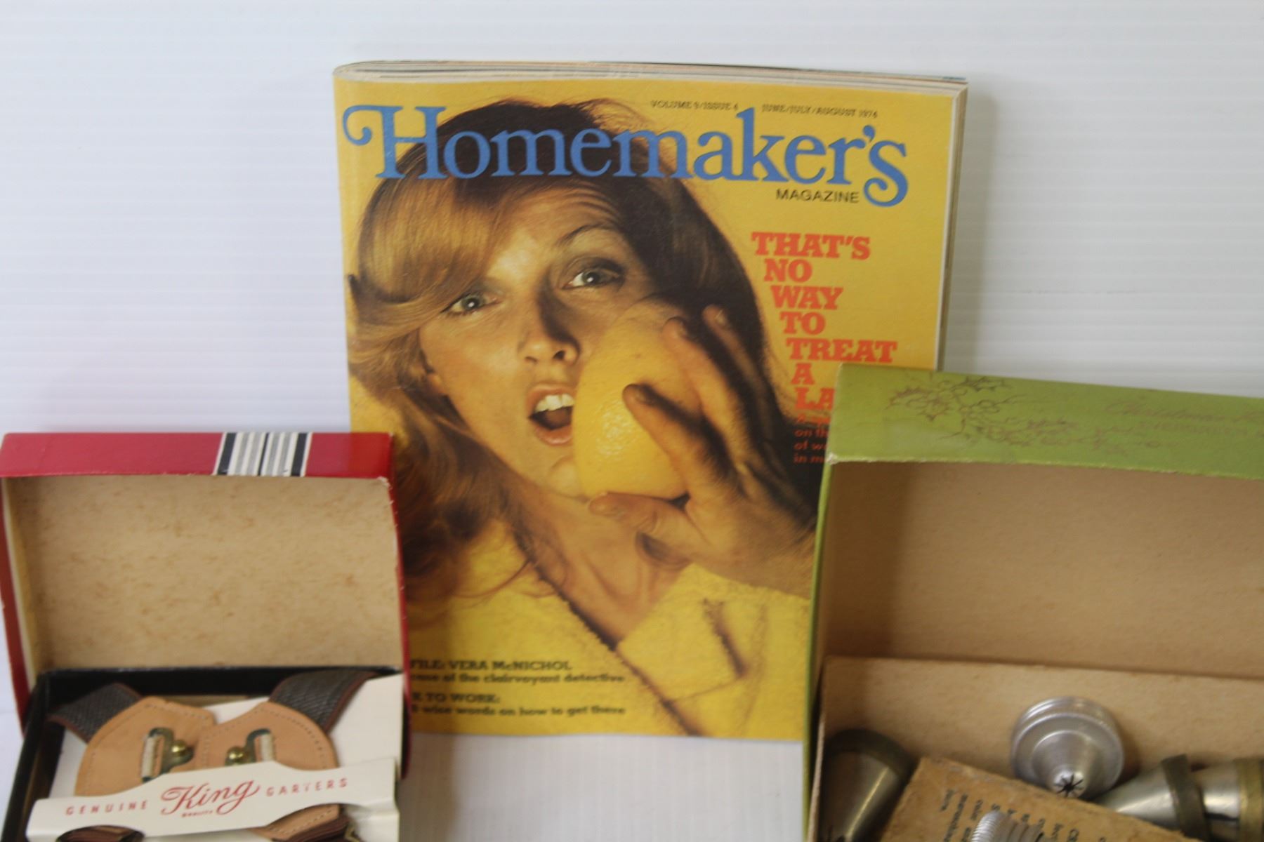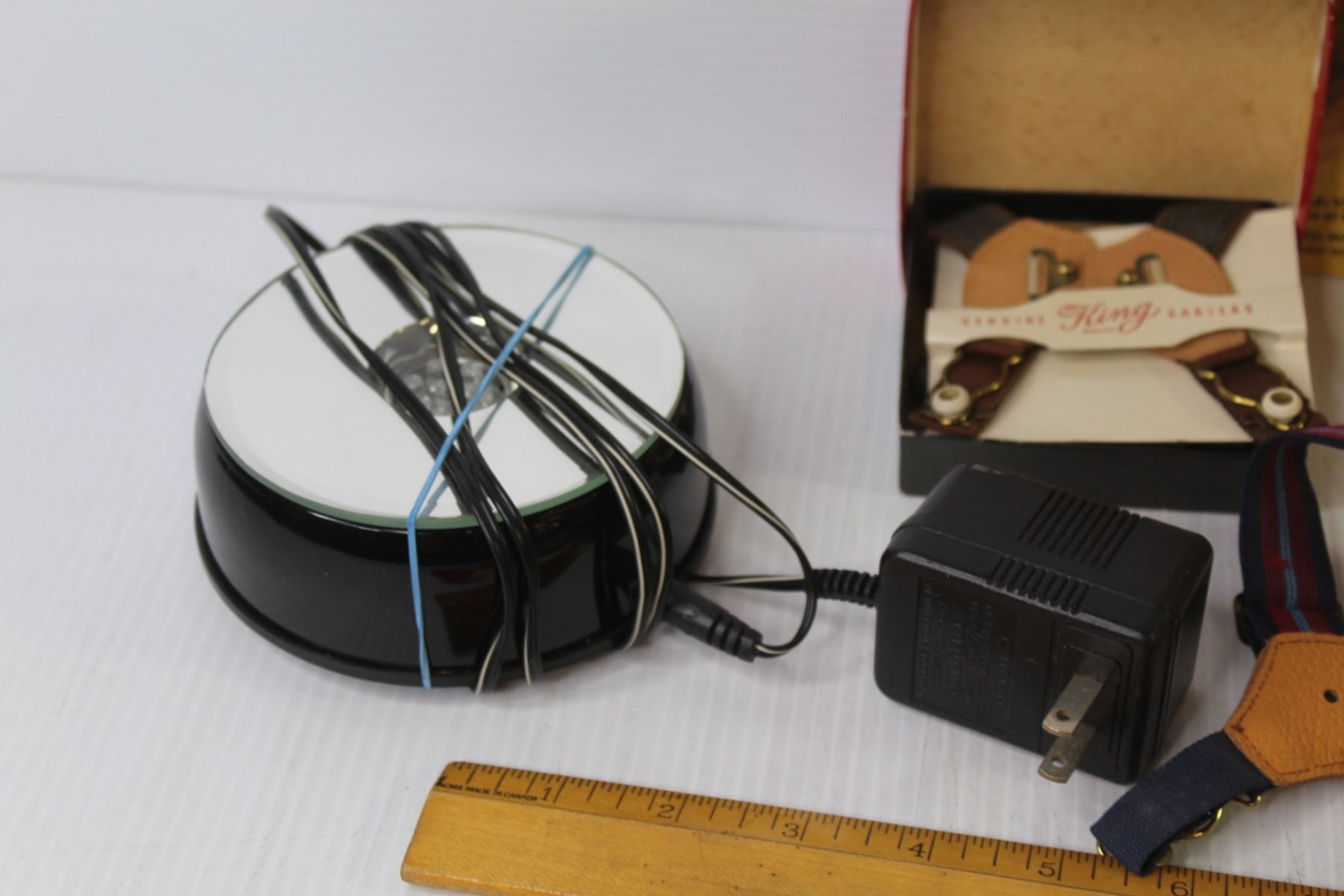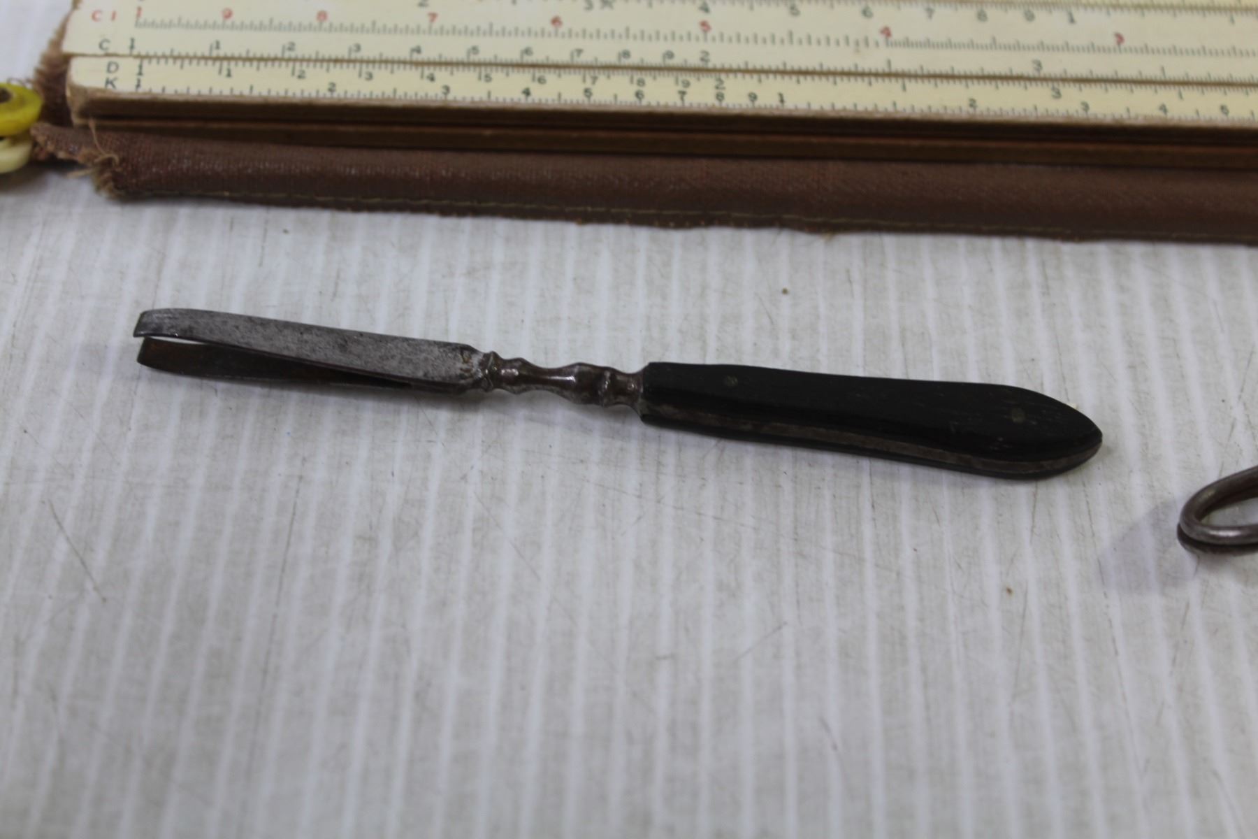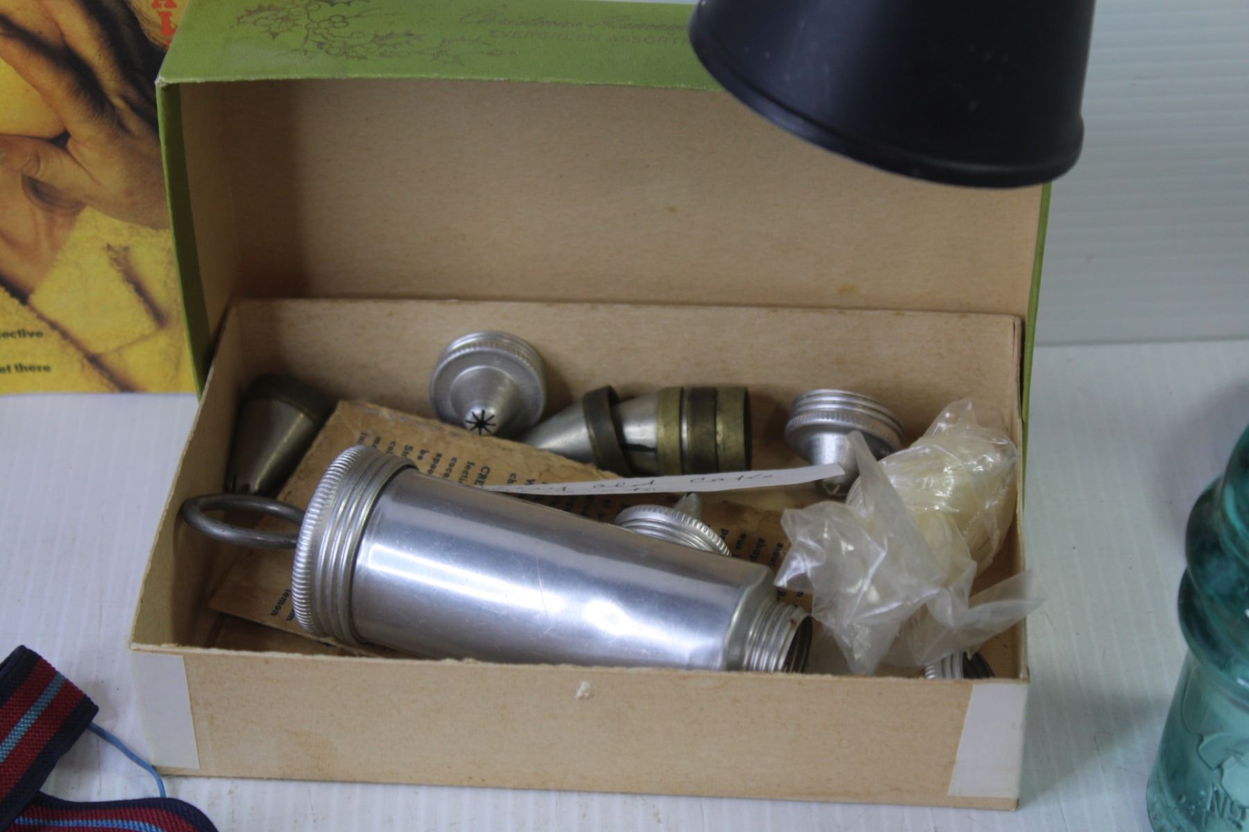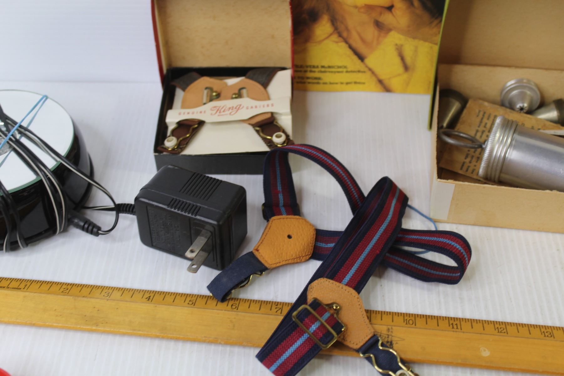 Vintage Cake Decorator - Glass Insulator - Rulers - Desk Lamp - Garters - Led Light - Vintage Tweezers - Misc. Items