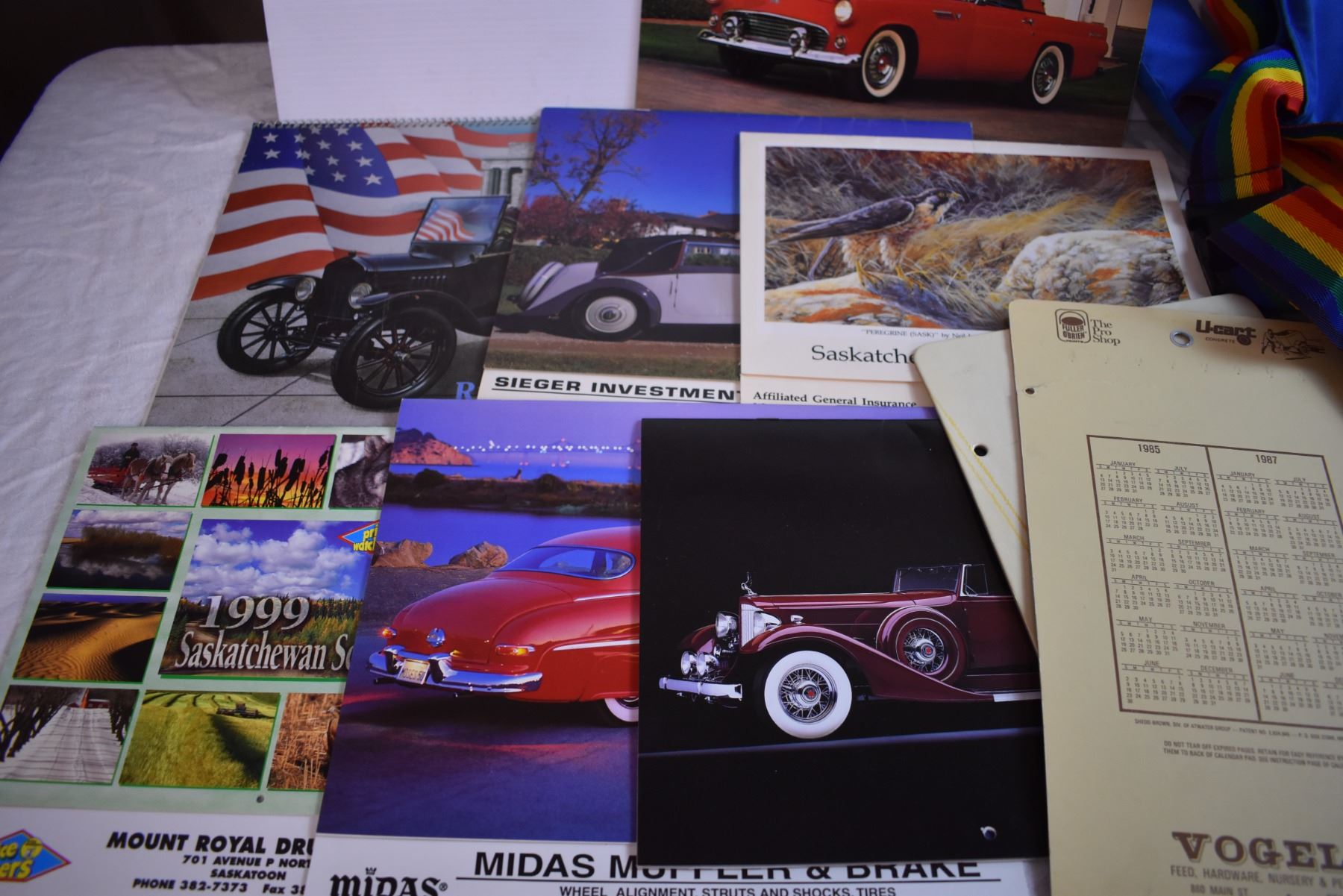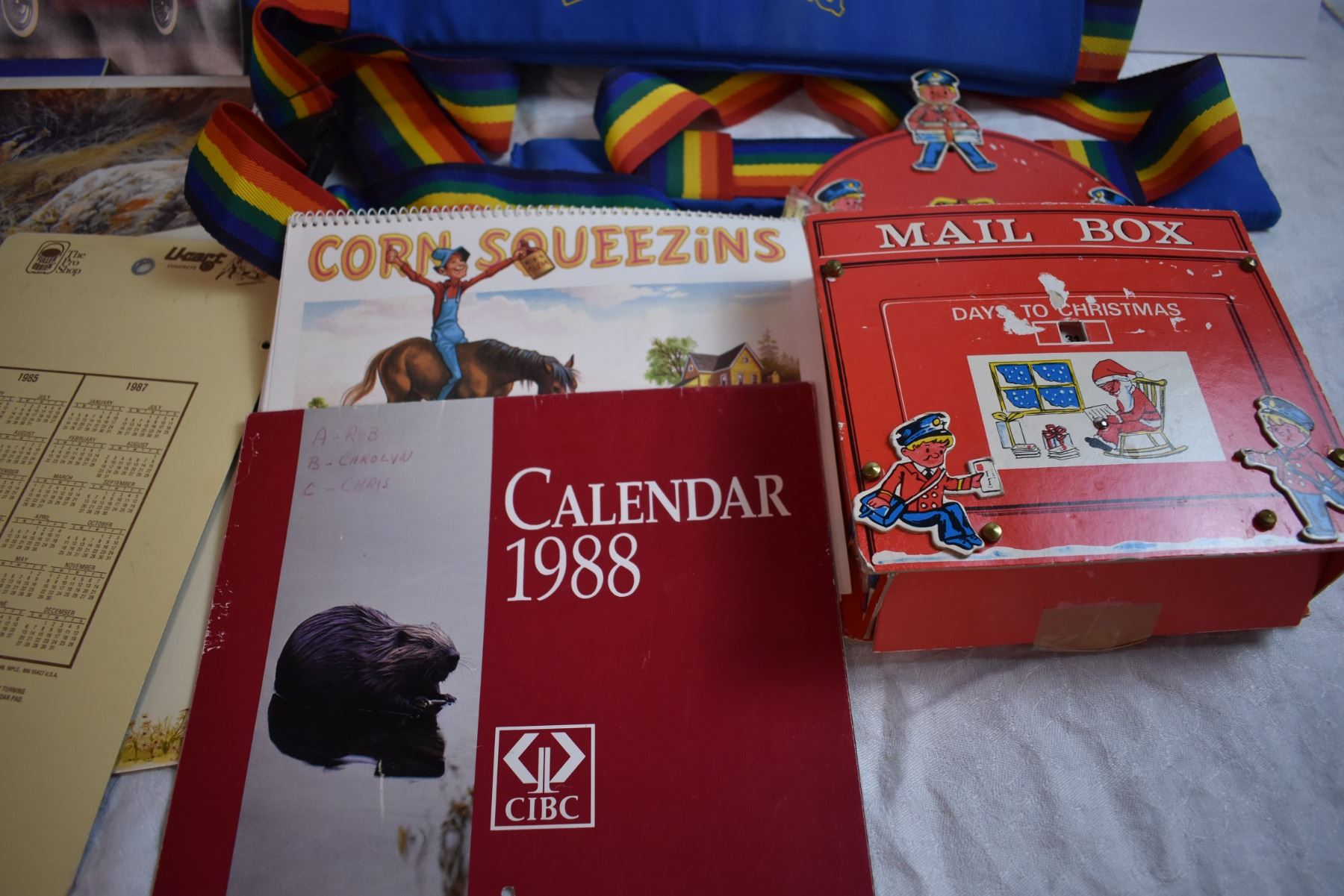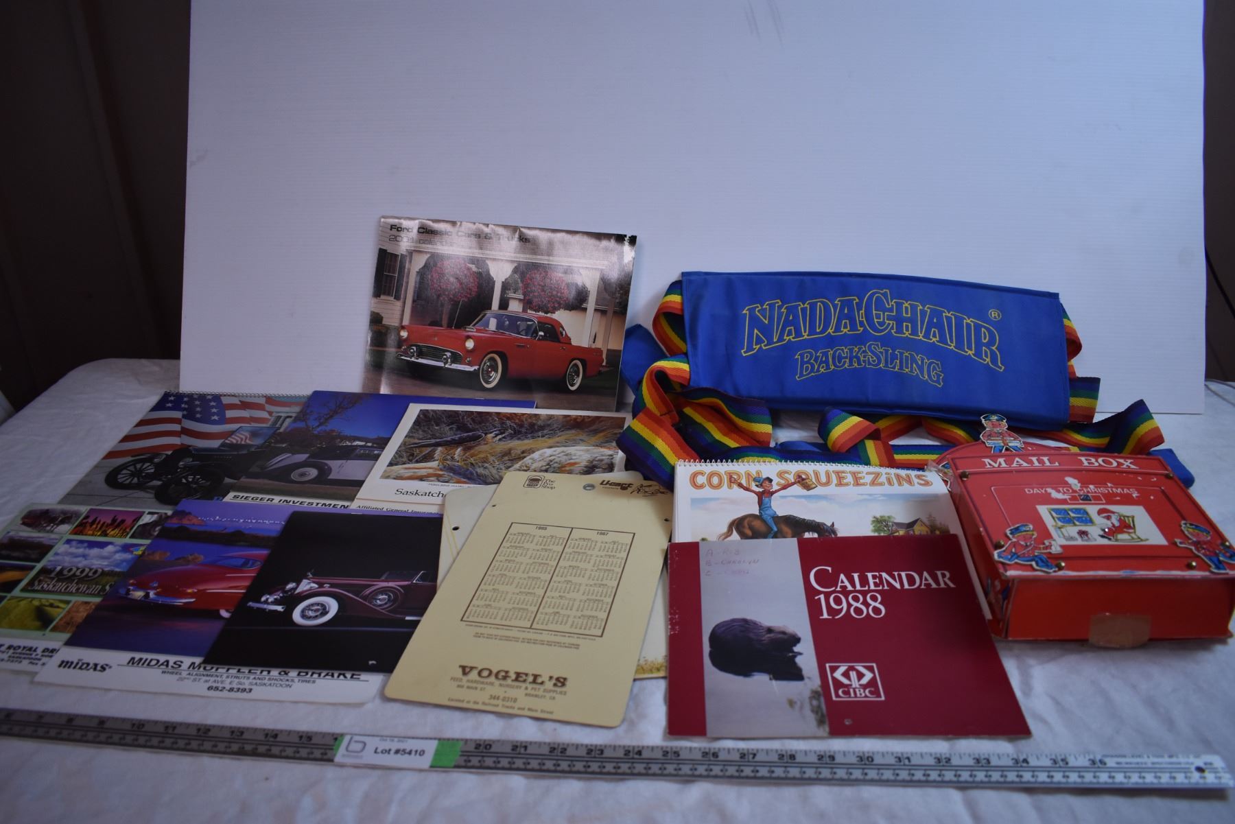 Vintage Calendars, Cardboard Toy Mailbox, and "Nada-Chair Back-Sling"