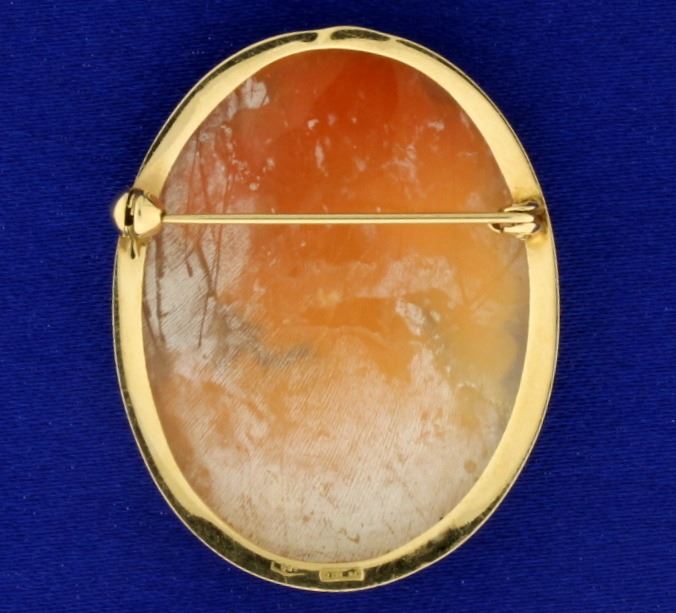 In 14k yellow gold, 1 1/2 inch long and 1 inch wide. Fine detailed craftsmanship on carved figure. 3.9g.