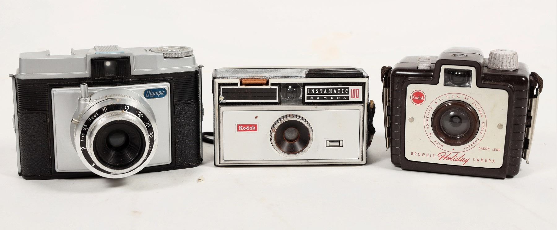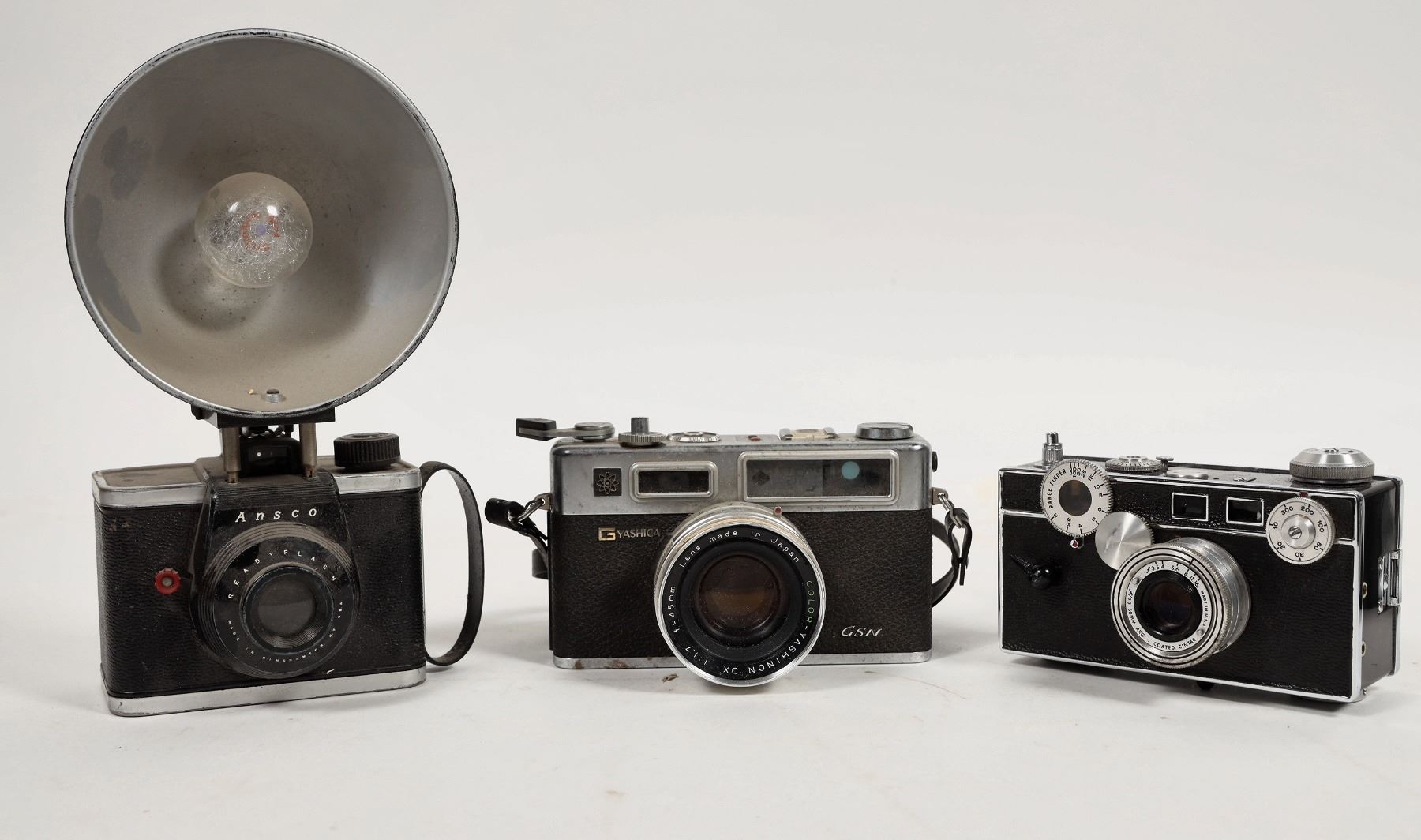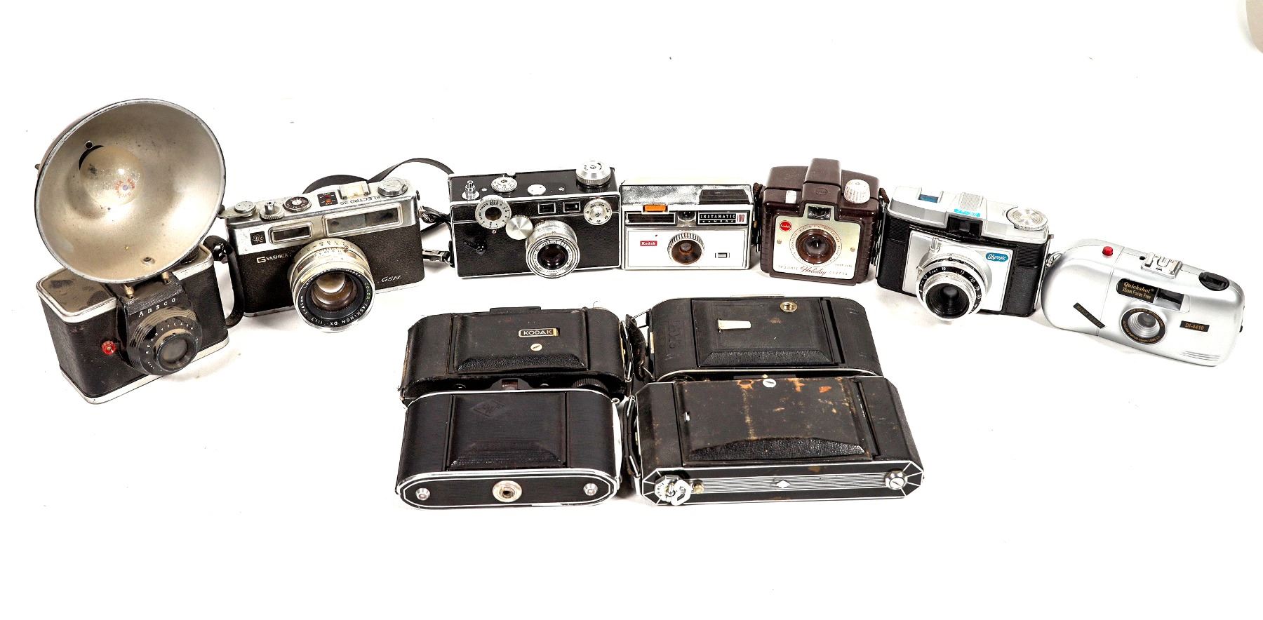 11 cameras. see photo. argus with range finder leather case, Ansco with flash, early Kodak with expanding front, Olympic closter, yoshica electro 35, brownie holiday in box, agfa solette in case, possible Kodak sport model in case, Kodak with opening front, quick shot D14410, Kodak Instamatic.