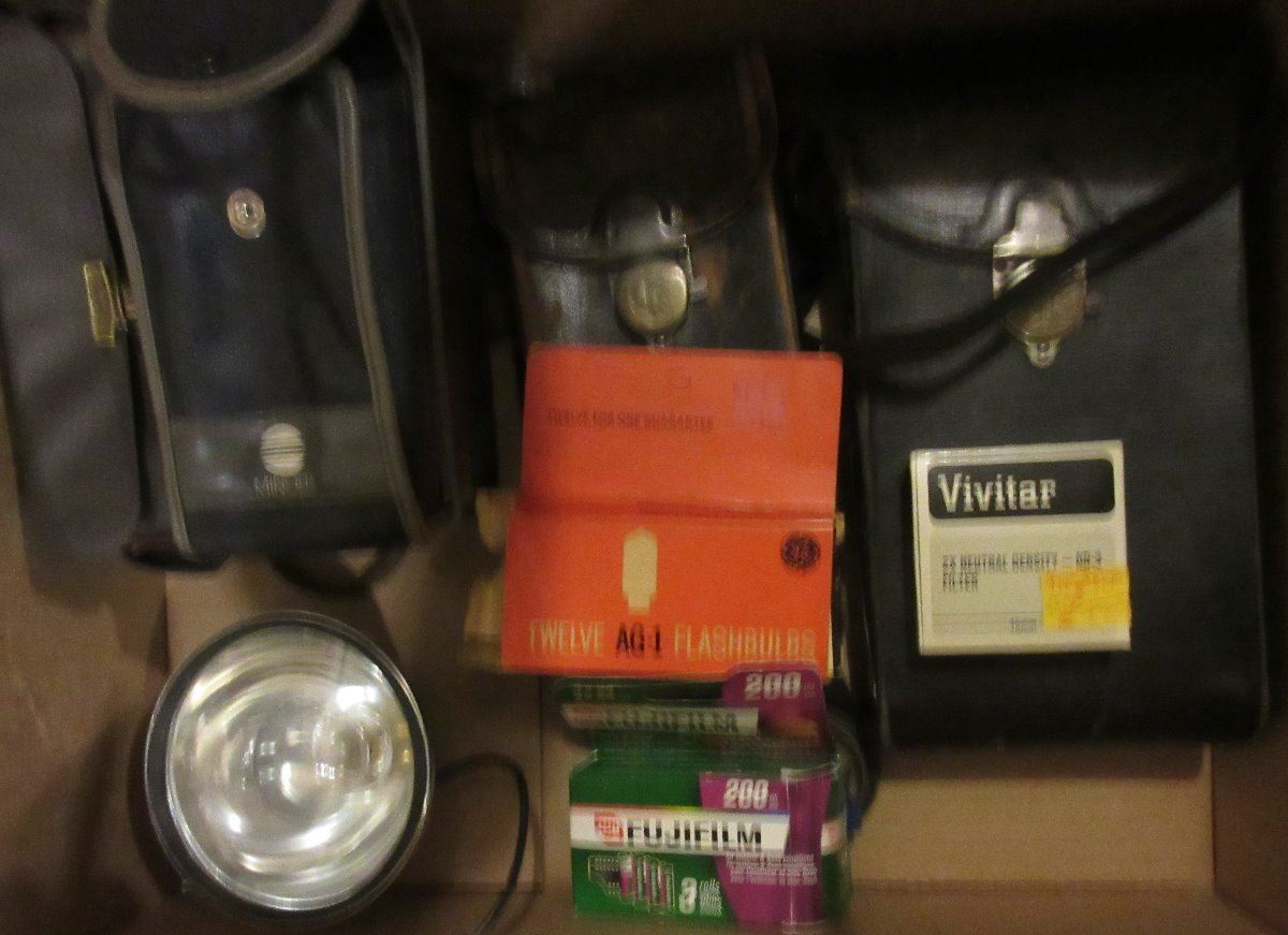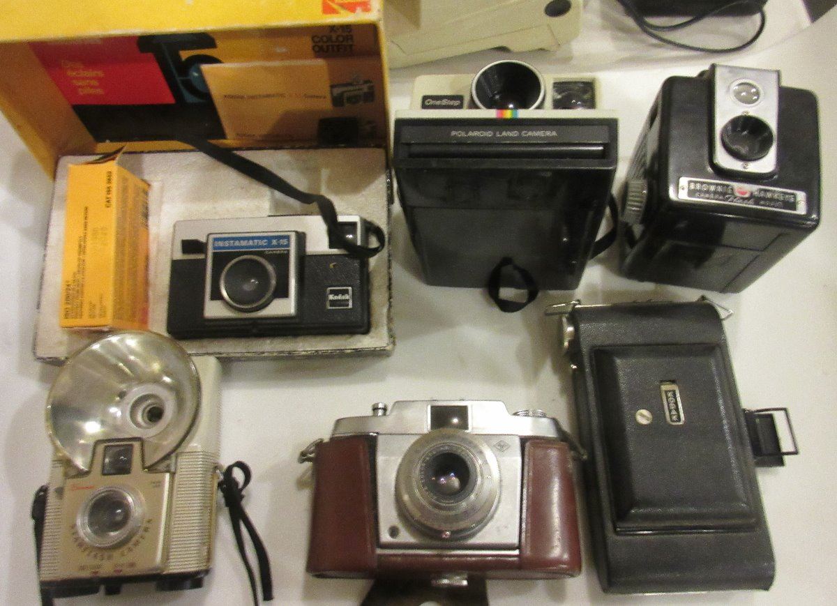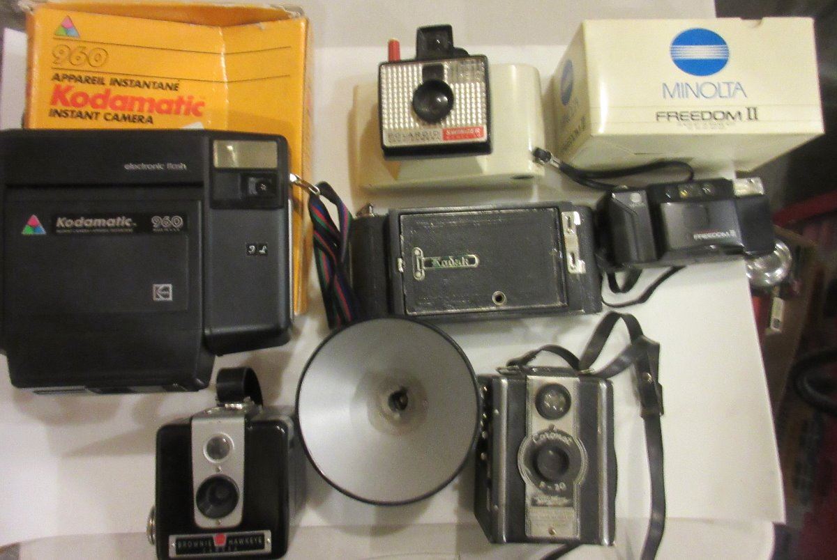 Vintage cameras : Kodomatic 960 in original box, Polaroid land Camera Swinger Model 20, Minolta Freedom II in box, Brownie Hawkeye, Coronet F-20, Kodak, Kodak Instamatic X-15 Color (in Box) One Step Polaroid Land Camera, Kodak Brown Hawkeye Flash Model, Starflash color or B/W, Sillette Pronto in Carry case, Kodak, Cases, Lenses and flashes