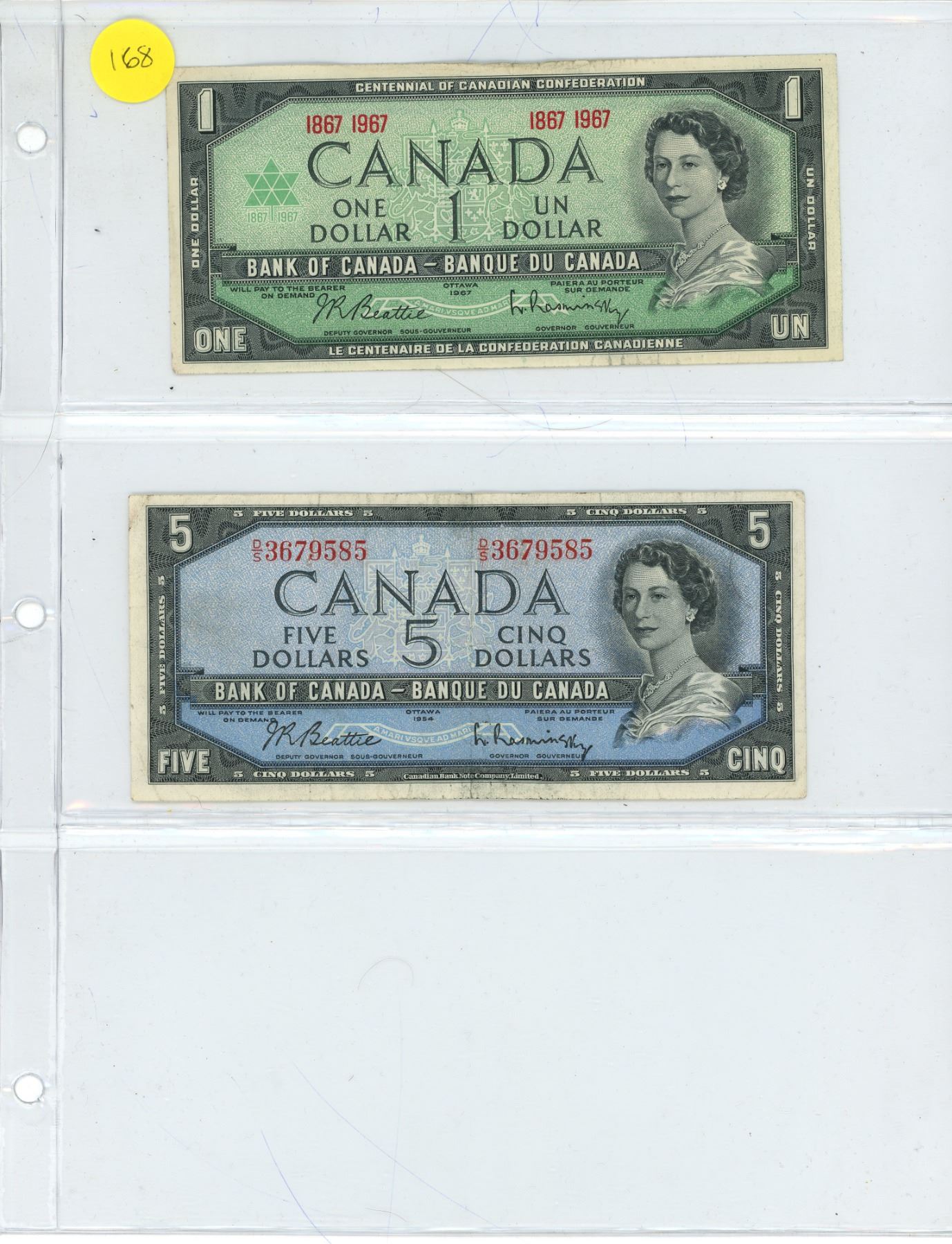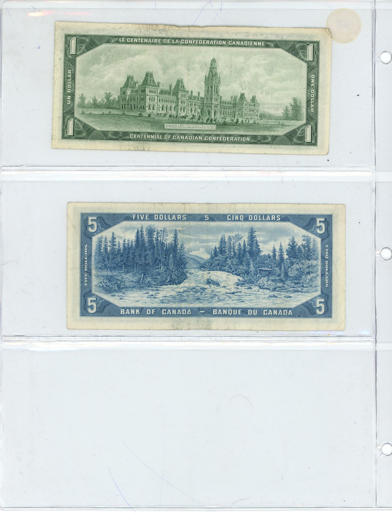 Vintage Canadian Bank of Canada (1) 1 Dollar Centennial of Canada Confederation 1967 & 5 Dollar Canadian Landscapes Series