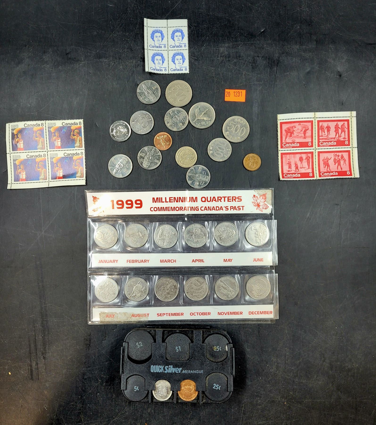 Vintage Canadian Stamps, 1999 Canadian Millennium Quarters, & Assorted Coins