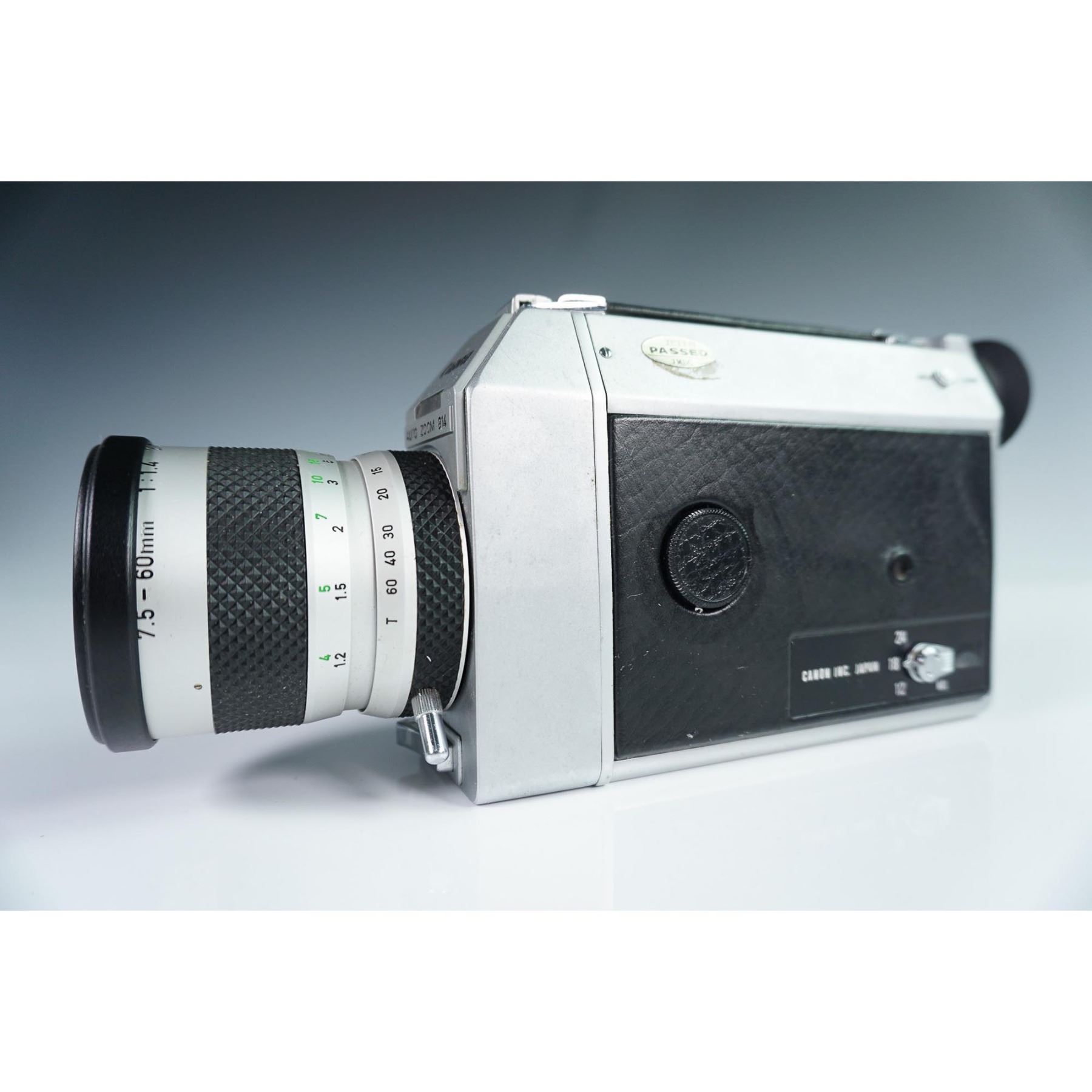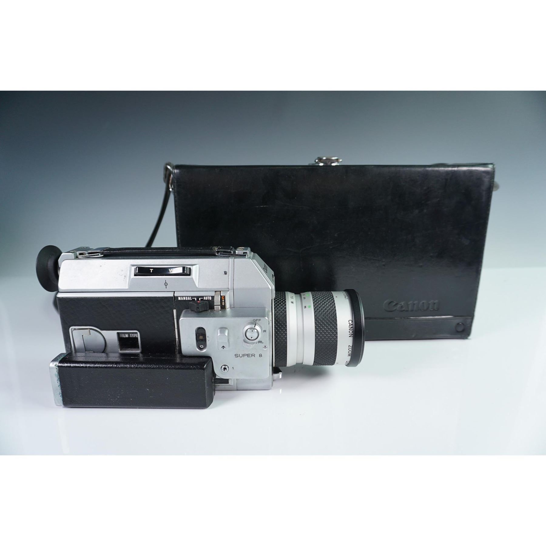 This listing features a classic Canon Super 8 movie camera from the 1960s-70s era. The camera showcases a distinctive silver and black design with "SUPER 8" clearly marked on the body. It comes equipped with a Canon Zoom lens (7.5-60mm) featuring manual and auto functionality. The camera has various control switches including manual/auto settings and a film type selector. Included is the original black Canon carrying case. This vintage filmmaking equipment represents classic analog movie-making technology in good cosmetic condition, perfect for collectors or enthusiasts of vintage photography equipment.