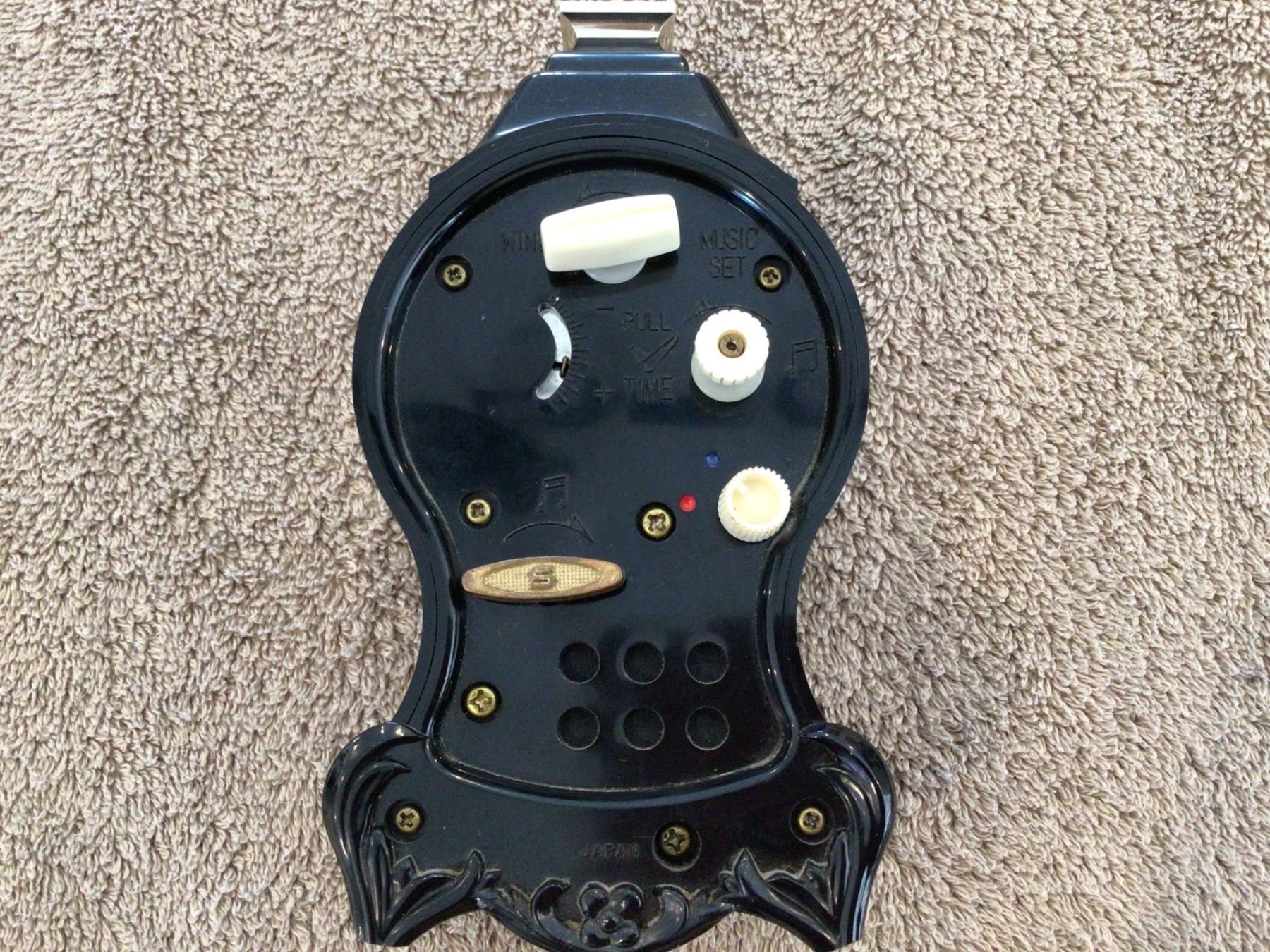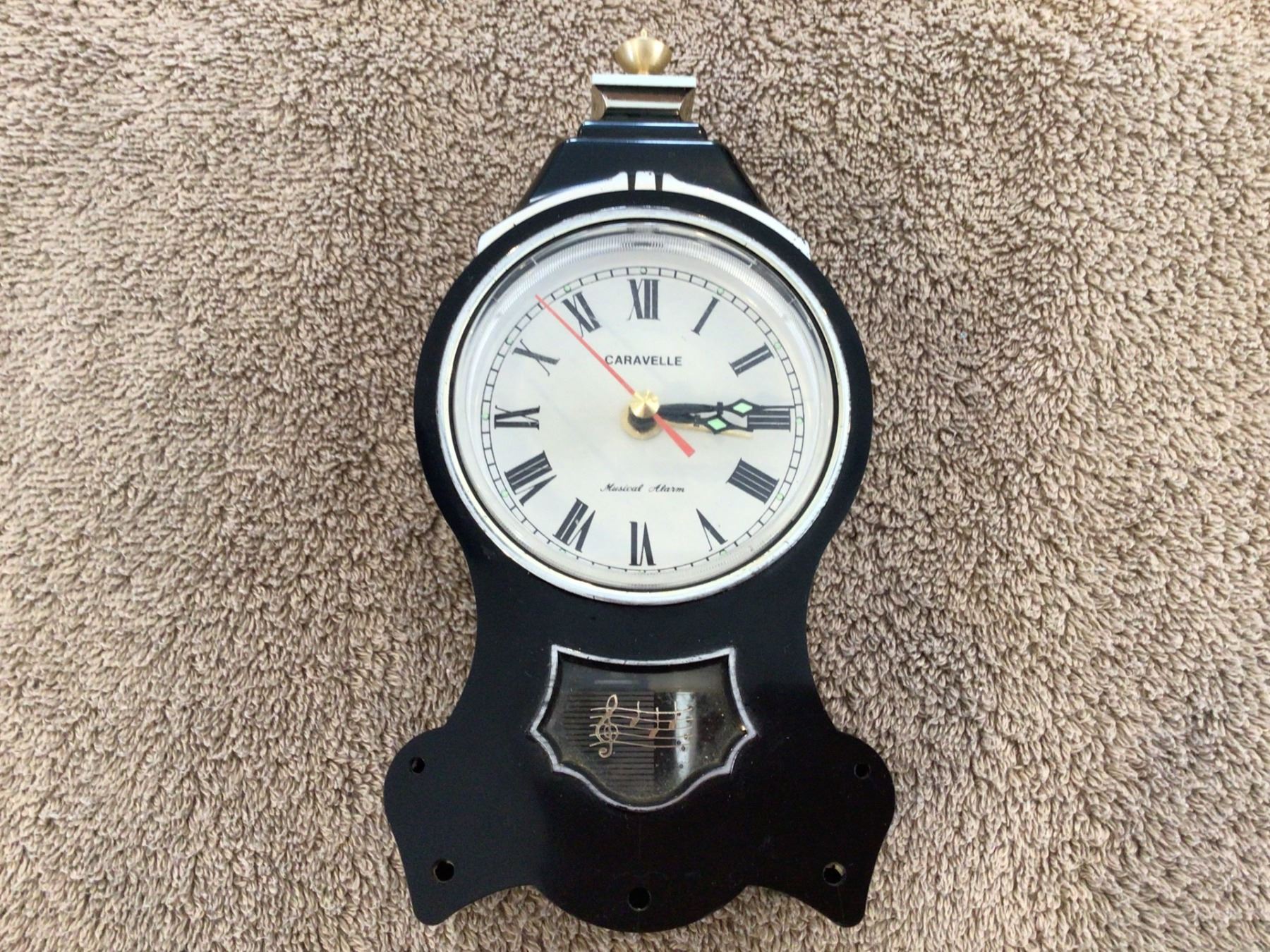 Vintage Caravelle (Japan) wind up musical alarm clock. Celluloid, black and silver. Works. 7" tall