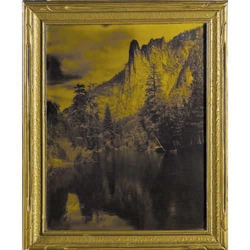 <B>Carleton Watkins Vintage Goldtone of Yosemite</B></I> made from the original negative and in original frame. Sight size is 10.25" x 13.25", framed in gilt to 13.5" x 16.5". Carleton Watkins (1829-1916) was one of California's early commercial photographers. He left New York at age 21 and worked for awhile in San Jose as a daguerreotype operator before establishing his own business. On an early 1860s trip to Yosemite he found his inspiration, making 30+ large glass plates and 100+ stereoviews of the breathtaking scenery. Artistically, these photographs followed the style of many of the popular landscape painters of the era, especially those of the Hudson River School and also the Western landscapists such as Bierstadt and Moran. His images were the first photographs of Yosemite to be seen by most easterners and even influenced President Lincoln to sign a bill in 1864 protecting the valley, thus paving the way for the National Parks system. <BR><BR>This stunning orotone (goldtone) of a lake and mountain scene was made by printing the original negative on sensitized glass, then backing it with genuine gold dust mixed (likely) with banana oil. This photographic process offers a depth and beauty that is hard to describe. Please see the enlarged view on our website to get a better idea of the quality of this photo. Excellent condition.<BR><BR><b>Shipping:</b> Framed - with Glass, Medium (<a target="_blank" href="http://www.heritageauctions.com/common/shipping.php">view shipping information</a>)