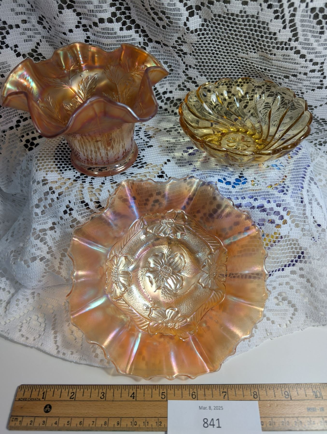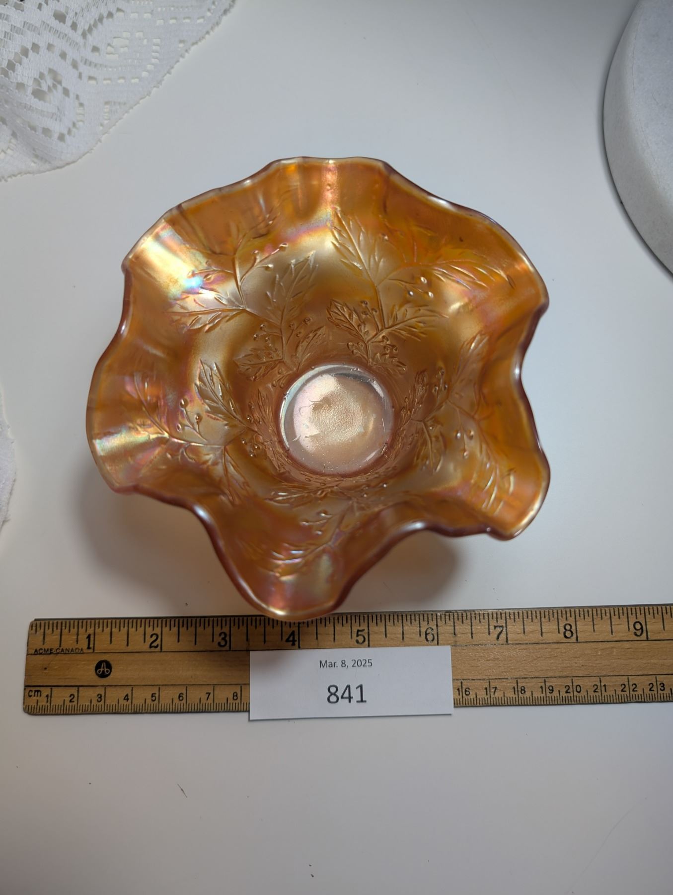 Vintage Carnival Glass Hat and Dish Marigold Ruffled Edge with Embossed Floral Design