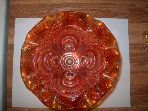 Vintage Carnival Glass Marigold Compote, Pattern both S **|**|** Vintage Carnival Glass Marigold Footed Bowl Compote. Pattern on both Sides. Measures approx. 4 1/2 inches tall & approx. 7 inches wide. White marks from camera reflection. Excellent Condition.