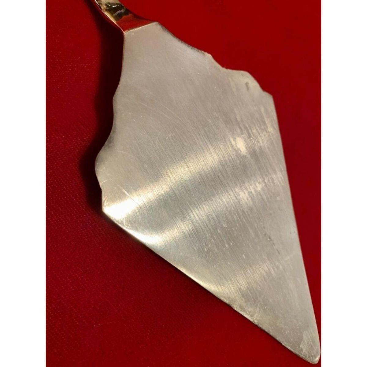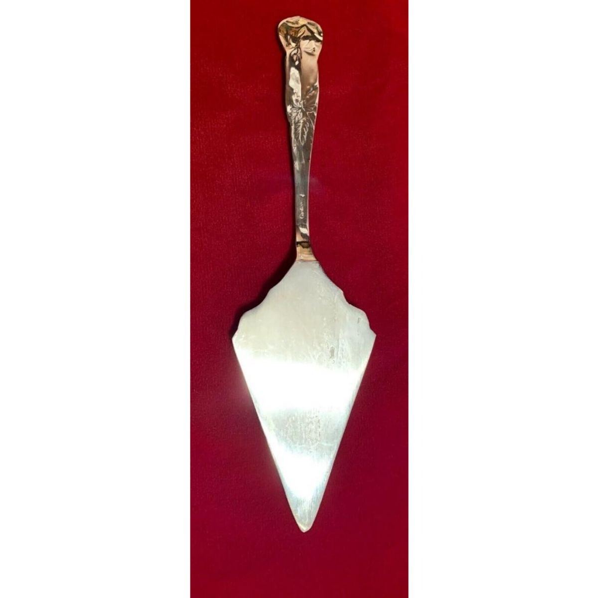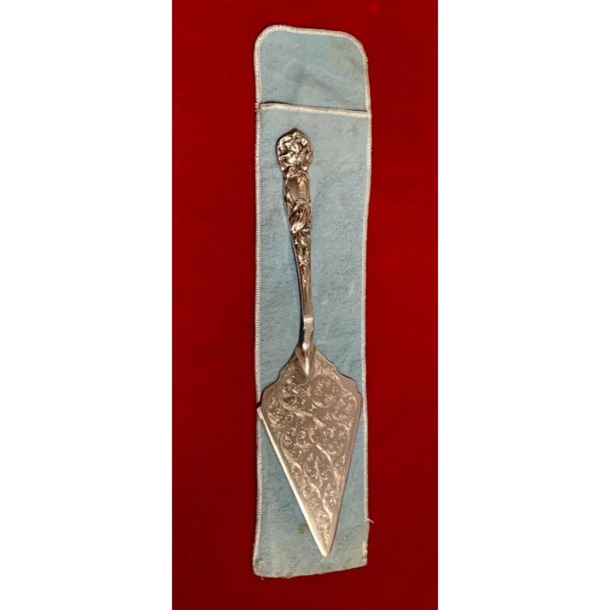 Vintage stamped Cartier rose-design repousse silver-plate wedding cake server with etched design on serving area & repousse rose design on handle. 12" L X 3 3/8" W. Comes with original storage cloth.