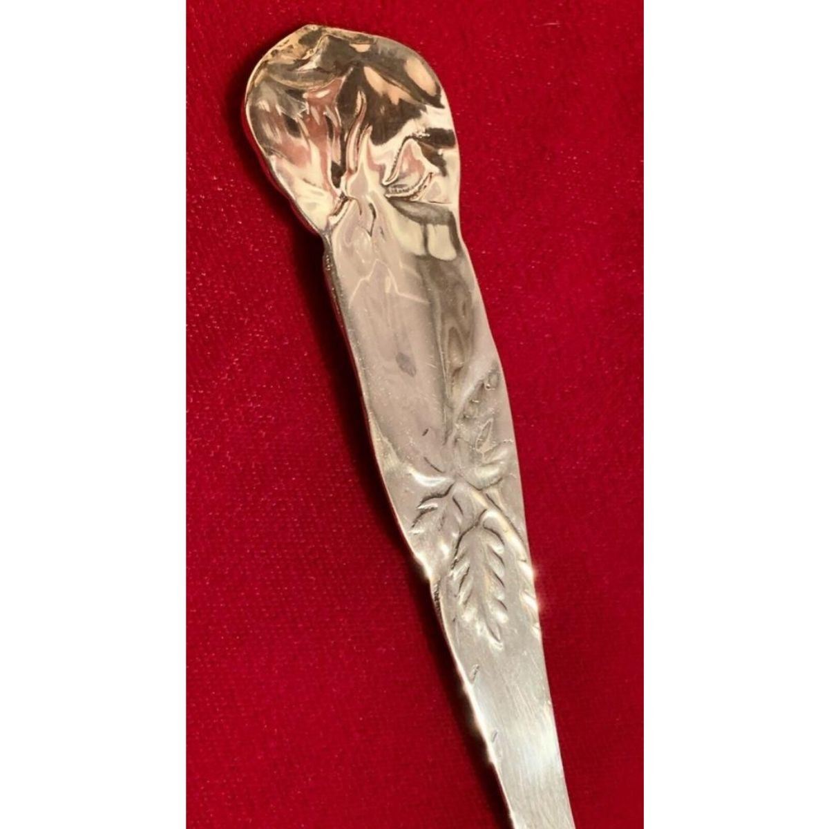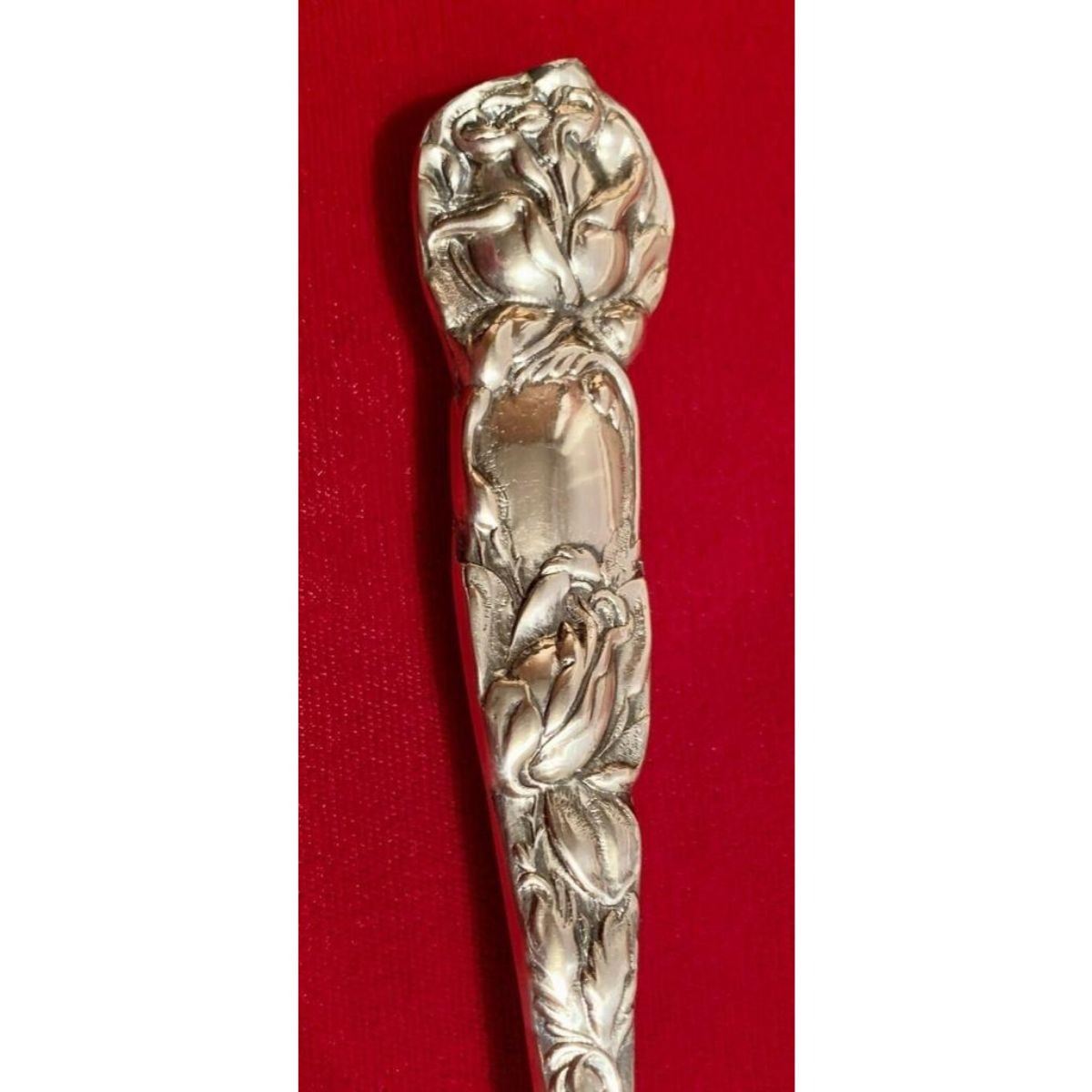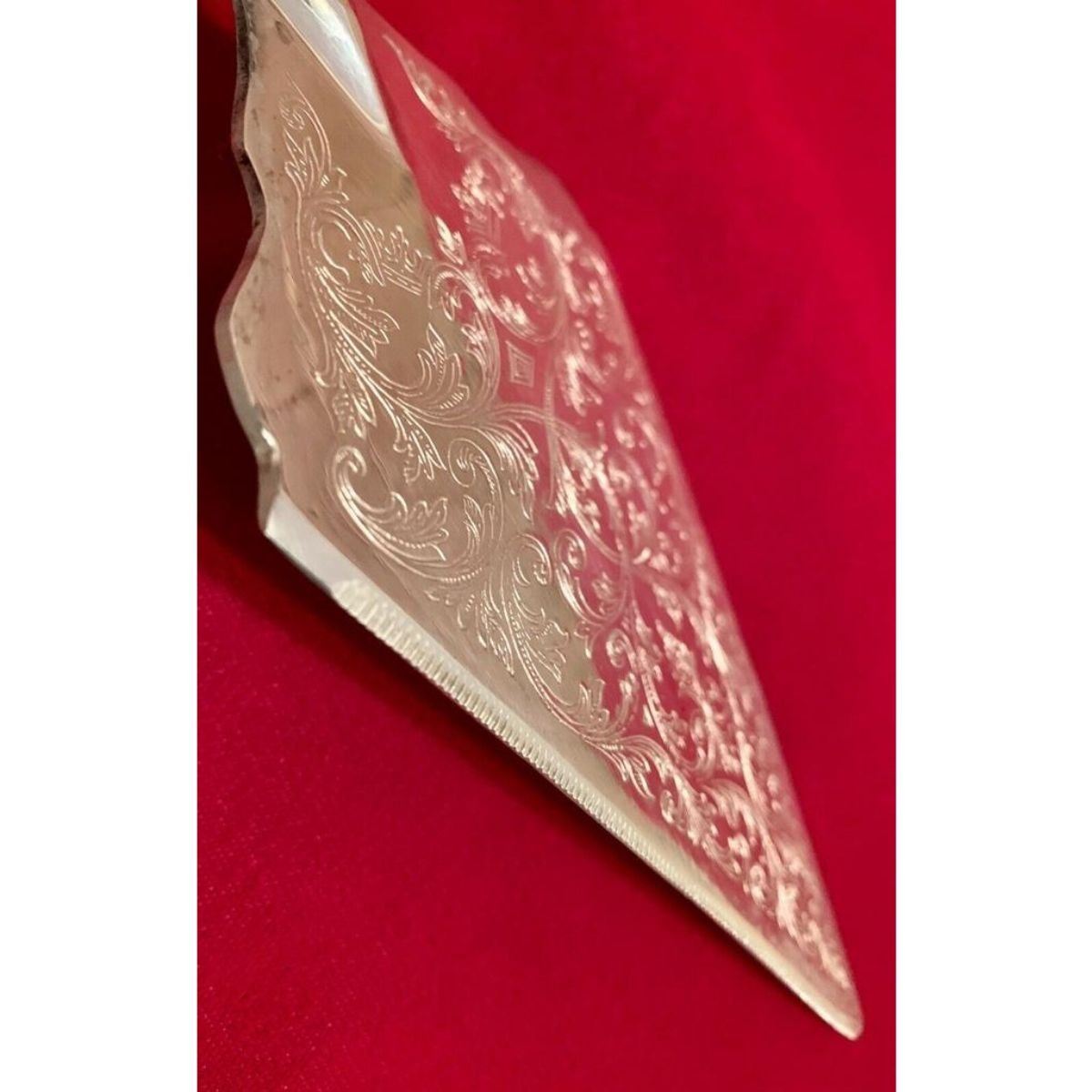 Vintage stamped Cartier rose-design repousse silver-plate wedding cake server with etched design on serving area & repousse rose design on handle. 12" L X 3 3/8" W. Comes with original storage cloth.