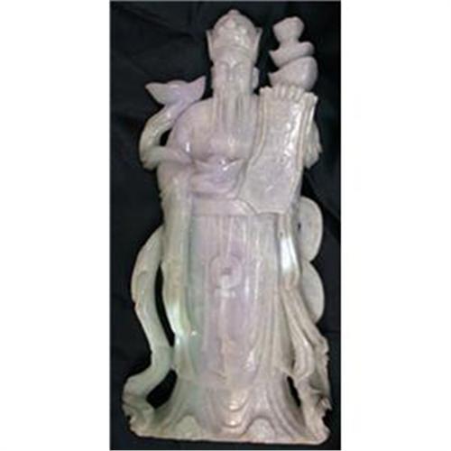 Finely detailed carved jade Celestial of Prosperity. This piece was given as a gift by a Chinese trade legation in Bulgaria. This is a finely detailed and polished green jade that is untreated, undyed, and completely natural. This exceptionally carved piece of jade is 5.25" by 1.50" at the base and is 12.25" in height. This piece is appraisal priced at $8,900.00.