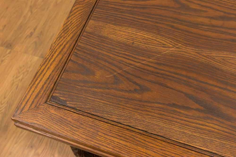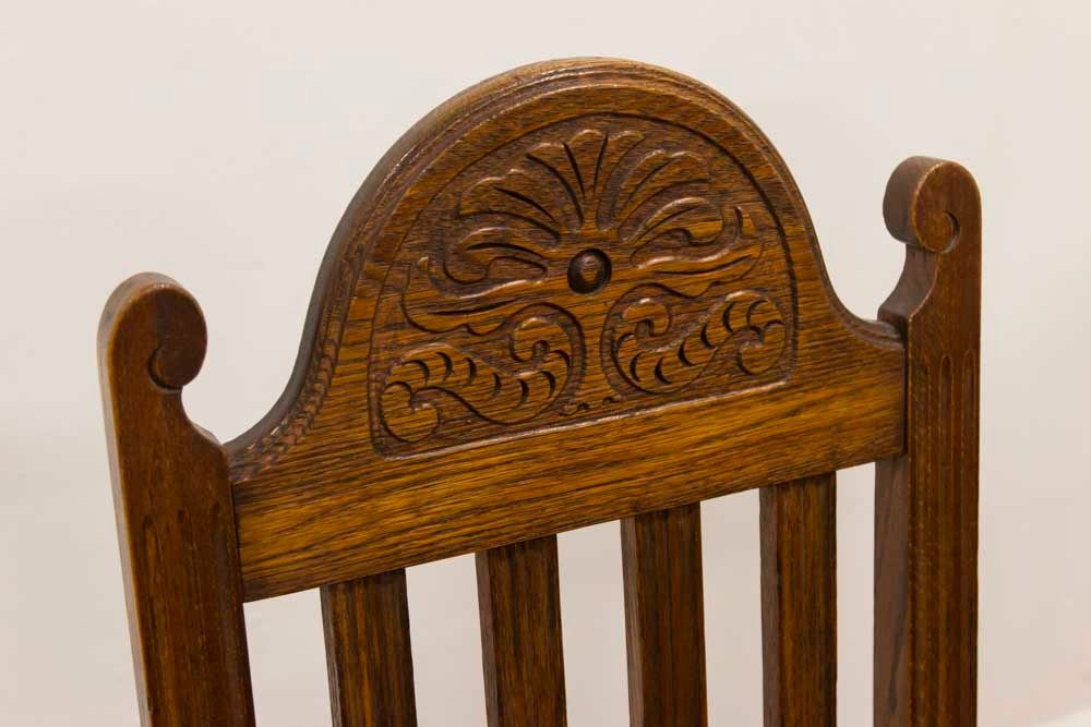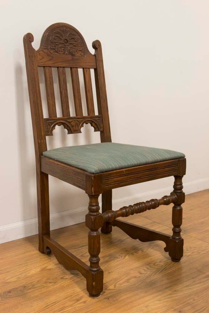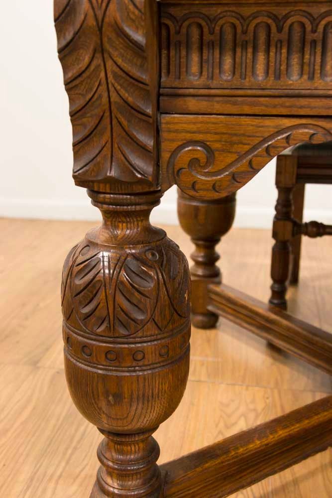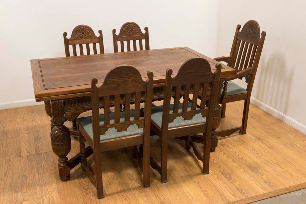 With baluster shaped legs. Carved apron. Opens to 12', approx. 62" L x 38" W closed. With 5 matching chairs (1 armchair and 4 side chairs).