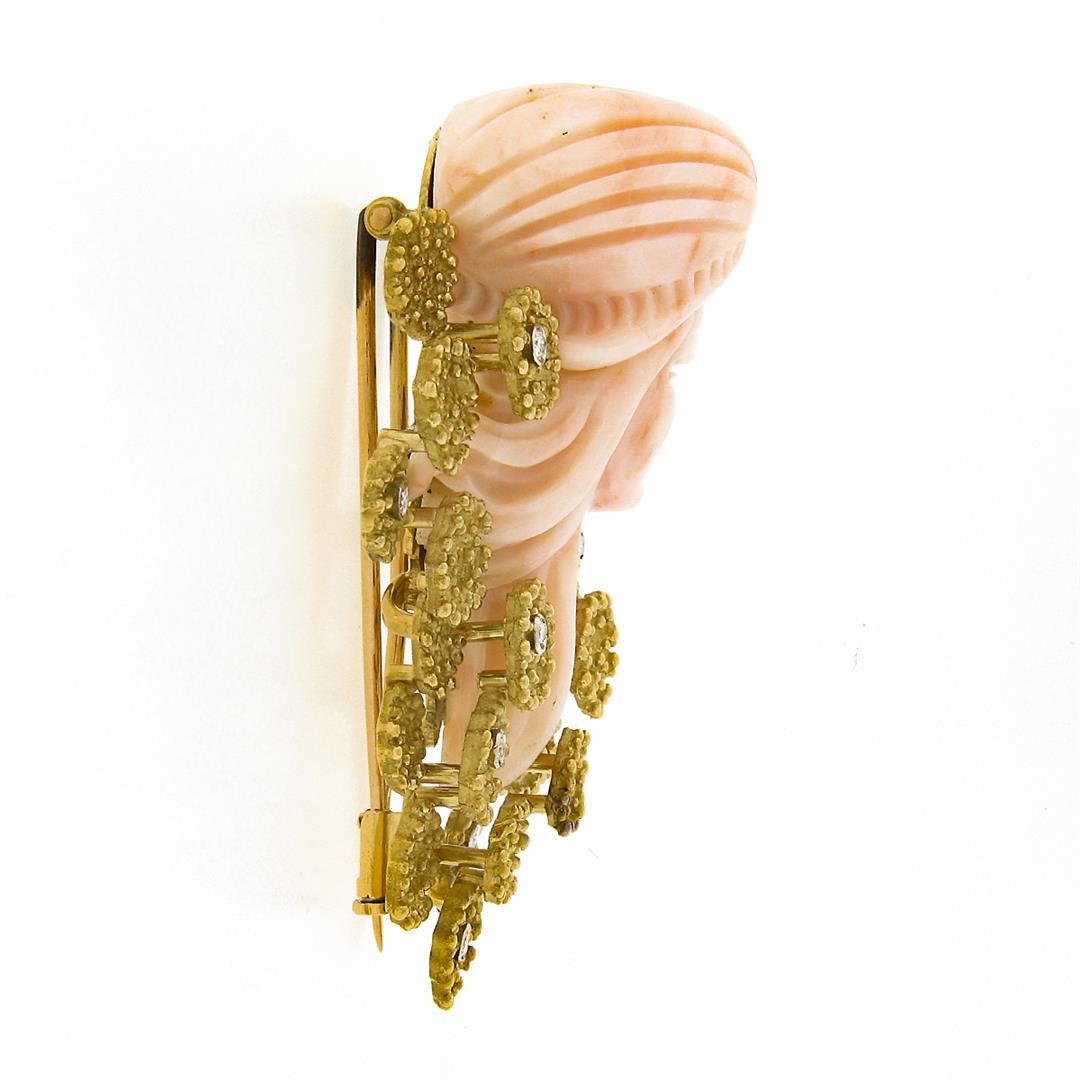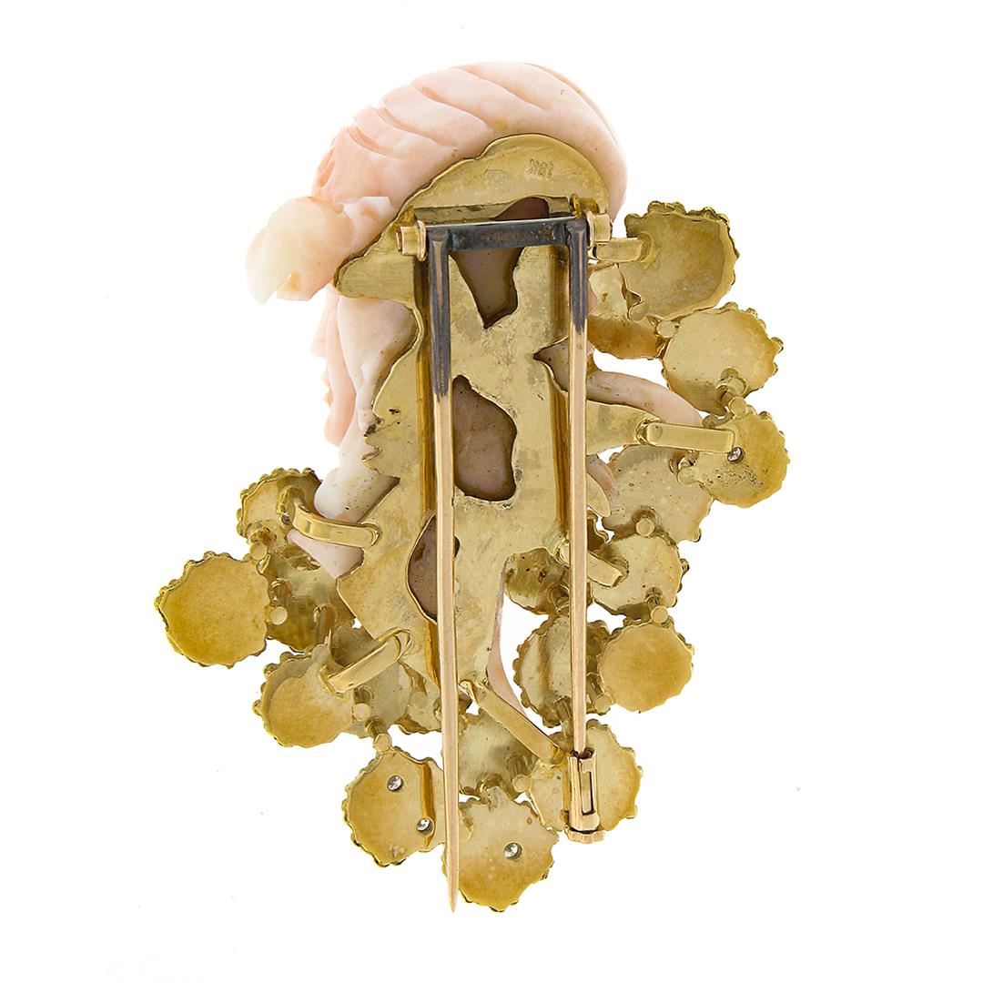 A vintage solid 18k yellow gold brooch, with 1 carved natural coral (47.40x36.0mm), and 8 round brilliant cut natural diamonds (G/H - VS2/SI1 ; 0.24ctw). Measures 61.70x46.10mm and weighs a total of 45.56 grams.