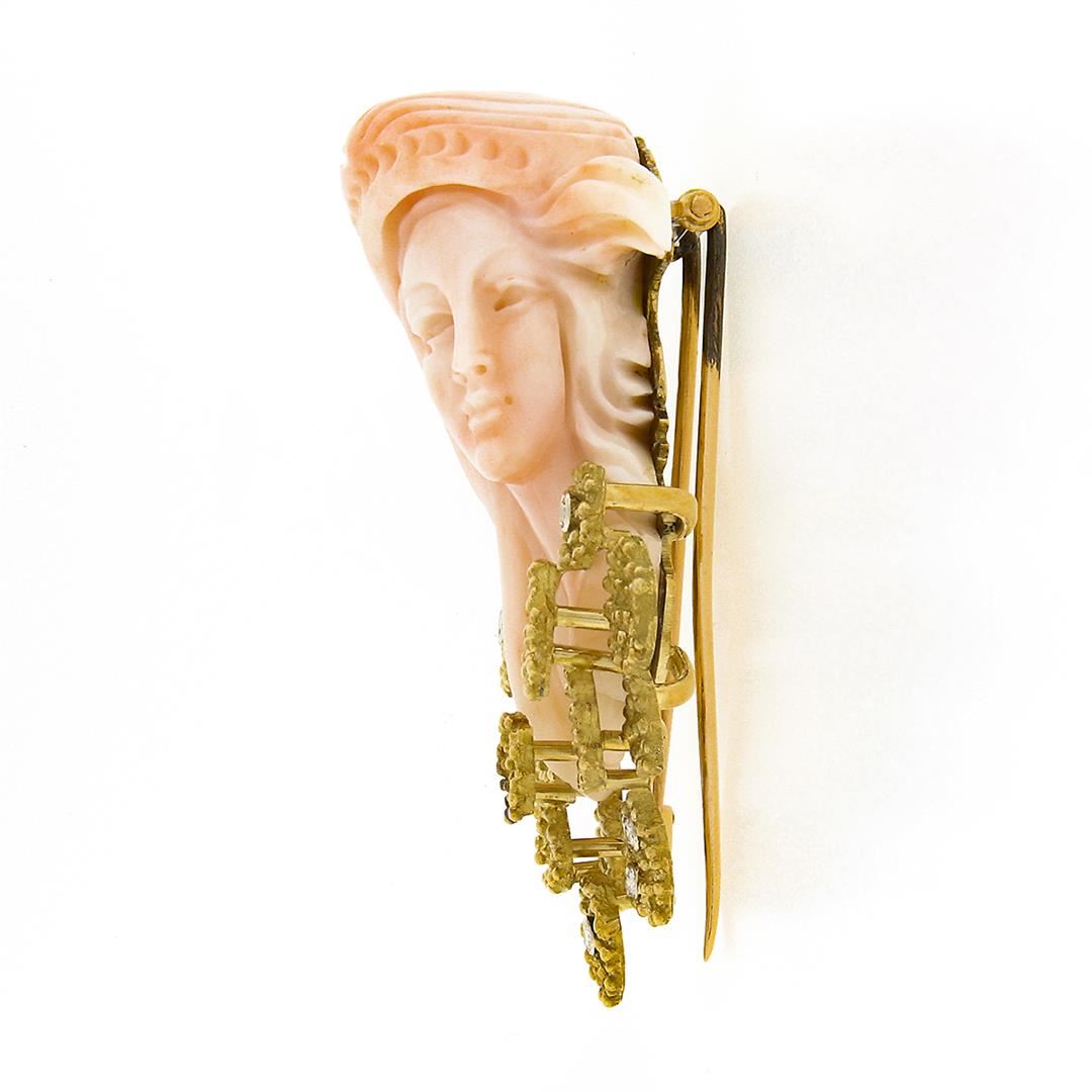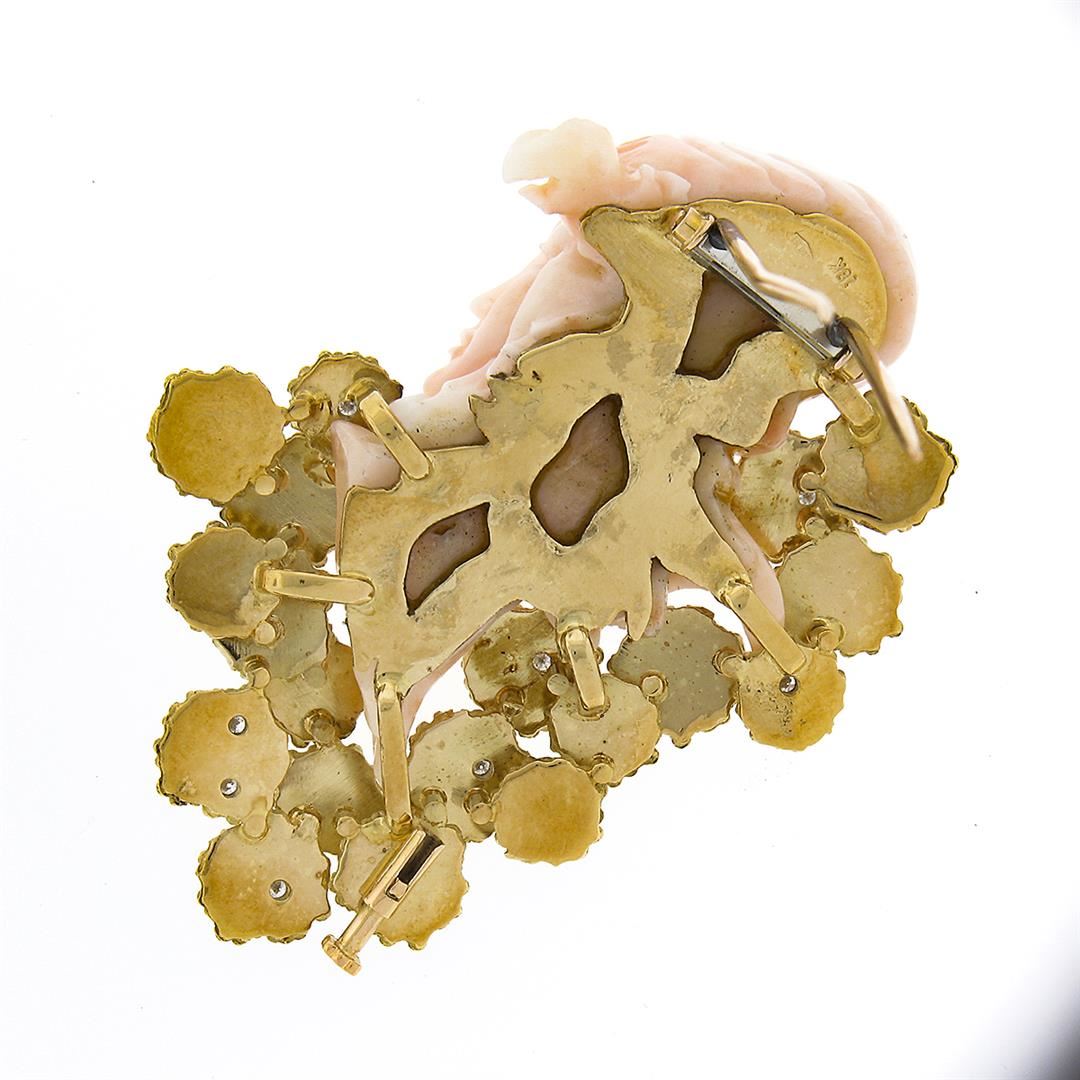 A vintage solid 18k yellow gold brooch, with 1 carved natural coral (47.40x36.0mm), and 8 round brilliant cut natural diamonds (G/H - VS2/SI1 ; 0.24ctw). Measures 61.70x46.10mm and weighs a total of 45.56 grams.