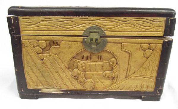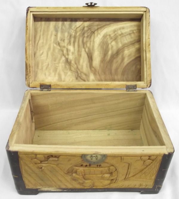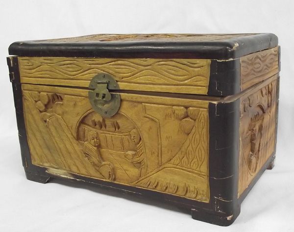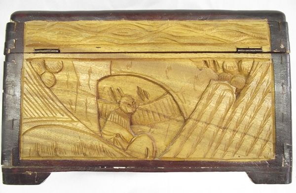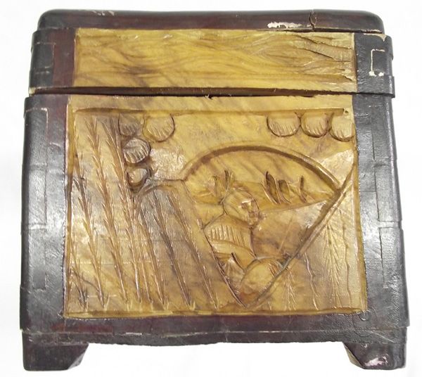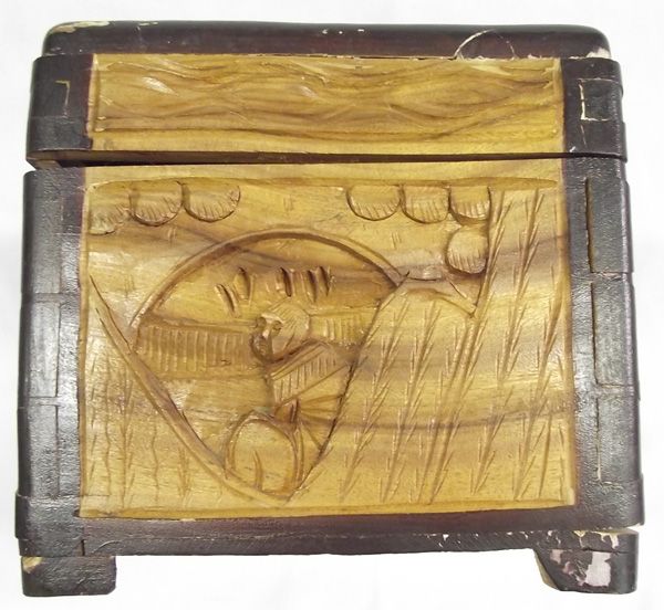 Vintage Carved Wood Storage Box. Solid wood with carvings on top and all sides. Measures 7''H x 11.5''W x 7.5''D.